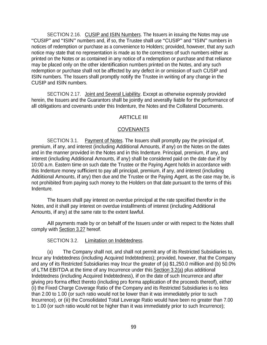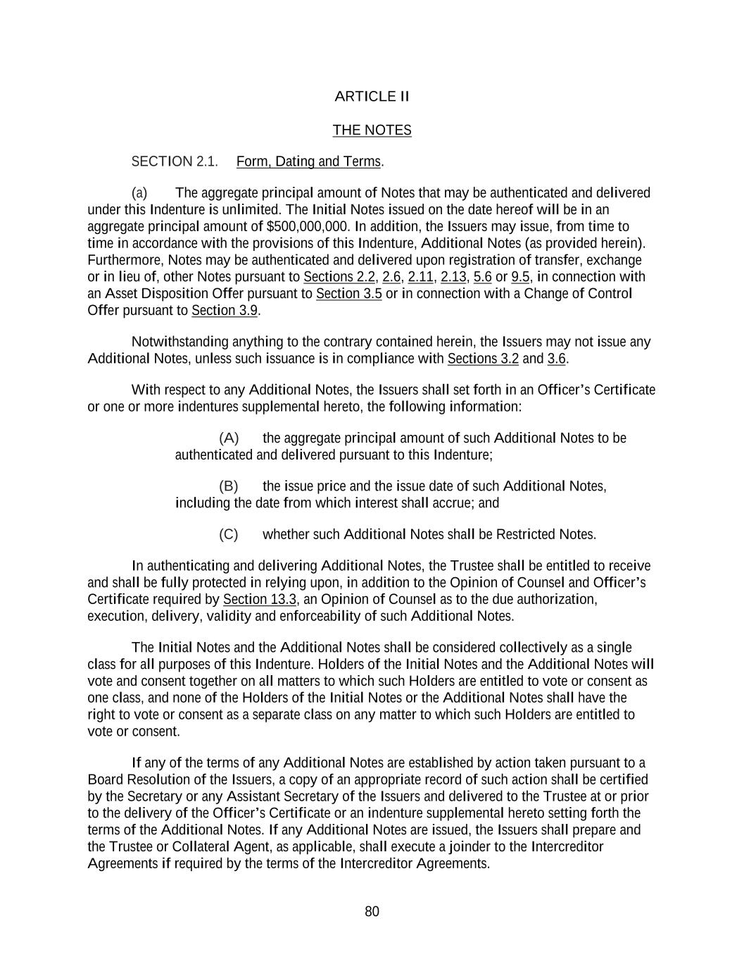 80 ARTICLE II THE NOTES SECTION 2.1. Form, Dating and Terms. (a) The aggregate principal amount of Notes that may be authenticated and delivered under this Indenture is unlimited. The Initial Notes issued on the date hereof will be in an aggregate principal amount of $500,000,000. In addition, the Issuers may issue, from time to time in accordance with the provisions of this Indenture, Additional Notes (as provided herein). Furthermore, Notes may be authenticated and delivered upon registration of transfer, exchange or in lieu of, other Notes pursuant to Sections 2.2, 2.6, 2.11, 2.13, 5.6 or 9.5, in connection with an Asset Disposition Offer pursuant to Section 3.5 or in connection with a Change of Control Offer pursuant to Section 3.9. Notwithstanding anything to the contrary contained herein, the Issuers may not issue any Additional Notes, unless such issuance is in compliance with Sections 3.2 and 3.6. With respect to any Additional Notes, the Issuers shall set forth in an Officer’s Certificate or one or more indentures supplemental hereto, the following information: (A) the aggregate principal amount of such Additional Notes to be authenticated and delivered pursuant to this Indenture; (B) the issue price and the issue date of such Additional Notes, including the date from which interest shall accrue; and (C) whether such Additional Notes shall be Restricted Notes. In authenticating and delivering Additional Notes, the Trustee shall be entitled to receive and shall be fully protected in relying upon, in addition to the Opinion of Counsel and Officer’s Certificate required by Section 13.3, an Opinion of Counsel as to the due authorization, execution, delivery, validity and enforceability of such Additional Notes. The Initial Notes and the Additional Notes shall be considered collectively as a single class for all purposes of this Indenture. Holders of the Initial Notes and the Additional Notes will vote and consent together on all matters to which such Holders are entitled to vote or consent as one class, and none of the Holders of the Initial Notes or the Additional Notes shall have the right to vote or consent as a separate class on any matter to which such Holders are entitled to vote or consent. If any of the terms of any Additional Notes are established by action taken pursuant to a Board Resolution of the Issuers, a copy of an appropriate record of such action shall be certified by the Secretary or any Assistant Secretary of the Issuers and delivered to the Trustee at or prior to the delivery of the Officer’s Certificate or an indenture supplemental hereto setting forth the terms of the Additional Notes. If any Additional Notes are issued, the Issuers shall prepare and the Trustee or Collateral Agent, as applicable, shall execute a joinder to the Intercreditor Agreements if required by the terms of the Intercreditor Agreements.