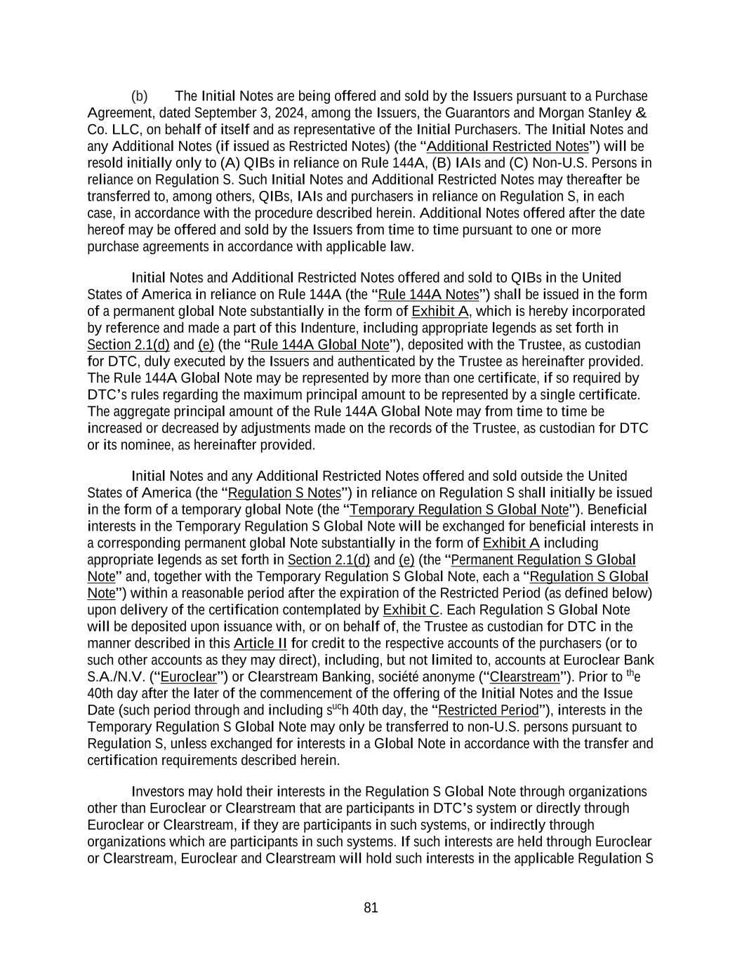 81 (b) The Initial Notes are being offered and sold by the Issuers pursuant to a Purchase Agreement, dated September 3, 2024, among the Issuers, the Guarantors and Morgan Stanley & Co. LLC, on behalf of itself and as representative of the Initial Purchasers. The Initial Notes and any Additional Notes (if issued as Restricted Notes) (the “Additional Restricted Notes”) will be resold initially only to (A) QIBs in reliance on Rule 144A, (B) IAIs and (C) Non-U.S. Persons in reliance on Regulation S. Such Initial Notes and Additional Restricted Notes may thereafter be transferred to, among others, QIBs, IAIs and purchasers in reliance on Regulation S, in each case, in accordance with the procedure described herein. Additional Notes offered after the date hereof may be offered and sold by the Issuers from time to time pursuant to one or more purchase agreements in accordance with applicable law. Initial Notes and Additional Restricted Notes offered and sold to QIBs in the United States of America in reliance on Rule 144A (the “Rule 144A Notes”) shall be issued in the form of a permanent global Note substantially in the form of Exhibit A, which is hereby incorporated by reference and made a part of this Indenture, including appropriate legends as set forth in Section 2.1(d) and (e) (the “Rule 144A Global Note”), deposited with the Trustee, as custodian for DTC, duly executed by the Issuers and authenticated by the Trustee as hereinafter provided. The Rule 144A Global Note may be represented by more than one certificate, if so required by DTC’s rules regarding the maximum principal amount to be represented by a single certificate. The aggregate principal amount of the Rule 144A Global Note may from time to time be increased or decreased by adjustments made on the records of the Trustee, as custodian for DTC or its nominee, as hereinafter provided. Initial Notes and any Additional Restricted Notes offered and sold outside the United States of America (the “Regulation S Notes”) in reliance on Regulation S shall initially be issued in the form of a temporary global Note (the “Temporary Regulation S Global Note”). Beneficial interests in the Temporary Regulation S Global Note will be exchanged for beneficial interests in a corresponding permanent global Note substantially in the form of Exhibit A including appropriate legends as set forth in Section 2.1(d) and (e) (the “Permanent Regulation S Global Note” and, together with the Temporary Regulation S Global Note, each a “Regulation S Global Note”) within a reasonable period after the expiration of the Restricted Period (as defined below) upon delivery of the certification contemplated by Exhibit C. Each Regulation S Global Note will be deposited upon issuance with, or on behalf of, the Trustee as custodian for DTC in the manner described in this Article II for credit to the respective accounts of the purchasers (or to such other accounts as they may direct), including, but not limited to, accounts at Euroclear Bank S.A./N.V. (“Euroclear”) or Clearstream Banking, société anonyme (“Clearstream”). Prior to the 40th day after the later of the commencement of the offering of the Initial Notes and the Issue Date (such period through and including such 40th day, the “Restricted Period”), interests in the Temporary Regulation S Global Note may only be transferred to non-U.S. persons pursuant to Regulation S, unless exchanged for interests in a Global Note in accordance with the transfer and certification requirements described herein. Investors may hold their interests in the Regulation S Global Note through organizations other than Euroclear or Clearstream that are participants in DTC’s system or directly through Euroclear or Clearstream, if they are participants in such systems, or indirectly through organizations which are participants in such systems. If such interests are held through Euroclear or Clearstream, Euroclear and Clearstream will hold such interests in the applicable Regulation S