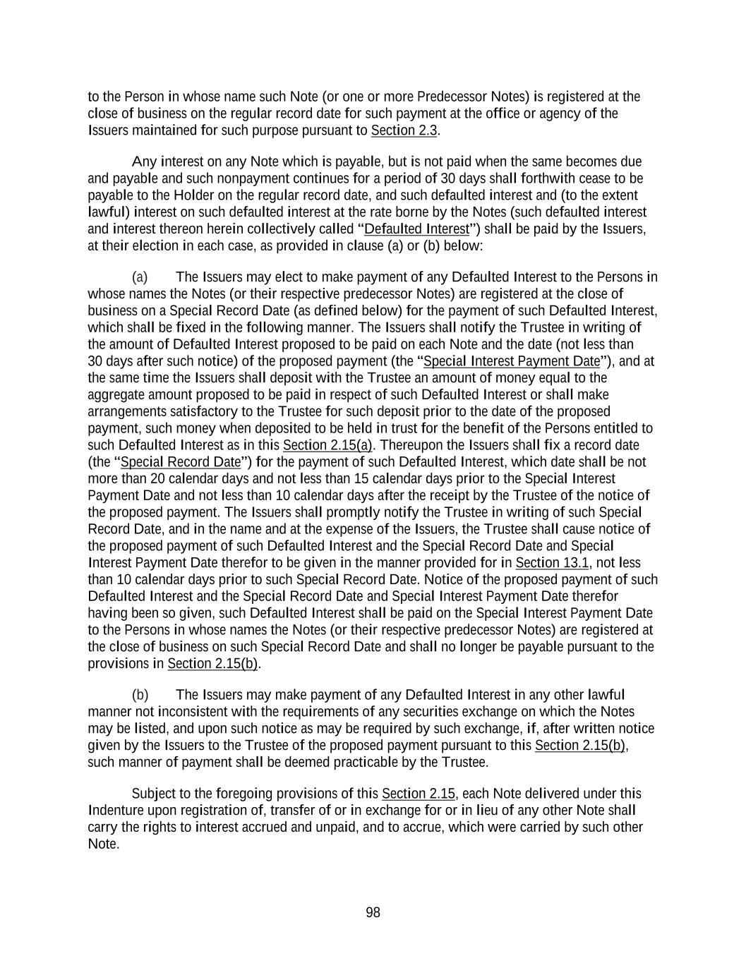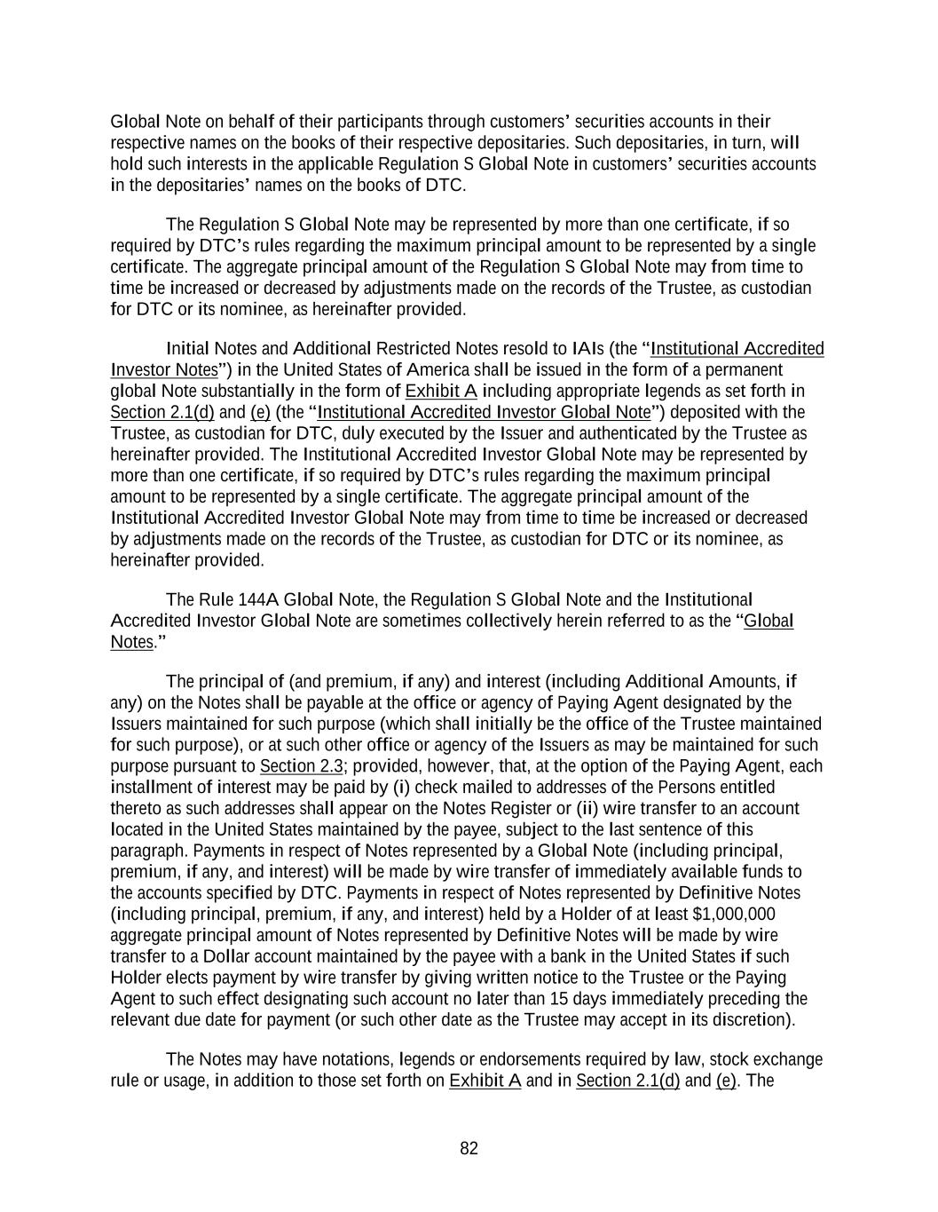 82 Global Note on behalf of their participants through customers’ securities accounts in their respective names on the books of their respective depositaries. Such depositaries, in turn, will hold such interests in the applicable Regulation S Global Note in customers’ securities accounts in the depositaries’ names on the books of DTC. The Regulation S Global Note may be represented by more than one certificate, if so required by DTC’s rules regarding the maximum principal amount to be represented by a single certificate. The aggregate principal amount of the Regulation S Global Note may from time to time be increased or decreased by adjustments made on the records of the Trustee, as custodian for DTC or its nominee, as hereinafter provided. Initial Notes and Additional Restricted Notes resold to IAIs (the “Institutional Accredited Investor Notes”) in the United States of America shall be issued in the form of a permanent global Note substantially in the form of Exhibit A including appropriate legends as set forth in Section 2.1(d) and (e) (the “Institutional Accredited Investor Global Note”) deposited with the Trustee, as custodian for DTC, duly executed by the Issuer and authenticated by the Trustee as hereinafter provided. The Institutional Accredited Investor Global Note may be represented by more than one certificate, if so required by DTC’s rules regarding the maximum principal amount to be represented by a single certificate. The aggregate principal amount of the Institutional Accredited Investor Global Note may from time to time be increased or decreased by adjustments made on the records of the Trustee, as custodian for DTC or its nominee, as hereinafter provided. The Rule 144A Global Note, the Regulation S Global Note and the Institutional Accredited Investor Global Note are sometimes collectively herein referred to as the “Global Notes.” The principal of (and premium, if any) and interest (including Additional Amounts, if any) on the Notes shall be payable at the office or agency of Paying Agent designated by the Issuers maintained for such purpose (which shall initially be the office of the Trustee maintained for such purpose), or at such other office or agency of the Issuers as may be maintained for such purpose pursuant to Section 2.3; provided, however, that, at the option of the Paying Agent, each installment of interest may be paid by (i) check mailed to addresses of the Persons entitled thereto as such addresses shall appear on the Notes Register or (ii) wire transfer to an account located in the United States maintained by the payee, subject to the last sentence of this paragraph. Payments in respect of Notes represented by a Global Note (including principal, premium, if any, and interest) will be made by wire transfer of immediately available funds to the accounts specified by DTC. Payments in respect of Notes represented by Definitive Notes (including principal, premium, if any, and interest) held by a Holder of at least $1,000,000 aggregate principal amount of Notes represented by Definitive Notes will be made by wire transfer to a Dollar account maintained by the payee with a bank in the United States if such Holder elects payment by wire transfer by giving written notice to the Trustee or the Paying Agent to such effect designating such account no later than 15 days immediately preceding the relevant due date for payment (or such other date as the Trustee may accept in its discretion). The Notes may have notations, legends or endorsements required by law, stock exchange rule or usage, in addition to those set forth on Exhibit A and in Section 2.1(d) and (e). The