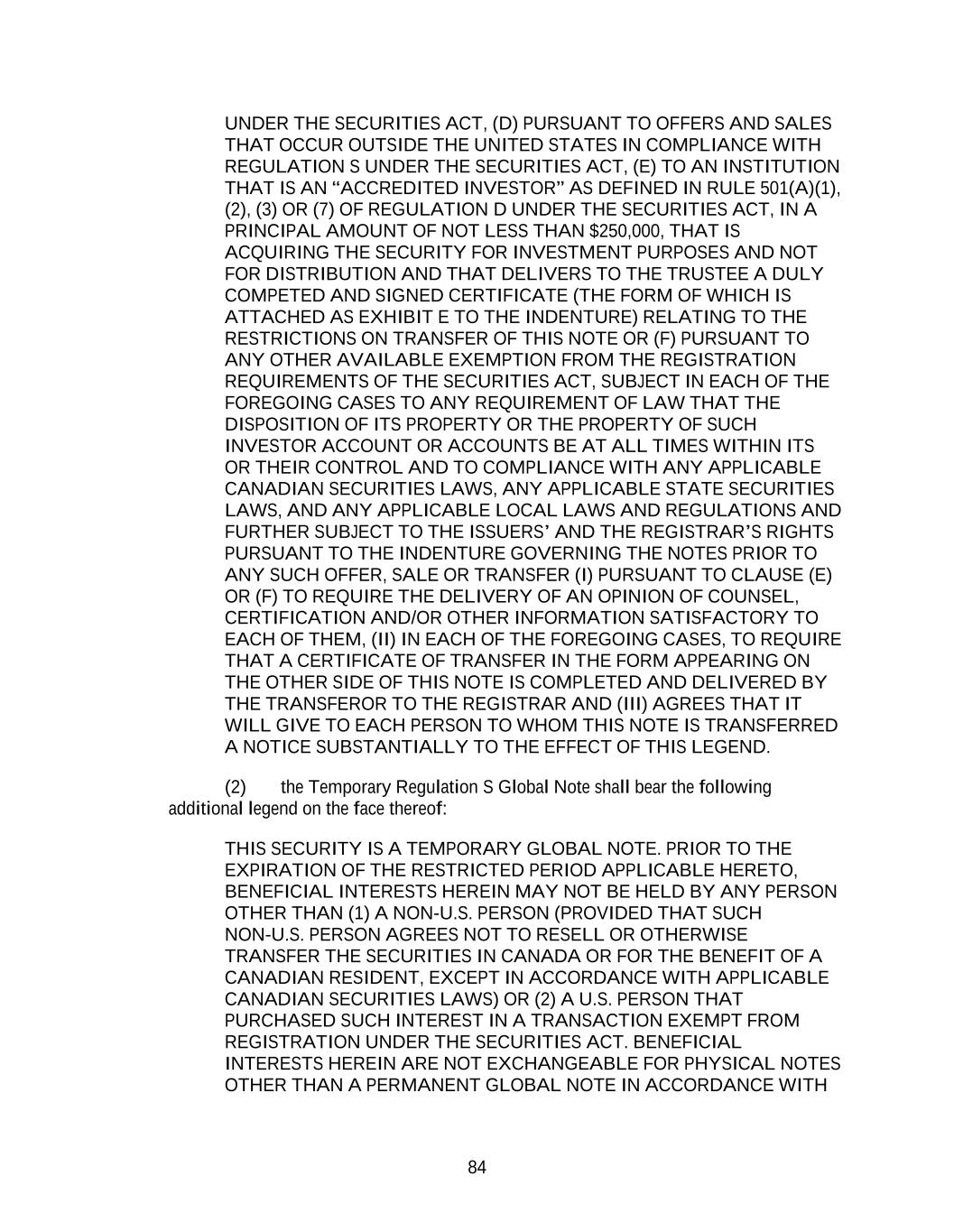 84 UNDER THE SECURITIES ACT, (D) PURSUANT TO OFFERS AND SALES THAT OCCUR OUTSIDE THE UNITED STATES IN COMPLIANCE WITH REGULATION S UNDER THE SECURITIES ACT, (E) TO AN INSTITUTION THAT IS AN “ACCREDITED INVESTOR” AS DEFINED IN RULE 501(A)(1), (2), (3) OR (7) OF REGULATION D UNDER THE SECURITIES ACT, IN A PRINCIPAL AMOUNT OF NOT LESS THAN $250,000, THAT IS ACQUIRING THE SECURITY FOR INVESTMENT PURPOSES AND NOT FOR DISTRIBUTION AND THAT DELIVERS TO THE TRUSTEE A DULY COMPETED AND SIGNED CERTIFICATE (THE FORM OF WHICH IS ATTACHED AS EXHIBIT E TO THE INDENTURE) RELATING TO THE RESTRICTIONS ON TRANSFER OF THIS NOTE OR (F) PURSUANT TO ANY OTHER AVAILABLE EXEMPTION FROM THE REGISTRATION REQUIREMENTS OF THE SECURITIES ACT, SUBJECT IN EACH OF THE FOREGOING CASES TO ANY REQUIREMENT OF LAW THAT THE DISPOSITION OF ITS PROPERTY OR THE PROPERTY OF SUCH INVESTOR ACCOUNT OR ACCOUNTS BE AT ALL TIMES WITHIN ITS OR THEIR CONTROL AND TO COMPLIANCE WITH ANY APPLICABLE CANADIAN SECURITIES LAWS, ANY APPLICABLE STATE SECURITIES LAWS, AND ANY APPLICABLE LOCAL LAWS AND REGULATIONS AND FURTHER SUBJECT TO THE ISSUERS’ AND THE REGISTRAR’S RIGHTS PURSUANT TO THE INDENTURE GOVERNING THE NOTES PRIOR TO ANY SUCH OFFER, SALE OR TRANSFER (I) PURSUANT TO CLAUSE (E) OR (F) TO REQUIRE THE DELIVERY OF AN OPINION OF COUNSEL, CERTIFICATION AND/OR OTHER INFORMATION SATISFACTORY TO EACH OF THEM, (II) IN EACH OF THE FOREGOING CASES, TO REQUIRE THAT A CERTIFICATE OF TRANSFER IN THE FORM APPEARING ON THE OTHER SIDE OF THIS NOTE IS COMPLETED AND DELIVERED BY THE TRANSFEROR TO THE REGISTRAR AND (III) AGREES THAT IT WILL GIVE TO EACH PERSON TO WHOM THIS NOTE IS TRANSFERRED A NOTICE SUBSTANTIALLY TO THE EFFECT OF THIS LEGEND. (2) the Temporary Regulation S Global Note shall bear the following additional legend on the face thereof: THIS SECURITY IS A TEMPORARY GLOBAL NOTE. PRIOR TO THE EXPIRATION OF THE RESTRICTED PERIOD APPLICABLE HERETO, BENEFICIAL INTERESTS HEREIN MAY NOT BE HELD BY ANY PERSON OTHER THAN (1) A NON-U.S. PERSON (PROVIDED THAT SUCH NON-U.S. PERSON AGREES NOT TO RESELL OR OTHERWISE TRANSFER THE SECURITIES IN CANADA OR FOR THE BENEFIT OF A CANADIAN RESIDENT, EXCEPT IN ACCORDANCE WITH APPLICABLE CANADIAN SECURITIES LAWS) OR (2) A U.S. PERSON THAT PURCHASED SUCH INTEREST IN A TRANSACTION EXEMPT FROM REGISTRATION UNDER THE SECURITIES ACT. BENEFICIAL INTERESTS HEREIN ARE NOT EXCHANGEABLE FOR PHYSICAL NOTES OTHER THAN A PERMANENT GLOBAL NOTE IN ACCORDANCE WITH