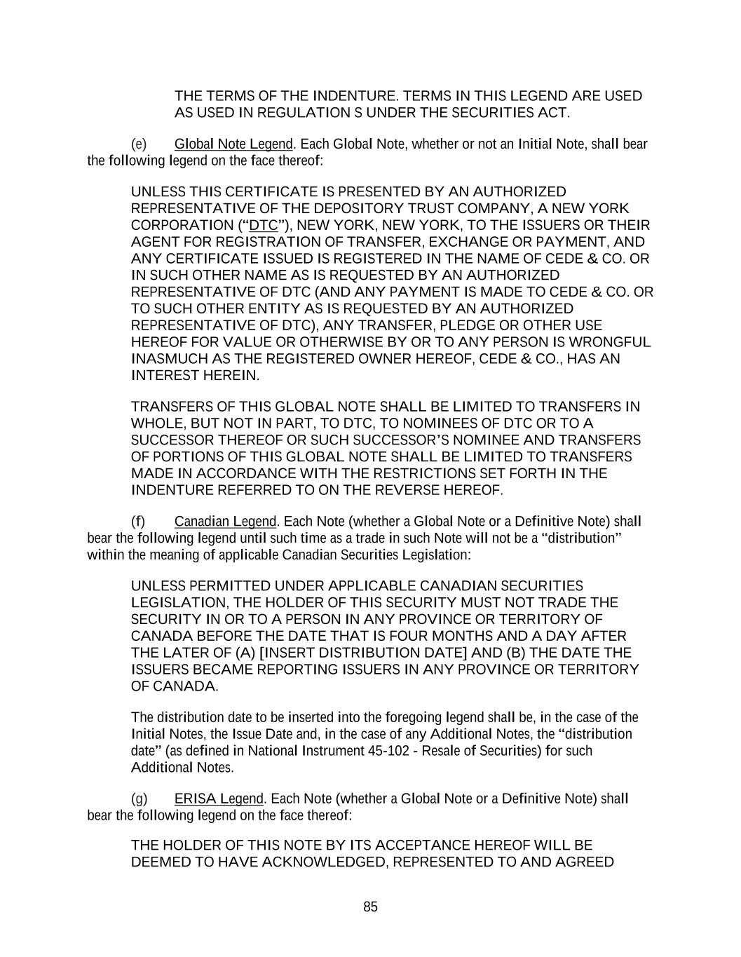 85 THE TERMS OF THE INDENTURE. TERMS IN THIS LEGEND ARE USED AS USED IN REGULATION S UNDER THE SECURITIES ACT. (e) Global Note Legend. Each Global Note, whether or not an Initial Note, shall bear the following legend on the face thereof: UNLESS THIS CERTIFICATE IS PRESENTED BY AN AUTHORIZED REPRESENTATIVE OF THE DEPOSITORY TRUST COMPANY, A NEW YORK CORPORATION (“DTC”), NEW YORK, NEW YORK, TO THE ISSUERS OR THEIR AGENT FOR REGISTRATION OF TRANSFER, EXCHANGE OR PAYMENT, AND ANY CERTIFICATE ISSUED IS REGISTERED IN THE NAME OF CEDE & CO. OR IN SUCH OTHER NAME AS IS REQUESTED BY AN AUTHORIZED REPRESENTATIVE OF DTC (AND ANY PAYMENT IS MADE TO CEDE & CO. OR TO SUCH OTHER ENTITY AS IS REQUESTED BY AN AUTHORIZED REPRESENTATIVE OF DTC), ANY TRANSFER, PLEDGE OR OTHER USE HEREOF FOR VALUE OR OTHERWISE BY OR TO ANY PERSON IS WRONGFUL INASMUCH AS THE REGISTERED OWNER HEREOF, CEDE & CO., HAS AN INTEREST HEREIN. TRANSFERS OF THIS GLOBAL NOTE SHALL BE LIMITED TO TRANSFERS IN WHOLE, BUT NOT IN PART, TO DTC, TO NOMINEES OF DTC OR TO A SUCCESSOR THEREOF OR SUCH SUCCESSOR’S NOMINEE AND TRANSFERS OF PORTIONS OF THIS GLOBAL NOTE SHALL BE LIMITED TO TRANSFERS MADE IN ACCORDANCE WITH THE RESTRICTIONS SET FORTH IN THE INDENTURE REFERRED TO ON THE REVERSE HEREOF. (f) Canadian Legend. Each Note (whether a Global Note or a Definitive Note) shall bear the following legend until such time as a trade in such Note will not be a “distribution” within the meaning of applicable Canadian Securities Legislation: UNLESS PERMITTED UNDER APPLICABLE CANADIAN SECURITIES LEGISLATION, THE HOLDER OF THIS SECURITY MUST NOT TRADE THE SECURITY IN OR TO A PERSON IN ANY PROVINCE OR TERRITORY OF CANADA BEFORE THE DATE THAT IS FOUR MONTHS AND A DAY AFTER THE LATER OF (A) [INSERT DISTRIBUTION DATE] AND (B) THE DATE THE ISSUERS BECAME REPORTING ISSUERS IN ANY PROVINCE OR TERRITORY OF CANADA. The distribution date to be inserted into the foregoing legend shall be, in the case of the Initial Notes, the Issue Date and, in the case of any Additional Notes, the “distribution date” (as defined in National Instrument 45-102 - Resale of Securities) for such Additional Notes. (g) ERISA Legend. Each Note (whether a Global Note or a Definitive Note) shall bear the following legend on the face thereof: THE HOLDER OF THIS NOTE BY ITS ACCEPTANCE HEREOF WILL BE DEEMED TO HAVE ACKNOWLEDGED, REPRESENTED TO AND AGREED