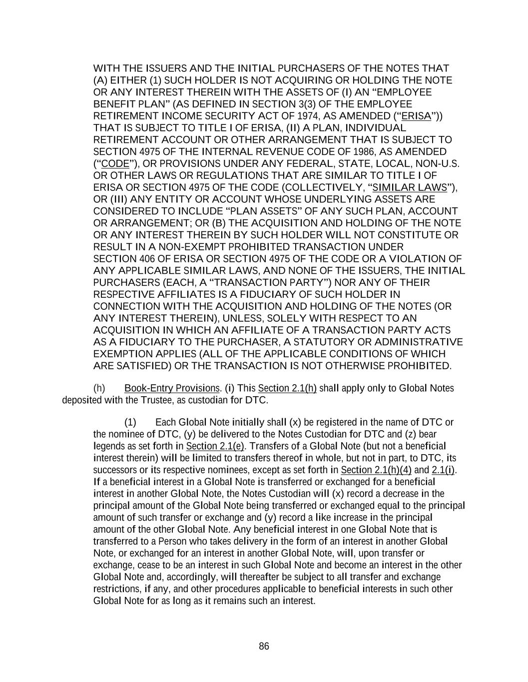 86 WITH THE ISSUERS AND THE INITIAL PURCHASERS OF THE NOTES THAT (A) EITHER (1) SUCH HOLDER IS NOT ACQUIRING OR HOLDING THE NOTE OR ANY INTEREST THEREIN WITH THE ASSETS OF (I) AN “EMPLOYEE BENEFIT PLAN” (AS DEFINED IN SECTION 3(3) OF THE EMPLOYEE RETIREMENT INCOME SECURITY ACT OF 1974, AS AMENDED (“ERISA”)) THAT IS SUBJECT TO TITLE I OF ERISA, (II) A PLAN, INDIVIDUAL RETIREMENT ACCOUNT OR OTHER ARRANGEMENT THAT IS SUBJECT TO SECTION 4975 OF THE INTERNAL REVENUE CODE OF 1986, AS AMENDED (“CODE”), OR PROVISIONS UNDER ANY FEDERAL, STATE, LOCAL, NON-U.S. OR OTHER LAWS OR REGULATIONS THAT ARE SIMILAR TO TITLE I OF ERISA OR SECTION 4975 OF THE CODE (COLLECTIVELY, “SIMILAR LAWS”), OR (III) ANY ENTITY OR ACCOUNT WHOSE UNDERLYING ASSETS ARE CONSIDERED TO INCLUDE “PLAN ASSETS” OF ANY SUCH PLAN, ACCOUNT OR ARRANGEMENT; OR (B) THE ACQUISITION AND HOLDING OF THE NOTE OR ANY INTEREST THEREIN BY SUCH HOLDER WILL NOT CONSTITUTE OR RESULT IN A NON-EXEMPT PROHIBITED TRANSACTION UNDER SECTION 406 OF ERISA OR SECTION 4975 OF THE CODE OR A VIOLATION OF ANY APPLICABLE SIMILAR LAWS, AND NONE OF THE ISSUERS, THE INITIAL PURCHASERS (EACH, A “TRANSACTION PARTY”) NOR ANY OF THEIR RESPECTIVE AFFILIATES IS A FIDUCIARY OF SUCH HOLDER IN CONNECTION WITH THE ACQUISITION AND HOLDING OF THE NOTES (OR ANY INTEREST THEREIN), UNLESS, SOLELY WITH RESPECT TO AN ACQUISITION IN WHICH AN AFFILIATE OF A TRANSACTION PARTY ACTS AS A FIDUCIARY TO THE PURCHASER, A STATUTORY OR ADMINISTRATIVE EXEMPTION APPLIES (ALL OF THE APPLICABLE CONDITIONS OF WHICH ARE SATISFIED) OR THE TRANSACTION IS NOT OTHERWISE PROHIBITED. (h) Book-Entry Provisions. (i) This Section 2.1(h) shall apply only to Global Notes deposited with the Trustee, as custodian for DTC. (1) Each Global Note initially shall (x) be registered in the name of DTC or the nominee of DTC, (y) be delivered to the Notes Custodian for DTC and (z) bear legends as set forth in Section 2.1(e). Transfers of a Global Note (but not a beneficial interest therein) will be limited to transfers thereof in whole, but not in part, to DTC, its successors or its respective nominees, except as set forth in Section 2.1(h)(4) and 2.1(i). If a beneficial interest in a Global Note is transferred or exchanged for a beneficial interest in another Global Note, the Notes Custodian will (x) record a decrease in the principal amount of the Global Note being transferred or exchanged equal to the principal amount of such transfer or exchange and (y) record a like increase in the principal amount of the other Global Note. Any beneficial interest in one Global Note that is transferred to a Person who takes delivery in the form of an interest in another Global Note, or exchanged for an interest in another Global Note, will, upon transfer or exchange, cease to be an interest in such Global Note and become an interest in the other Global Note and, accordingly, will thereafter be subject to all transfer and exchange restrictions, if any, and other procedures applicable to beneficial interests in such other Global Note for as long as it remains such an interest.