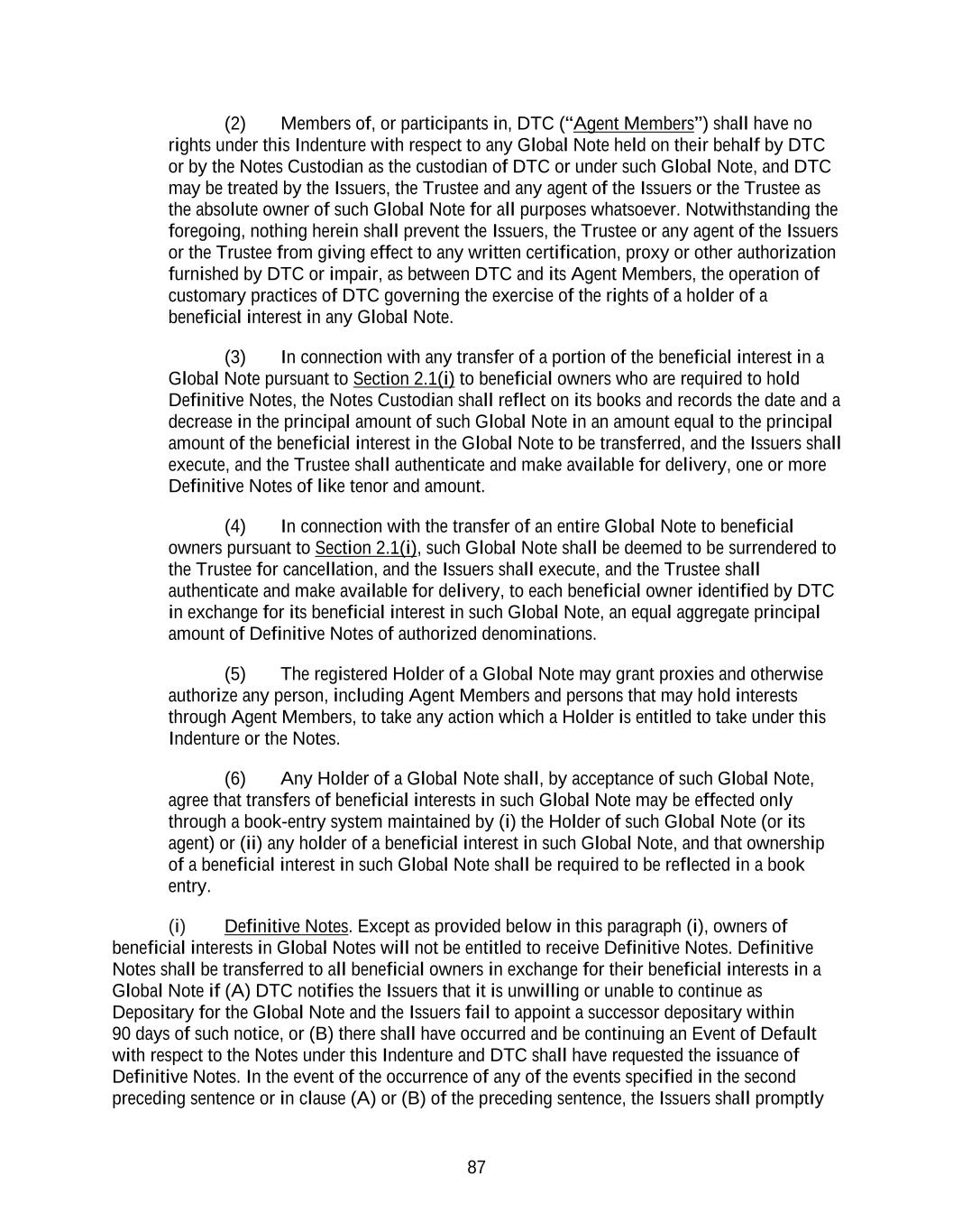 87 (2) Members of, or participants in, DTC (“Agent Members”) shall have no rights under this Indenture with respect to any Global Note held on their behalf by DTC or by the Notes Custodian as the custodian of DTC or under such Global Note, and DTC may be treated by the Issuers, the Trustee and any agent of the Issuers or the Trustee as the absolute owner of such Global Note for all purposes whatsoever. Notwithstanding the foregoing, nothing herein shall prevent the Issuers, the Trustee or any agent of the Issuers or the Trustee from giving effect to any written certification, proxy or other authorization furnished by DTC or impair, as between DTC and its Agent Members, the operation of customary practices of DTC governing the exercise of the rights of a holder of a beneficial interest in any Global Note. (3) In connection with any transfer of a portion of the beneficial interest in a Global Note pursuant to Section 2.1(i) to beneficial owners who are required to hold Definitive Notes, the Notes Custodian shall reflect on its books and records the date and a decrease in the principal amount of such Global Note in an amount equal to the principal amount of the beneficial interest in the Global Note to be transferred, and the Issuers shall execute, and the Trustee shall authenticate and make available for delivery, one or more Definitive Notes of like tenor and amount. (4) In connection with the transfer of an entire Global Note to beneficial owners pursuant to Section 2.1(i), such Global Note shall be deemed to be surrendered to the Trustee for cancellation, and the Issuers shall execute, and the Trustee shall authenticate and make available for delivery, to each beneficial owner identified by DTC in exchange for its beneficial interest in such Global Note, an equal aggregate principal amount of Definitive Notes of authorized denominations. (5) The registered Holder of a Global Note may grant proxies and otherwise authorize any person, including Agent Members and persons that may hold interests through Agent Members, to take any action which a Holder is entitled to take under this Indenture or the Notes. (6) Any Holder of a Global Note shall, by acceptance of such Global Note, agree that transfers of beneficial interests in such Global Note may be effected only through a book-entry system maintained by (i) the Holder of such Global Note (or its agent) or (ii) any holder of a beneficial interest in such Global Note, and that ownership of a beneficial interest in such Global Note shall be required to be reflected in a book entry. (i) Definitive Notes. Except as provided below in this paragraph (i), owners of beneficial interests in Global Notes will not be entitled to receive Definitive Notes. Definitive Notes shall be transferred to all beneficial owners in exchange for their beneficial interests in a Global Note if (A) DTC notifies the Issuers that it is unwilling or unable to continue as Depositary for the Global Note and the Issuers fail to appoint a successor depositary within 90 days of such notice, or (B) there shall have occurred and be continuing an Event of Default with respect to the Notes under this Indenture and DTC shall have requested the issuance of Definitive Notes. In the event of the occurrence of any of the events specified in the second preceding sentence or in clause (A) or (B) of the preceding sentence, the Issuers shall promptly