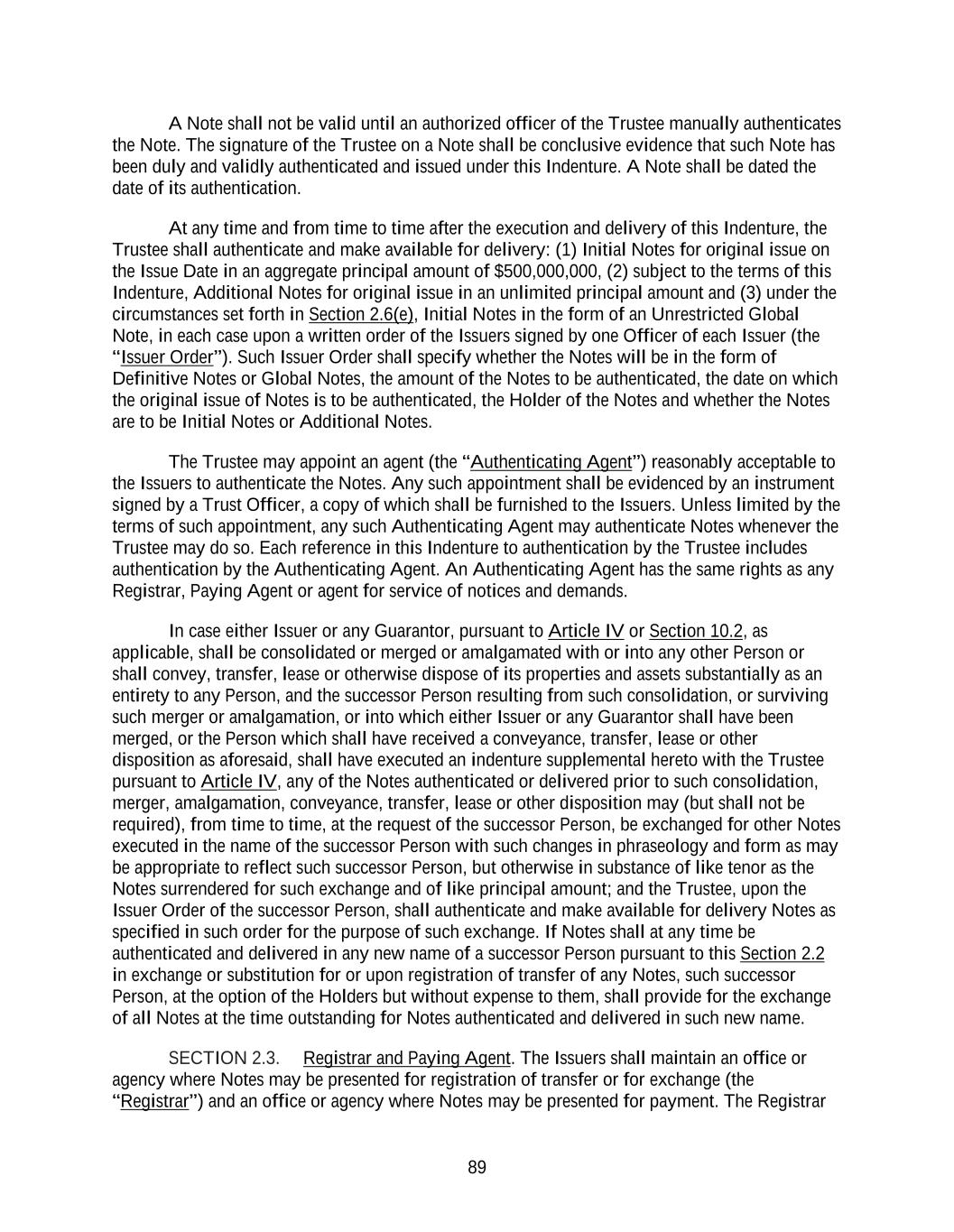 89 A Note shall not be valid until an authorized officer of the Trustee manually authenticates the Note. The signature of the Trustee on a Note shall be conclusive evidence that such Note has been duly and validly authenticated and issued under this Indenture. A Note shall be dated the date of its authentication. At any time and from time to time after the execution and delivery of this Indenture, the Trustee shall authenticate and make available for delivery: (1) Initial Notes for original issue on the Issue Date in an aggregate principal amount of $500,000,000, (2) subject to the terms of this Indenture, Additional Notes for original issue in an unlimited principal amount and (3) under the circumstances set forth in Section 2.6(e), Initial Notes in the form of an Unrestricted Global Note, in each case upon a written order of the Issuers signed by one Officer of each Issuer (the “Issuer Order”). Such Issuer Order shall specify whether the Notes will be in the form of Definitive Notes or Global Notes, the amount of the Notes to be authenticated, the date on which the original issue of Notes is to be authenticated, the Holder of the Notes and whether the Notes are to be Initial Notes or Additional Notes. The Trustee may appoint an agent (the “Authenticating Agent”) reasonably acceptable to the Issuers to authenticate the Notes. Any such appointment shall be evidenced by an instrument signed by a Trust Officer, a copy of which shall be furnished to the Issuers. Unless limited by the terms of such appointment, any such Authenticating Agent may authenticate Notes whenever the Trustee may do so. Each reference in this Indenture to authentication by the Trustee includes authentication by the Authenticating Agent. An Authenticating Agent has the same rights as any Registrar, Paying Agent or agent for service of notices and demands. In case either Issuer or any Guarantor, pursuant to Article IV or Section 10.2, as applicable, shall be consolidated or merged or amalgamated with or into any other Person or shall convey, transfer, lease or otherwise dispose of its properties and assets substantially as an entirety to any Person, and the successor Person resulting from such consolidation, or surviving such merger or amalgamation, or into which either Issuer or any Guarantor shall have been merged, or the Person which shall have received a conveyance, transfer, lease or other disposition as aforesaid, shall have executed an indenture supplemental hereto with the Trustee pursuant to Article IV, any of the Notes authenticated or delivered prior to such consolidation, merger, amalgamation, conveyance, transfer, lease or other disposition may (but shall not be required), from time to time, at the request of the successor Person, be exchanged for other Notes executed in the name of the successor Person with such changes in phraseology and form as may be appropriate to reflect such successor Person, but otherwise in substance of like tenor as the Notes surrendered for such exchange and of like principal amount; and the Trustee, upon the Issuer Order of the successor Person, shall authenticate and make available for delivery Notes as specified in such order for the purpose of such exchange. If Notes shall at any time be authenticated and delivered in any new name of a successor Person pursuant to this Section 2.2 in exchange or substitution for or upon registration of transfer of any Notes, such successor Person, at the option of the Holders but without expense to them, shall provide for the exchange of all Notes at the time outstanding for Notes authenticated and delivered in such new name. SECTION 2.3. Registrar and Paying Agent. The Issuers shall maintain an office or agency where Notes may be presented for registration of transfer or for exchange (the “Registrar”) and an office or agency where Notes may be presented for payment. The Registrar