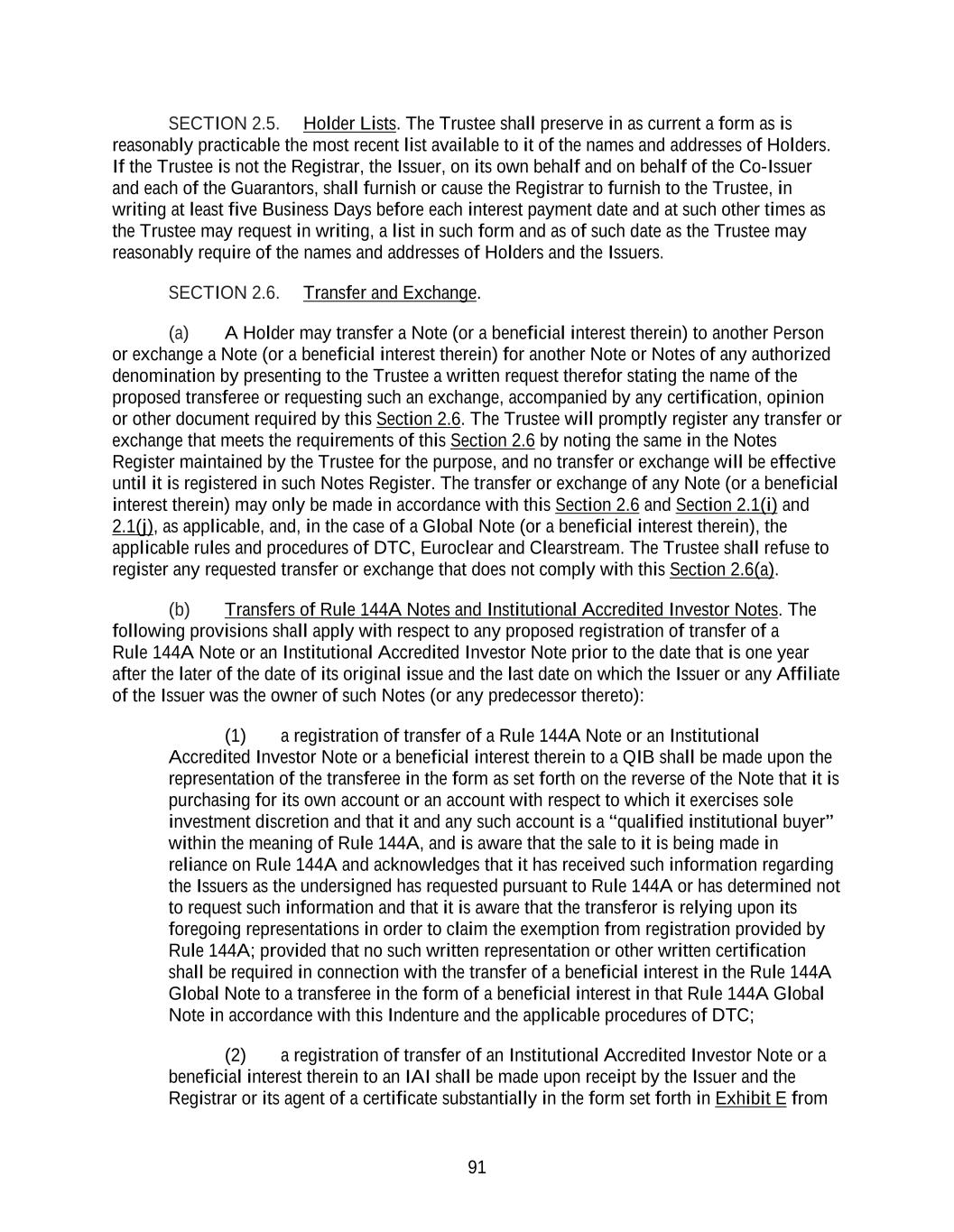 91 SECTION 2.5. Holder Lists. The Trustee shall preserve in as current a form as is reasonably practicable the most recent list available to it of the names and addresses of Holders. If the Trustee is not the Registrar, the Issuer, on its own behalf and on behalf of the Co-Issuer and each of the Guarantors, shall furnish or cause the Registrar to furnish to the Trustee, in writing at least five Business Days before each interest payment date and at such other times as the Trustee may request in writing, a list in such form and as of such date as the Trustee may reasonably require of the names and addresses of Holders and the Issuers. SECTION 2.6. Transfer and Exchange. (a) A Holder may transfer a Note (or a beneficial interest therein) to another Person or exchange a Note (or a beneficial interest therein) for another Note or Notes of any authorized denomination by presenting to the Trustee a written request therefor stating the name of the proposed transferee or requesting such an exchange, accompanied by any certification, opinion or other document required by this Section 2.6. The Trustee will promptly register any transfer or exchange that meets the requirements of this Section 2.6 by noting the same in the Notes Register maintained by the Trustee for the purpose, and no transfer or exchange will be effective until it is registered in such Notes Register. The transfer or exchange of any Note (or a beneficial interest therein) may only be made in accordance with this Section 2.6 and Section 2.1(i) and 2.1(j), as applicable, and, in the case of a Global Note (or a beneficial interest therein), the applicable rules and procedures of DTC, Euroclear and Clearstream. The Trustee shall refuse to register any requested transfer or exchange that does not comply with this Section 2.6(a). (b) Transfers of Rule 144A Notes and Institutional Accredited Investor Notes. The following provisions shall apply with respect to any proposed registration of transfer of a Rule 144A Note or an Institutional Accredited Investor Note prior to the date that is one year after the later of the date of its original issue and the last date on which the Issuer or any Affiliate of the Issuer was the owner of such Notes (or any predecessor thereto): (1) a registration of transfer of a Rule 144A Note or an Institutional Accredited Investor Note or a beneficial interest therein to a QIB shall be made upon the representation of the transferee in the form as set forth on the reverse of the Note that it is purchasing for its own account or an account with respect to which it exercises sole investment discretion and that it and any such account is a “qualified institutional buyer” within the meaning of Rule 144A, and is aware that the sale to it is being made in reliance on Rule 144A and acknowledges that it has received such information regarding the Issuers as the undersigned has requested pursuant to Rule 144A or has determined not to request such information and that it is aware that the transferor is relying upon its foregoing representations in order to claim the exemption from registration provided by Rule 144A; provided that no such written representation or other written certification shall be required in connection with the transfer of a beneficial interest in the Rule 144A Global Note to a transferee in the form of a beneficial interest in that Rule 144A Global Note in accordance with this Indenture and the applicable procedures of DTC; (2) a registration of transfer of an Institutional Accredited Investor Note or a beneficial interest therein to an IAI shall be made upon receipt by the Issuer and the Registrar or its agent of a certificate substantially in the form set forth in Exhibit E from