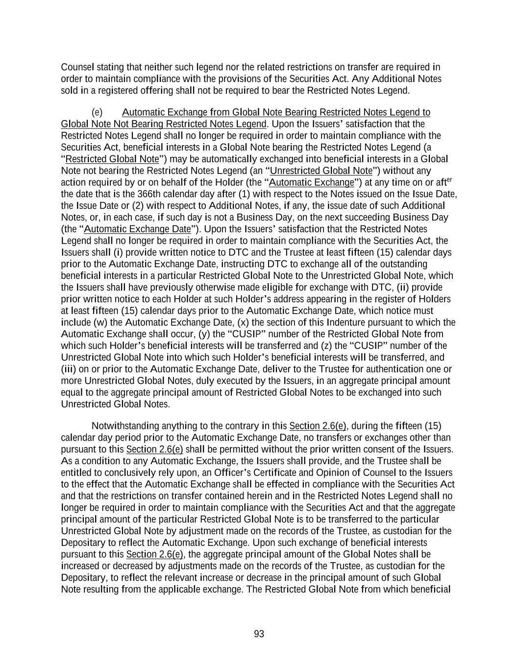 93 Counsel stating that neither such legend nor the related restrictions on transfer are required in order to maintain compliance with the provisions of the Securities Act. Any Additional Notes sold in a registered offering shall not be required to bear the Restricted Notes Legend. (e) Automatic Exchange from Global Note Bearing Restricted Notes Legend to Global Note Not Bearing Restricted Notes Legend. Upon the Issuers’ satisfaction that the Restricted Notes Legend shall no longer be required in order to maintain compliance with the Securities Act, beneficial interests in a Global Note bearing the Restricted Notes Legend (a “Restricted Global Note”) may be automatically exchanged into beneficial interests in a Global Note not bearing the Restricted Notes Legend (an “Unrestricted Global Note”) without any action required by or on behalf of the Holder (the “Automatic Exchange”) at any time on or after the date that is the 366th calendar day after (1) with respect to the Notes issued on the Issue Date, the Issue Date or (2) with respect to Additional Notes, if any, the issue date of such Additional Notes, or, in each case, if such day is not a Business Day, on the next succeeding Business Day (the “Automatic Exchange Date”). Upon the Issuers’ satisfaction that the Restricted Notes Legend shall no longer be required in order to maintain compliance with the Securities Act, the Issuers shall (i) provide written notice to DTC and the Trustee at least fifteen (15) calendar days prior to the Automatic Exchange Date, instructing DTC to exchange all of the outstanding beneficial interests in a particular Restricted Global Note to the Unrestricted Global Note, which the Issuers shall have previously otherwise made eligible for exchange with DTC, (ii) provide prior written notice to each Holder at such Holder’s address appearing in the register of Holders at least fifteen (15) calendar days prior to the Automatic Exchange Date, which notice must include (w) the Automatic Exchange Date, (x) the section of this Indenture pursuant to which the Automatic Exchange shall occur, (y) the “CUSIP” number of the Restricted Global Note from which such Holder’s beneficial interests will be transferred and (z) the “CUSIP” number of the Unrestricted Global Note into which such Holder’s beneficial interests will be transferred, and (iii) on or prior to the Automatic Exchange Date, deliver to the Trustee for authentication one or more Unrestricted Global Notes, duly executed by the Issuers, in an aggregate principal amount equal to the aggregate principal amount of Restricted Global Notes to be exchanged into such Unrestricted Global Notes. Notwithstanding anything to the contrary in this Section 2.6(e), during the fifteen (15) calendar day period prior to the Automatic Exchange Date, no transfers or exchanges other than pursuant to this Section 2.6(e) shall be permitted without the prior written consent of the Issuers. As a condition to any Automatic Exchange, the Issuers shall provide, and the Trustee shall be entitled to conclusively rely upon, an Officer’s Certificate and Opinion of Counsel to the Issuers to the effect that the Automatic Exchange shall be effected in compliance with the Securities Act and that the restrictions on transfer contained herein and in the Restricted Notes Legend shall no longer be required in order to maintain compliance with the Securities Act and that the aggregate principal amount of the particular Restricted Global Note is to be transferred to the particular Unrestricted Global Note by adjustment made on the records of the Trustee, as custodian for the Depositary to reflect the Automatic Exchange. Upon such exchange of beneficial interests pursuant to this Section 2.6(e), the aggregate principal amount of the Global Notes shall be increased or decreased by adjustments made on the records of the Trustee, as custodian for the Depositary, to reflect the relevant increase or decrease in the principal amount of such Global Note resulting from the applicable exchange. The Restricted Global Note from which beneficial