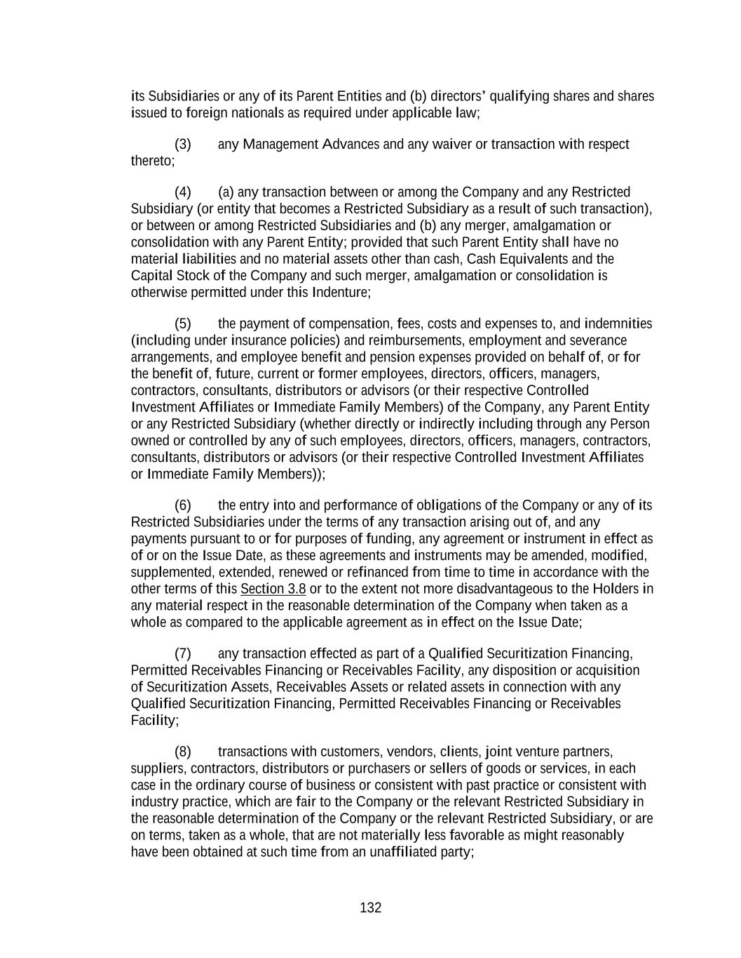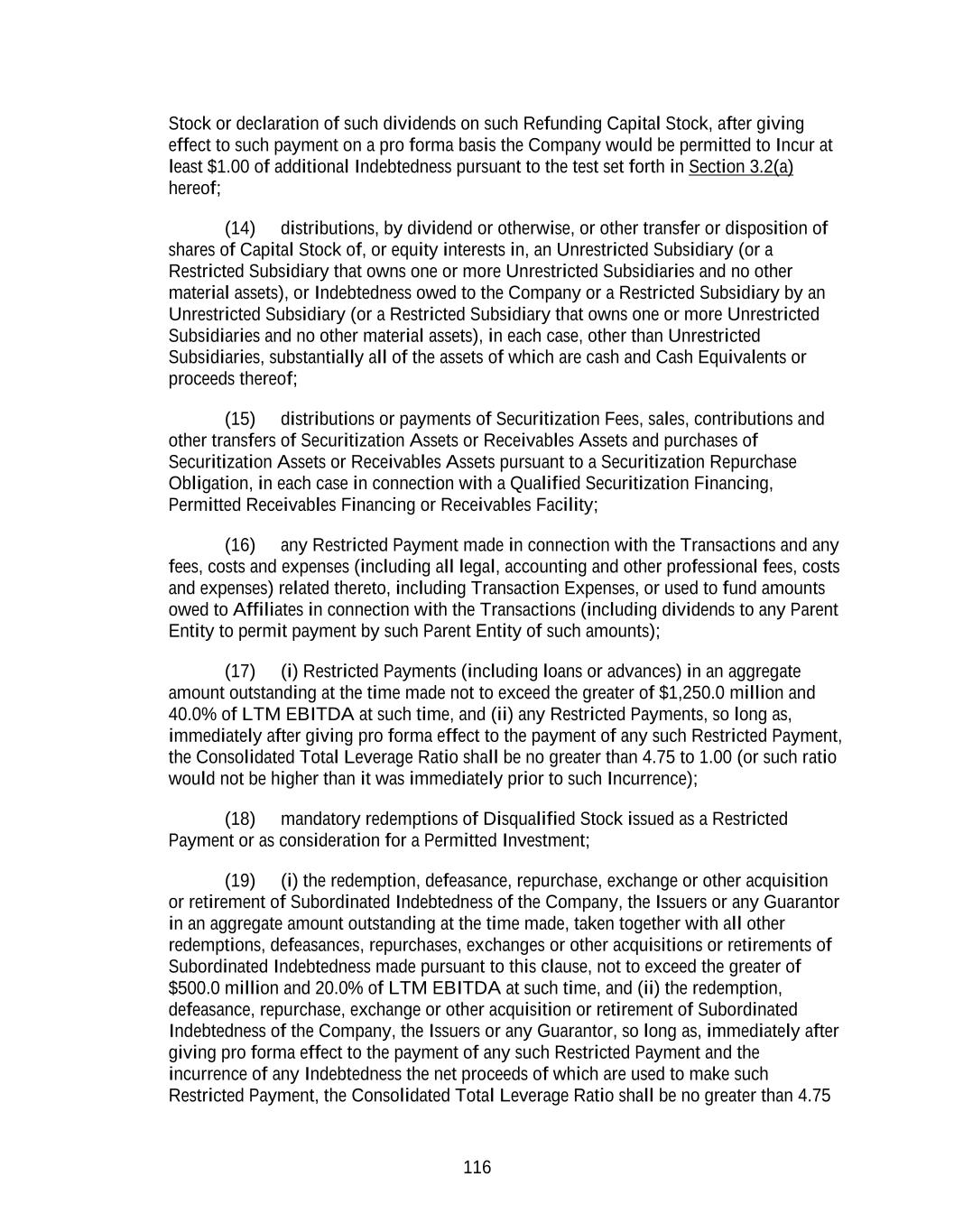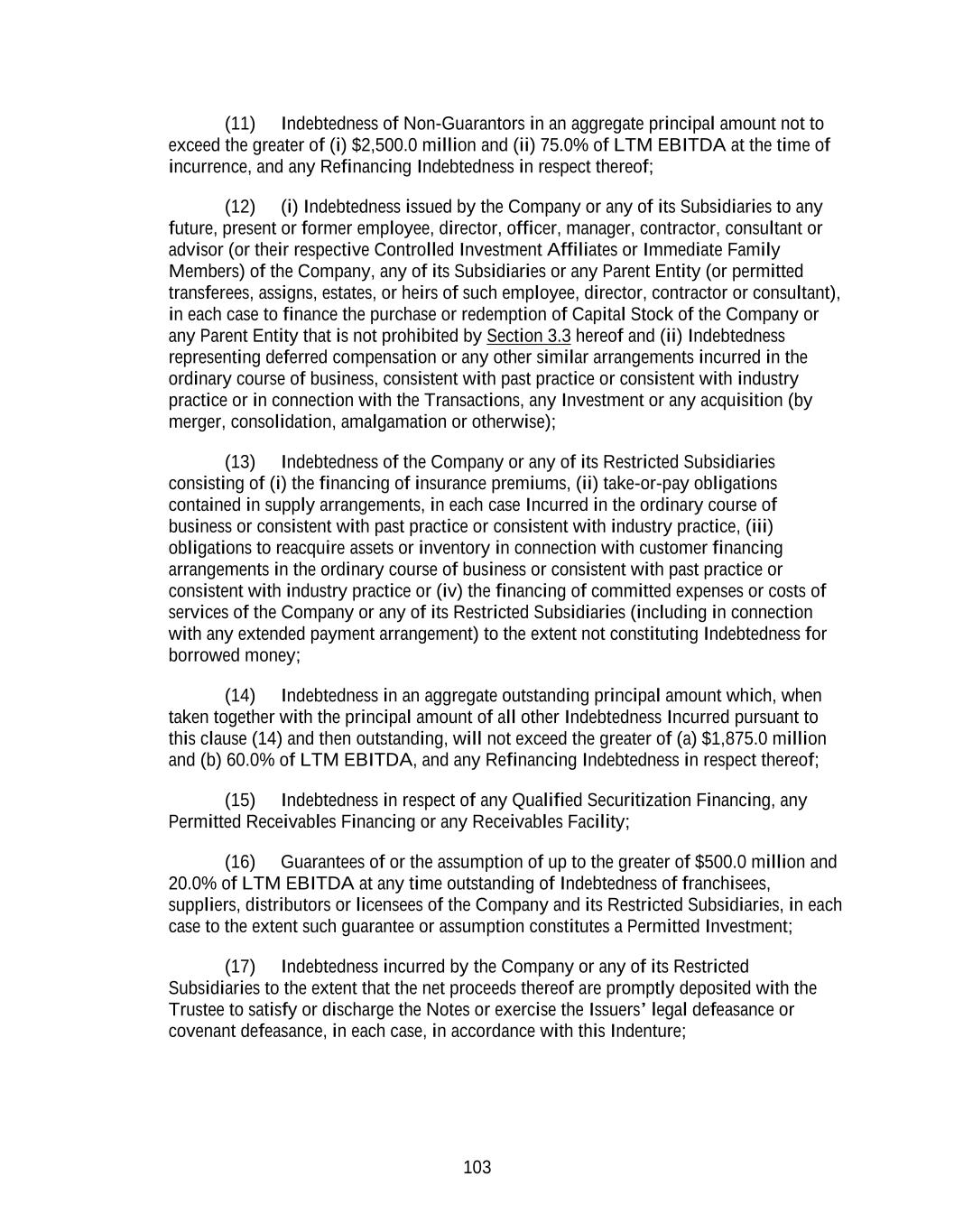 53 (22) additional Investments having an aggregate fair market value, taken together with all other Investments made pursuant to this clause (22) that are at that time outstanding, not to exceed the greater of $1,875.0 million and 50.0% of LTM EBITDA (with the fair market value of each Investment being measured at the time made and without giving effect to subsequent changes in value) plus the amount of any returns (including distributions, dividends, payments, interest, returns of principal, profits on sale, repayments, income or other returns) in respect of such Investments (without duplication for purposes of Section 3.3 of any amounts applied pursuant to Section 3.3(a)(iii)); provided that if such Investment is in Capital Stock of a Person that subsequently becomes the Company or a Restricted Subsidiary, such Investment shall thereafter be deemed permitted under clause (1) or (2) above and shall not be included as having been made pursuant to this clause (22); (23) any Investment in a Similar Business having an aggregate fair market value, taken together with all other Investments made pursuant to this clause that are at that time outstanding, not to exceed the greater of $1,250.0 million and 50.0% of LTM EBITDA (with the fair market value of each Investment being measured at the time made and without giving effect to subsequent changes in value), plus the amount of any returns (including dividends, payments, interest, distributions, returns of principal, profits on sale, repayments, income and similar amounts) in respect of such Investments (without duplication for purposes of Section 3.3 of any amounts applied pursuant to Section 3.3(a)(iii) hereof) with the fair market value of each Investment being measured at the time made and without giving effect to subsequent changes in value; provided, however, that if any Investment pursuant to this clause is made in any Person that is not the Company or a Restricted Subsidiary at the date of the making of such Investment and such Person becomes the Company or a Restricted Subsidiary after such date, such Investment shall thereafter be deemed to have been made pursuant to clause (1) or (2) above and shall cease to have been made pursuant to this clause; (24) (i) Investments arising in connection with a Qualified Securitization Financing, Permitted Receivable Financing or Receivables Facility and (ii) distributions or payments of Securitization Fees and purchases or acquisitions of Securitization Assets or Receivables Assets in connection with a Qualified Securitization Financing, Permitted Receivable Financing or Receivables Facility; (25) Investments in connection with the Transactions; (26) Redemptions or repurchases of Notes and Existing Notes; (27) Investments by an Unrestricted Subsidiary entered into prior to the day such Unrestricted Subsidiary is redesignated as a Restricted Subsidiary as described under Section 3.20 hereof; (28) Investments consisting of (i) Guarantees of or the assumption of Indebtedness (to the extent permitted by Section 3.2(b)(16) hereof) of, or (ii) loans made to, or the acquisition of loans made to or equity interests in, franchisees, suppliers,