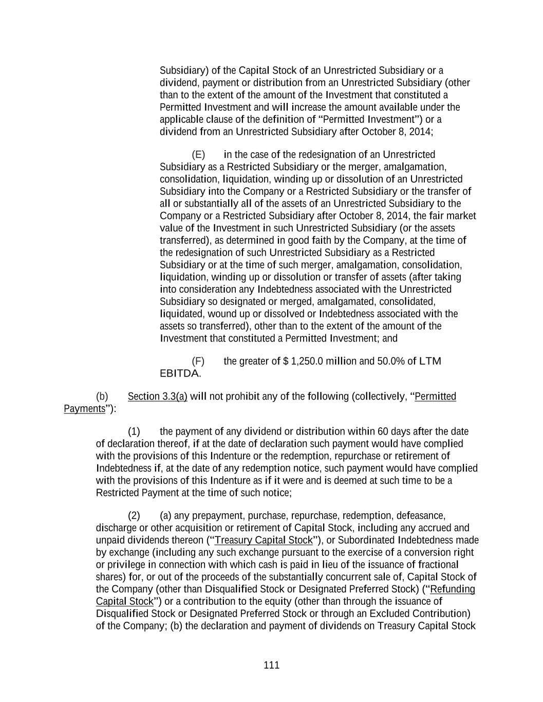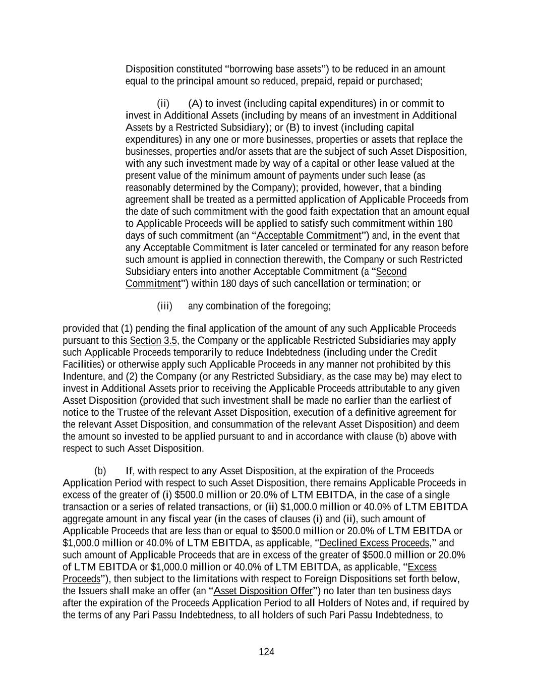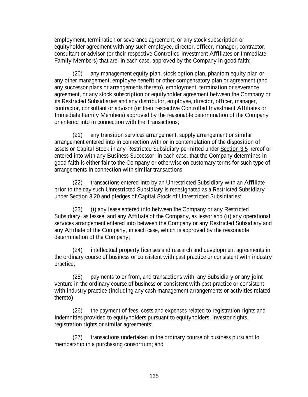 53 (22) additional Investments having an aggregate fair market value, taken together with all other Investments made pursuant to this clause (22) that are at that time outstanding, not to exceed the greater of $1,875.0 million and 50.0% of LTM EBITDA (with the fair market value of each Investment being measured at the time made and without giving effect to subsequent changes in value) plus the amount of any returns (including distributions, dividends, payments, interest, returns of principal, profits on sale, repayments, income or other returns) in respect of such Investments (without duplication for purposes of Section 3.3 of any amounts applied pursuant to Section 3.3(a)(iii)); provided that if such Investment is in Capital Stock of a Person that subsequently becomes the Company or a Restricted Subsidiary, such Investment shall thereafter be deemed permitted under clause (1) or (2) above and shall not be included as having been made pursuant to this clause (22); (23) any Investment in a Similar Business having an aggregate fair market value, taken together with all other Investments made pursuant to this clause that are at that time outstanding, not to exceed the greater of $1,250.0 million and 50.0% of LTM EBITDA (with the fair market value of each Investment being measured at the time made and without giving effect to subsequent changes in value), plus the amount of any returns (including dividends, payments, interest, distributions, returns of principal, profits on sale, repayments, income and similar amounts) in respect of such Investments (without duplication for purposes of Section 3.3 of any amounts applied pursuant to Section 3.3(a)(iii) hereof) with the fair market value of each Investment being measured at the time made and without giving effect to subsequent changes in value; provided, however, that if any Investment pursuant to this clause is made in any Person that is not the Company or a Restricted Subsidiary at the date of the making of such Investment and such Person becomes the Company or a Restricted Subsidiary after such date, such Investment shall thereafter be deemed to have been made pursuant to clause (1) or (2) above and shall cease to have been made pursuant to this clause; (24) (i) Investments arising in connection with a Qualified Securitization Financing, Permitted Receivable Financing or Receivables Facility and (ii) distributions or payments of Securitization Fees and purchases or acquisitions of Securitization Assets or Receivables Assets in connection with a Qualified Securitization Financing, Permitted Receivable Financing or Receivables Facility; (25) Investments in connection with the Transactions; (26) Redemptions or repurchases of Notes and Existing Notes; (27) Investments by an Unrestricted Subsidiary entered into prior to the day such Unrestricted Subsidiary is redesignated as a Restricted Subsidiary as described under Section 3.20 hereof; (28) Investments consisting of (i) Guarantees of or the assumption of Indebtedness (to the extent permitted by Section 3.2(b)(16) hereof) of, or (ii) loans made to, or the acquisition of loans made to or equity interests in, franchisees, suppliers,