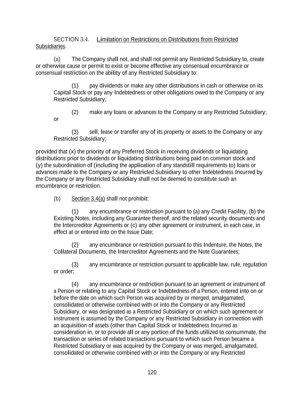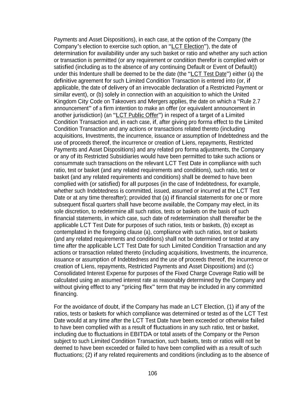 145 (vii) any Lien created, Incurred or assumed during the Suspension Period (or deemed, created, incurred or assumed during the Suspension Period (including with respect to a Limited Condition Transaction entered during the Suspension Period)) shall be deemed to have been outstanding on the Issue Date, so that it is classified as permitted under clause (11) of the definition of “Permitted Liens”; and (viii) any Investment made during the Suspension Period shall be deemed to have been outstanding on the Issue Date, so that it is classified as permitted under clause (9) of the definition of “Permitted Investments.” (e) On and after each Reversion Date, the Company and its Subsidiaries shall be permitted, without causing a Default, Event of Default or breach of any kind under the Notes Documents, to honor, comply with or otherwise perform any contractual commitments or obligations arising during any Suspension Period and to consummate the transactions contemplated thereby (including any Limited Condition Transaction entered into during the Suspension Period). (f) The Trustee shall have no duty to monitor the ratings of the Notes, shall not be deemed to have any knowledge of the ratings of the Notes, whether the Notes achieve Investment Grade Status or the occurrence of a Reversion Date and shall have no duty to notify Holders of any of the foregoing. SECTION 3.20. Designation of Restricted and Unrestricted Subsidiaries. (a) The Company may designate any Restricted Subsidiary to be an Unrestricted Subsidiary (other than the Issuers) if that designation would not cause an Event of Default. If a Restricted Subsidiary (other than the Issuers) is designated as an Unrestricted Subsidiary, the aggregate fair market value of all outstanding Investments owned by the Company and its Restricted Subsidiaries in the Subsidiary designated as an Unrestricted Subsidiary will be deemed to be an Investment made as of the time of the designation and will reduce the amount available for Restricted Payments under Section 3.3 or under one or more clauses of the definition of Permitted Investments, as determined by the Company. That designation will only be permitted if the Investment would be permitted at that time and if the Restricted Subsidiary otherwise meets the definition of an Unrestricted Subsidiary. The Company may redesignate any Unrestricted Subsidiary to be a Restricted Subsidiary if that redesignation would not cause an Event of Default. (b) Any designation of a Subsidiary of the Company as an Unrestricted Subsidiary will be evidenced to the Trustee by an Officer’s Certificate certifying that such designation complies with the preceding conditions and was permitted by Section 3.3. If, at any time, any Unrestricted Subsidiary would fail to meet the preceding requirements as an Unrestricted Subsidiary, it will thereafter cease to be an Unrestricted Subsidiary for purposes of this Indenture and any Indebtedness of such Subsidiary will be deemed to be incurred by a Restricted Subsidiary of the Company as of such date and, if such Indebtedness is not permitted to be incurred as of such date under Section 3.2, the Company will be in default of Section 3.2.