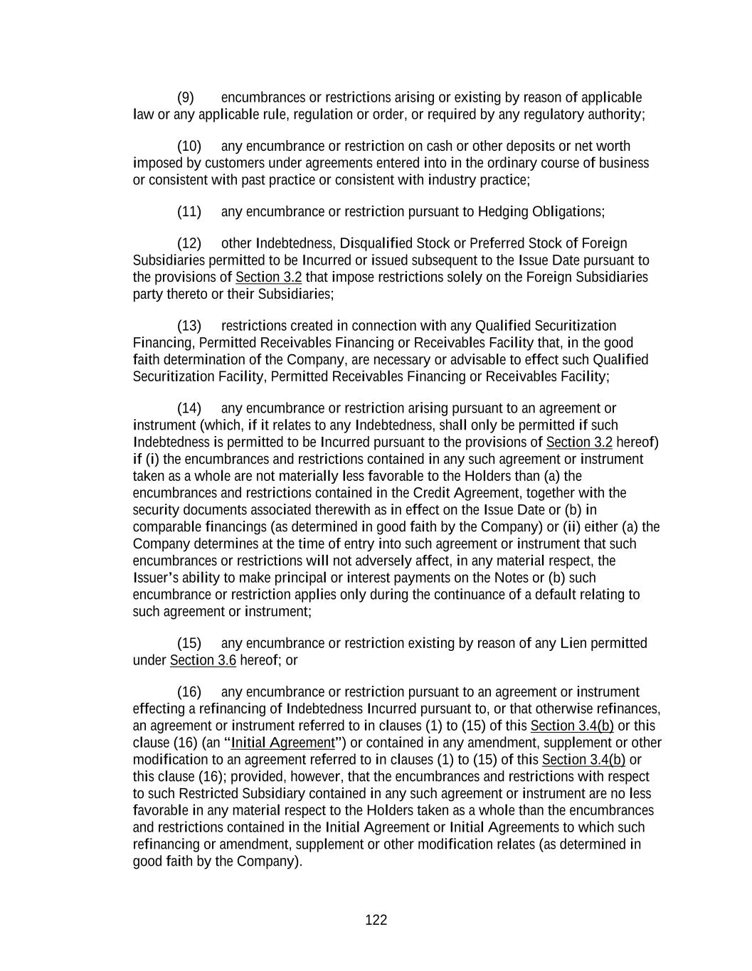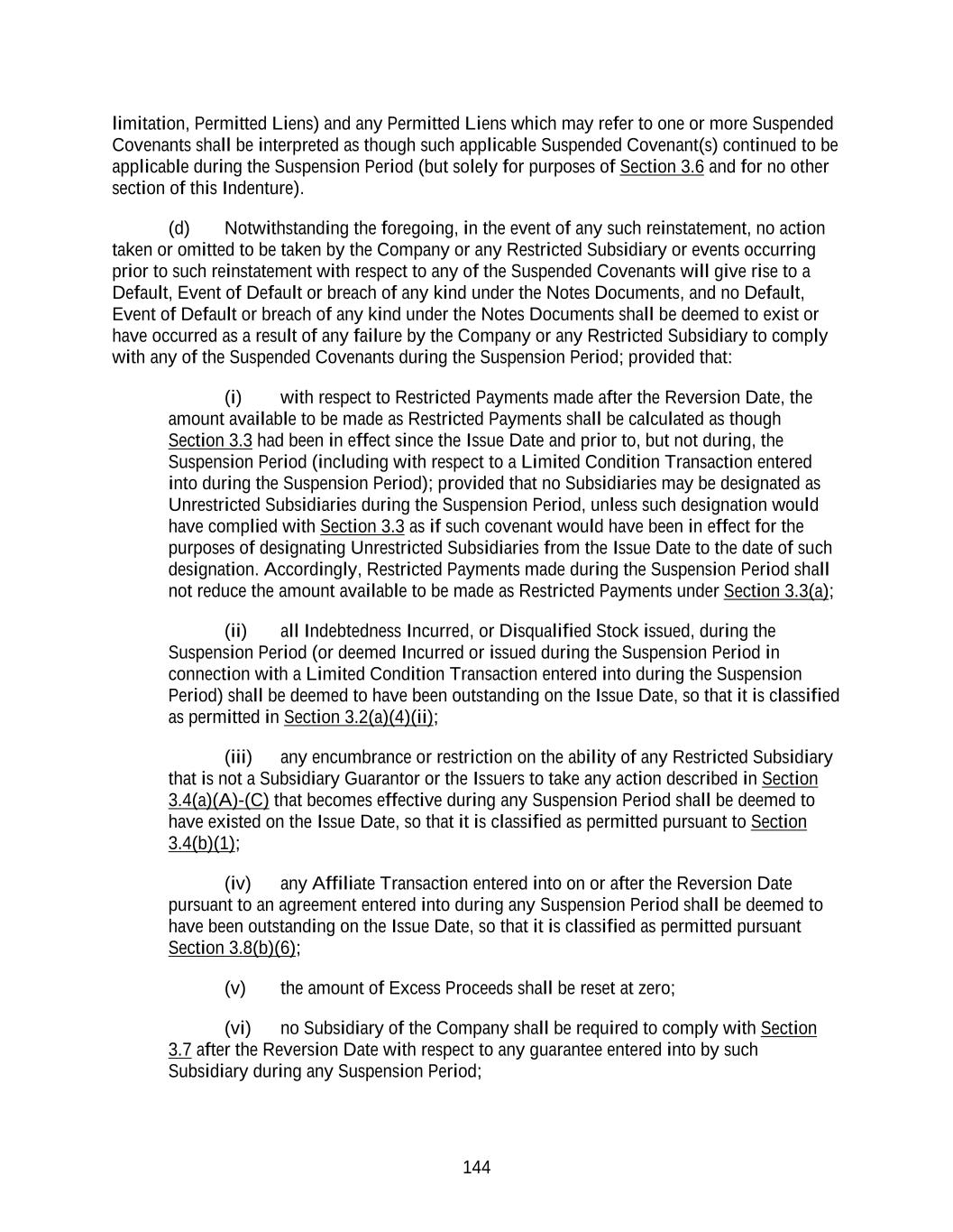 144 limitation, Permitted Liens) and any Permitted Liens which may refer to one or more Suspended Covenants shall be interpreted as though such applicable Suspended Covenant(s) continued to be applicable during the Suspension Period (but solely for purposes of Section 3.6 and for no other section of this Indenture). (d) Notwithstanding the foregoing, in the event of any such reinstatement, no action taken or omitted to be taken by the Company or any Restricted Subsidiary or events occurring prior to such reinstatement with respect to any of the Suspended Covenants will give rise to a Default, Event of Default or breach of any kind under the Notes Documents, and no Default, Event of Default or breach of any kind under the Notes Documents shall be deemed to exist or have occurred as a result of any failure by the Company or any Restricted Subsidiary to comply with any of the Suspended Covenants during the Suspension Period; provided that: (i) with respect to Restricted Payments made after the Reversion Date, the amount available to be made as Restricted Payments shall be calculated as though Section 3.3 had been in effect since the Issue Date and prior to, but not during, the Suspension Period (including with respect to a Limited Condition Transaction entered into during the Suspension Period); provided that no Subsidiaries may be designated as Unrestricted Subsidiaries during the Suspension Period, unless such designation would have complied with Section 3.3 as if such covenant would have been in effect for the purposes of designating Unrestricted Subsidiaries from the Issue Date to the date of such designation. Accordingly, Restricted Payments made during the Suspension Period shall not reduce the amount available to be made as Restricted Payments under Section 3.3(a); (ii) all Indebtedness Incurred, or Disqualified Stock issued, during the Suspension Period (or deemed Incurred or issued during the Suspension Period in connection with a Limited Condition Transaction entered into during the Suspension Period) shall be deemed to have been outstanding on the Issue Date, so that it is classified as permitted in Section 3.2(a)(4)(ii); (iii) any encumbrance or restriction on the ability of any Restricted Subsidiary that is not a Subsidiary Guarantor or the Issuers to take any action described in Section 3.4(a)(A)-(C) that becomes effective during any Suspension Period shall be deemed to have existed on the Issue Date, so that it is classified as permitted pursuant to Section 3.4(b)(1); (iv) any Affiliate Transaction entered into on or after the Reversion Date pursuant to an agreement entered into during any Suspension Period shall be deemed to have been outstanding on the Issue Date, so that it is classified as permitted pursuant Section 3.8(b)(6); (v) the amount of Excess Proceeds shall be reset at zero; (vi) no Subsidiary of the Company shall be required to comply with Section 3.7 after the Reversion Date with respect to any guarantee entered into by such Subsidiary during any Suspension Period;
