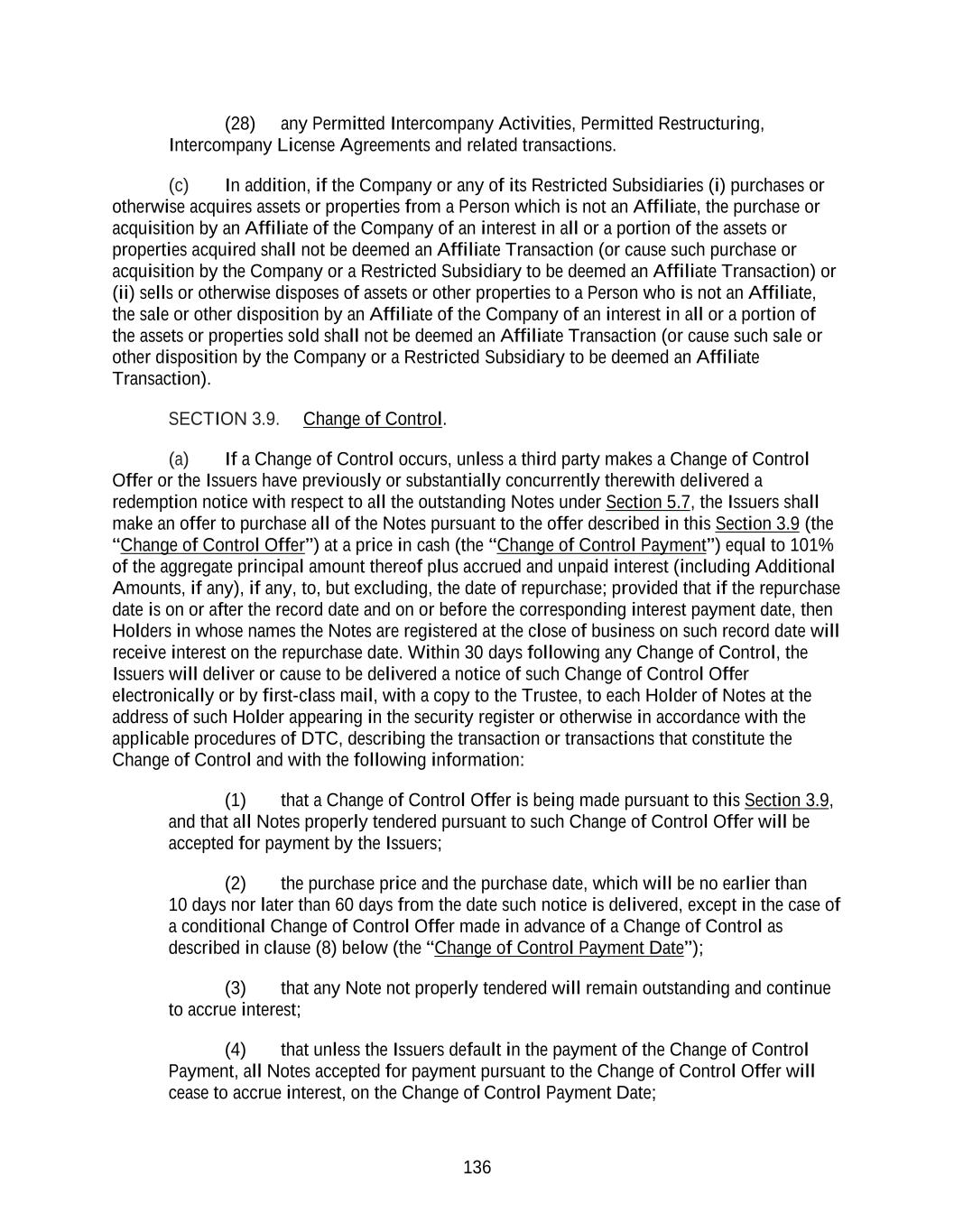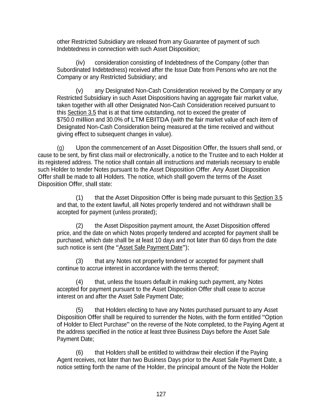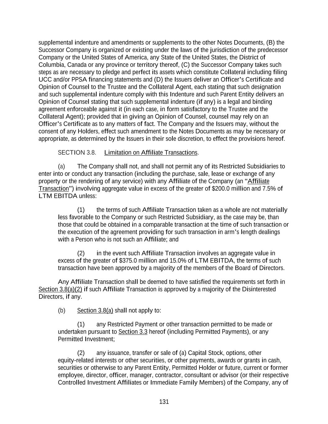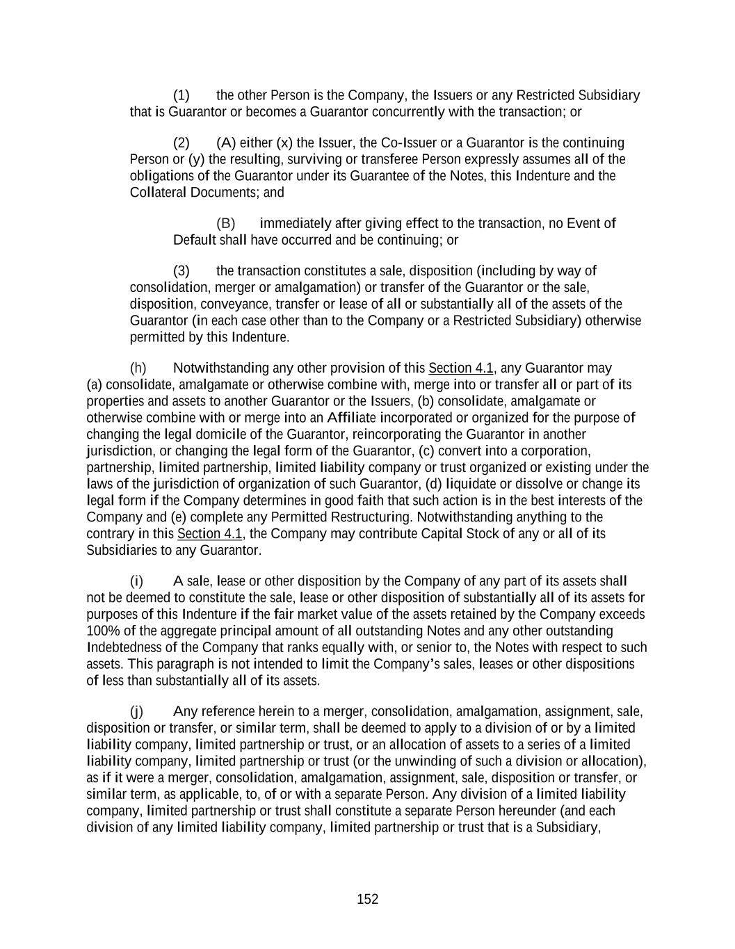 152 (1) the other Person is the Company, the Issuers or any Restricted Subsidiary that is Guarantor or becomes a Guarantor concurrently with the transaction; or (2) (A) either (x) the Issuer, the Co-Issuer or a Guarantor is the continuing Person or (y) the resulting, surviving or transferee Person expressly assumes all of the obligations of the Guarantor under its Guarantee of the Notes, this Indenture and the Collateral Documents; and (B) immediately after giving effect to the transaction, no Event of Default shall have occurred and be continuing; or (3) the transaction constitutes a sale, disposition (including by way of consolidation, merger or amalgamation) or transfer of the Guarantor or the sale, disposition, conveyance, transfer or lease of all or substantially all of the assets of the Guarantor (in each case other than to the Company or a Restricted Subsidiary) otherwise permitted by this Indenture. (h) Notwithstanding any other provision of this Section 4.1, any Guarantor may (a) consolidate, amalgamate or otherwise combine with, merge into or transfer all or part of its properties and assets to another Guarantor or the Issuers, (b) consolidate, amalgamate or otherwise combine with or merge into an Affiliate incorporated or organized for the purpose of changing the legal domicile of the Guarantor, reincorporating the Guarantor in another jurisdiction, or changing the legal form of the Guarantor, (c) convert into a corporation, partnership, limited partnership, limited liability company or trust organized or existing under the laws of the jurisdiction of organization of such Guarantor, (d) liquidate or dissolve or change its legal form if the Company determines in good faith that such action is in the best interests of the Company and (e) complete any Permitted Restructuring. Notwithstanding anything to the contrary in this Section 4.1, the Company may contribute Capital Stock of any or all of its Subsidiaries to any Guarantor. (i) A sale, lease or other disposition by the Company of any part of its assets shall not be deemed to constitute the sale, lease or other disposition of substantially all of its assets for purposes of this Indenture if the fair market value of the assets retained by the Company exceeds 100% of the aggregate principal amount of all outstanding Notes and any other outstanding Indebtedness of the Company that ranks equally with, or senior to, the Notes with respect to such assets. This paragraph is not intended to limit the Company’s sales, leases or other dispositions of less than substantially all of its assets. (j) Any reference herein to a merger, consolidation, amalgamation, assignment, sale, disposition or transfer, or similar term, shall be deemed to apply to a division of or by a limited liability company, limited partnership or trust, or an allocation of assets to a series of a limited liability company, limited partnership or trust (or the unwinding of such a division or allocation), as if it were a merger, consolidation, amalgamation, assignment, sale, disposition or transfer, or similar term, as applicable, to, of or with a separate Person. Any division of a limited liability company, limited partnership or trust shall constitute a separate Person hereunder (and each division of any limited liability company, limited partnership or trust that is a Subsidiary,
