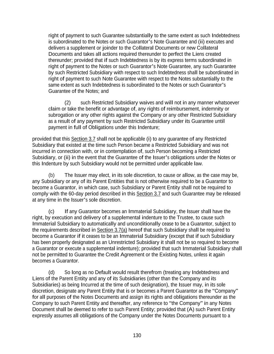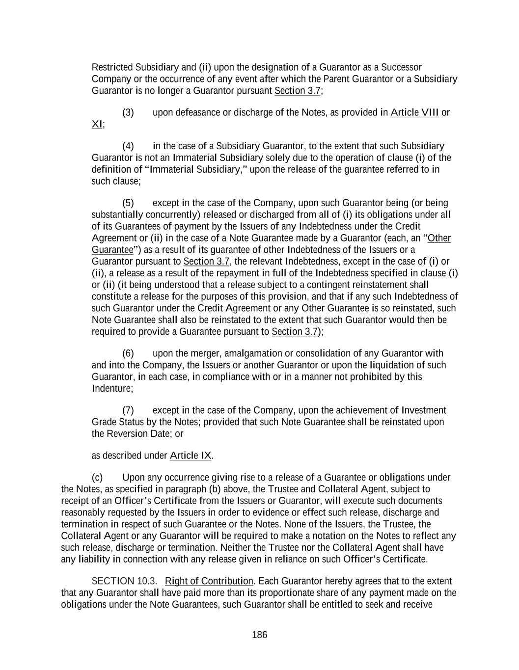 186 Restricted Subsidiary and (ii) upon the designation of a Guarantor as a Successor Company or the occurrence of any event after which the Parent Guarantor or a Subsidiary Guarantor is no longer a Guarantor pursuant Section 3.7; (3) upon defeasance or discharge of the Notes, as provided in Article VIII or XI; (4) in the case of a Subsidiary Guarantor, to the extent that such Subsidiary Guarantor is not an Immaterial Subsidiary solely due to the operation of clause (i) of the definition of “Immaterial Subsidiary,” upon the release of the guarantee referred to in such clause; (5) except in the case of the Company, upon such Guarantor being (or being substantially concurrently) released or discharged from all of (i) its obligations under all of its Guarantees of payment by the Issuers of any Indebtedness under the Credit Agreement or (ii) in the case of a Note Guarantee made by a Guarantor (each, an “Other Guarantee”) as a result of its guarantee of other Indebtedness of the Issuers or a Guarantor pursuant to Section 3.7, the relevant Indebtedness, except in the case of (i) or (ii), a release as a result of the repayment in full of the Indebtedness specified in clause (i) or (ii) (it being understood that a release subject to a contingent reinstatement shall constitute a release for the purposes of this provision, and that if any such Indebtedness of such Guarantor under the Credit Agreement or any Other Guarantee is so reinstated, such Note Guarantee shall also be reinstated to the extent that such Guarantor would then be required to provide a Guarantee pursuant to Section 3.7); (6) upon the merger, amalgamation or consolidation of any Guarantor with and into the Company, the Issuers or another Guarantor or upon the liquidation of such Guarantor, in each case, in compliance with or in a manner not prohibited by this Indenture; (7) except in the case of the Company, upon the achievement of Investment Grade Status by the Notes; provided that such Note Guarantee shall be reinstated upon the Reversion Date; or as described under Article IX. (c) Upon any occurrence giving rise to a release of a Guarantee or obligations under the Notes, as specified in paragraph (b) above, the Trustee and Collateral Agent, subject to receipt of an Officer’s Certificate from the Issuers or Guarantor, will execute such documents reasonably requested by the Issuers in order to evidence or effect such release, discharge and termination in respect of such Guarantee or the Notes. None of the Issuers, the Trustee, the Collateral Agent or any Guarantor will be required to make a notation on the Notes to reflect any such release, discharge or termination. Neither the Trustee nor the Collateral Agent shall have any liability in connection with any release given in reliance on such Officer’s Certificate. SECTION 10.3. Right of Contribution. Each Guarantor hereby agrees that to the extent that any Guarantor shall have paid more than its proportionate share of any payment made on the obligations under the Note Guarantees, such Guarantor shall be entitled to seek and receive