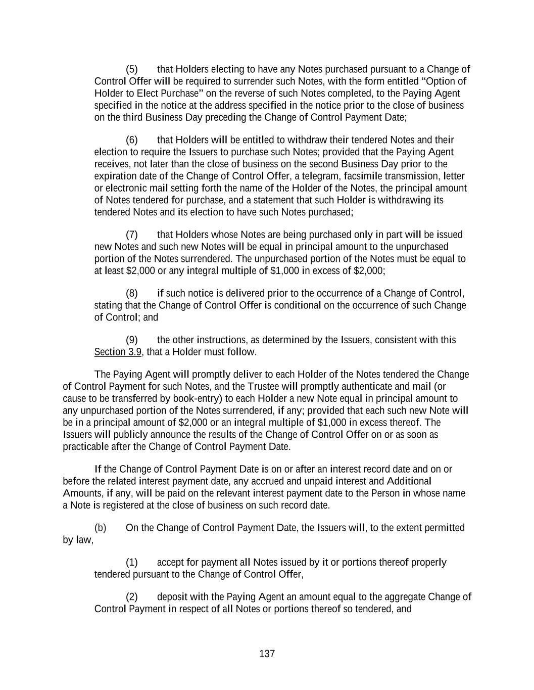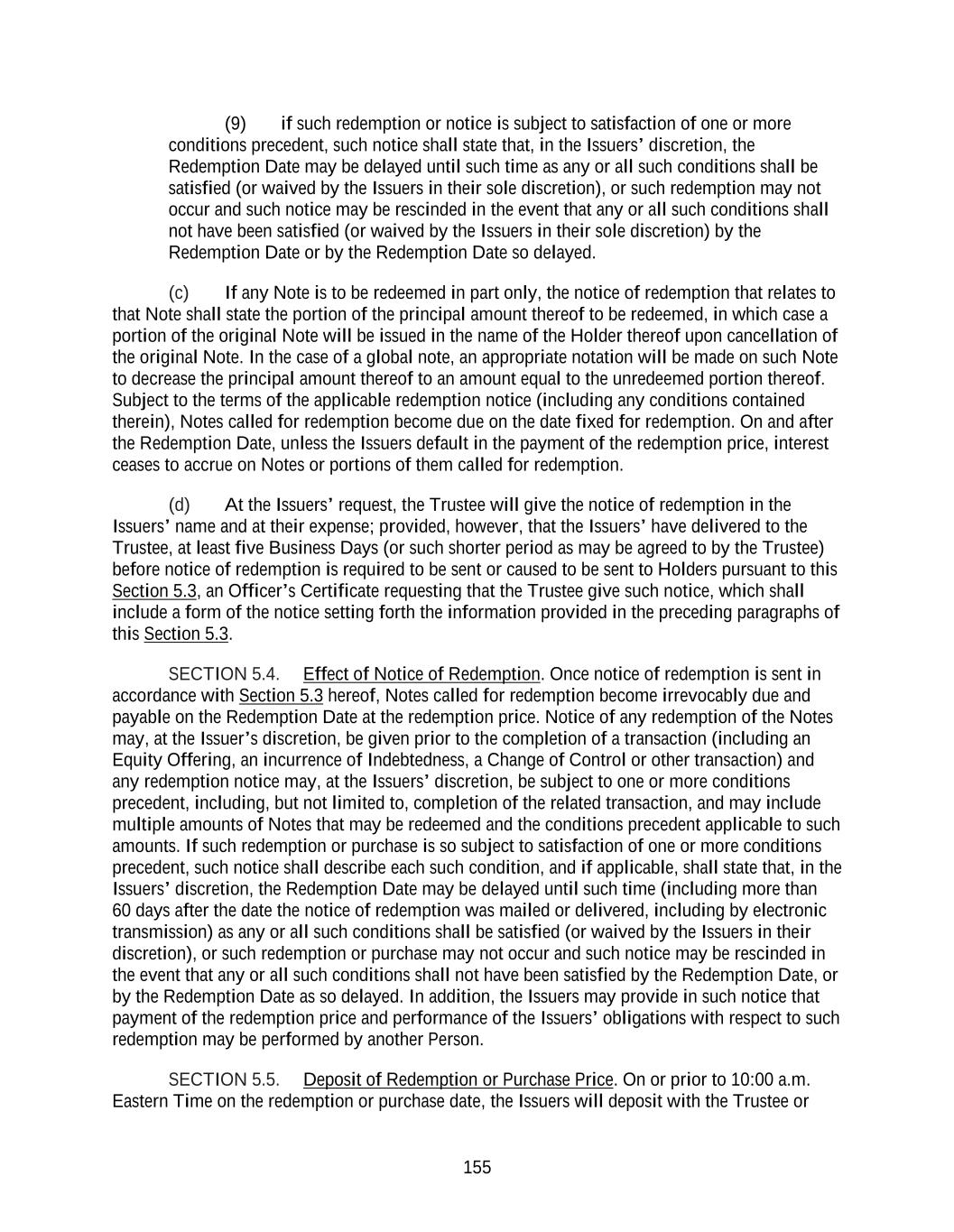 155 (9) if such redemption or notice is subject to satisfaction of one or more conditions precedent, such notice shall state that, in the Issuers’ discretion, the Redemption Date may be delayed until such time as any or all such conditions shall be satisfied (or waived by the Issuers in their sole discretion), or such redemption may not occur and such notice may be rescinded in the event that any or all such conditions shall not have been satisfied (or waived by the Issuers in their sole discretion) by the Redemption Date or by the Redemption Date so delayed. (c) If any Note is to be redeemed in part only, the notice of redemption that relates to that Note shall state the portion of the principal amount thereof to be redeemed, in which case a portion of the original Note will be issued in the name of the Holder thereof upon cancellation of the original Note. In the case of a global note, an appropriate notation will be made on such Note to decrease the principal amount thereof to an amount equal to the unredeemed portion thereof. Subject to the terms of the applicable redemption notice (including any conditions contained therein), Notes called for redemption become due on the date fixed for redemption. On and after the Redemption Date, unless the Issuers default in the payment of the redemption price, interest ceases to accrue on Notes or portions of them called for redemption. (d) At the Issuers’ request, the Trustee will give the notice of redemption in the Issuers’ name and at their expense; provided, however, that the Issuers’ have delivered to the Trustee, at least five Business Days (or such shorter period as may be agreed to by the Trustee) before notice of redemption is required to be sent or caused to be sent to Holders pursuant to this Section 5.3, an Officer’s Certificate requesting that the Trustee give such notice, which shall include a form of the notice setting forth the information provided in the preceding paragraphs of this Section 5.3. SECTION 5.4. Effect of Notice of Redemption. Once notice of redemption is sent in accordance with Section 5.3 hereof, Notes called for redemption become irrevocably due and payable on the Redemption Date at the redemption price. Notice of any redemption of the Notes may, at the Issuer’s discretion, be given prior to the completion of a transaction (including an Equity Offering, an incurrence of Indebtedness, a Change of Control or other transaction) and any redemption notice may, at the Issuers’ discretion, be subject to one or more conditions precedent, including, but not limited to, completion of the related transaction, and may include multiple amounts of Notes that may be redeemed and the conditions precedent applicable to such amounts. If such redemption or purchase is so subject to satisfaction of one or more conditions precedent, such notice shall describe each such condition, and if applicable, shall state that, in the Issuers’ discretion, the Redemption Date may be delayed until such time (including more than 60 days after the date the notice of redemption was mailed or delivered, including by electronic transmission) as any or all such conditions shall be satisfied (or waived by the Issuers in their discretion), or such redemption or purchase may not occur and such notice may be rescinded in the event that any or all such conditions shall not have been satisfied by the Redemption Date, or by the Redemption Date as so delayed. In addition, the Issuers may provide in such notice that payment of the redemption price and performance of the Issuers’ obligations with respect to such redemption may be performed by another Person. SECTION 5.5. Deposit of Redemption or Purchase Price. On or prior to 10:00 a.m. Eastern Time on the redemption or purchase date, the Issuers will deposit with the Trustee or
