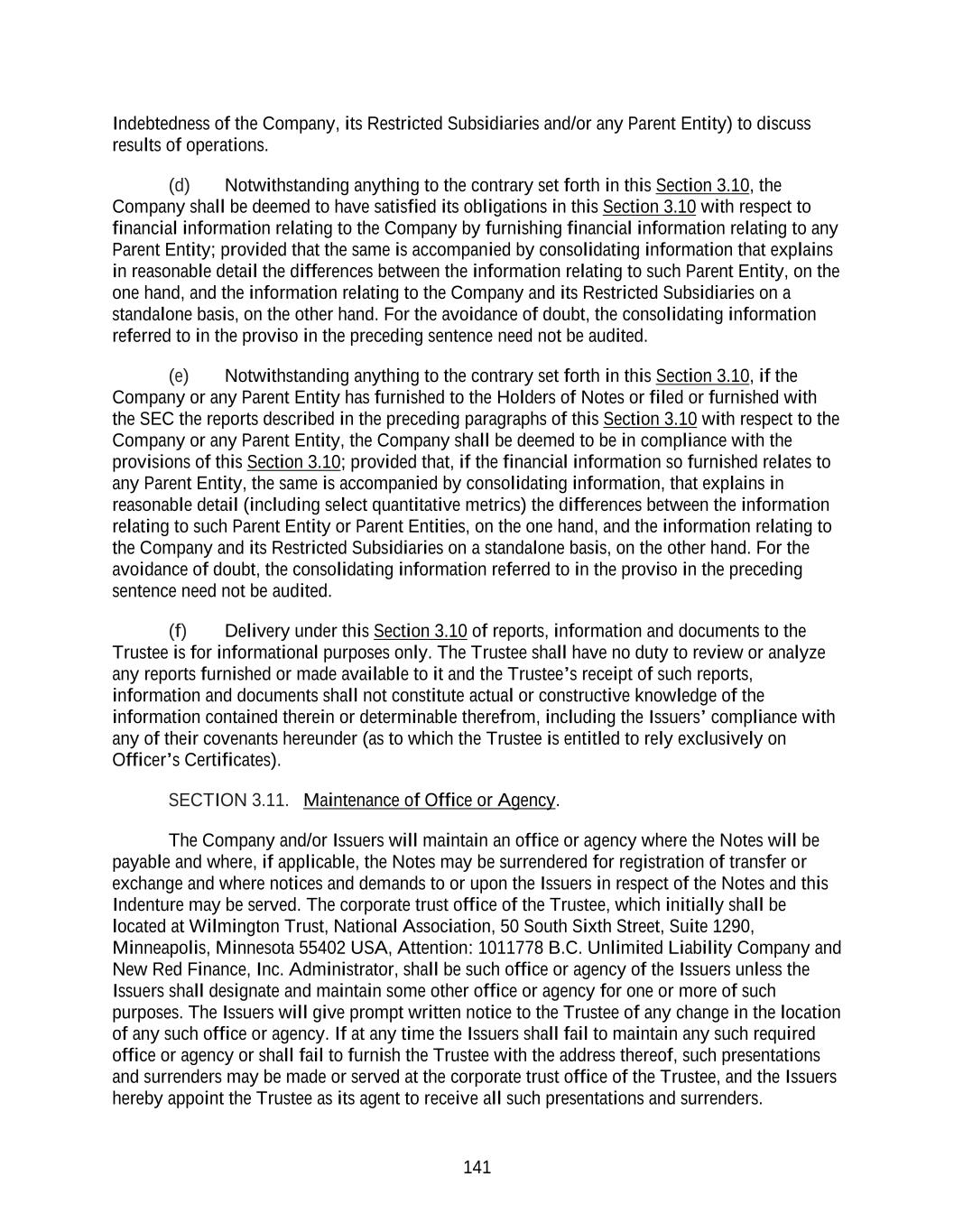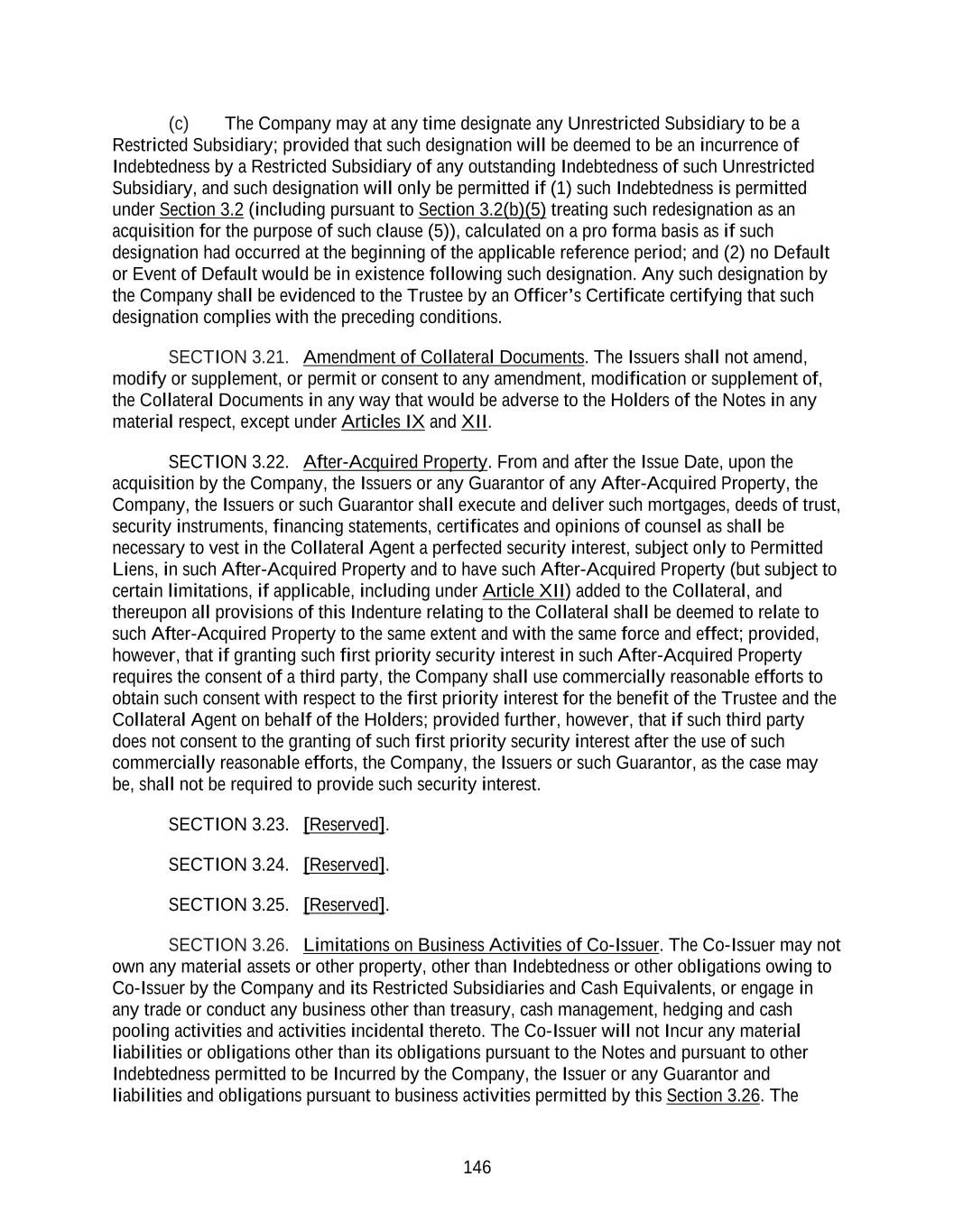 146 (c) The Company may at any time designate any Unrestricted Subsidiary to be a Restricted Subsidiary; provided that such designation will be deemed to be an incurrence of Indebtedness by a Restricted Subsidiary of any outstanding Indebtedness of such Unrestricted Subsidiary, and such designation will only be permitted if (1) such Indebtedness is permitted under Section 3.2 (including pursuant to Section 3.2(b)(5) treating such redesignation as an acquisition for the purpose of such clause (5)), calculated on a pro forma basis as if such designation had occurred at the beginning of the applicable reference period; and (2) no Default or Event of Default would be in existence following such designation. Any such designation by the Company shall be evidenced to the Trustee by an Officer’s Certificate certifying that such designation complies with the preceding conditions. SECTION 3.21. Amendment of Collateral Documents. The Issuers shall not amend, modify or supplement, or permit or consent to any amendment, modification or supplement of, the Collateral Documents in any way that would be adverse to the Holders of the Notes in any material respect, except under Articles IX and XII. SECTION 3.22. After-Acquired Property. From and after the Issue Date, upon the acquisition by the Company, the Issuers or any Guarantor of any After-Acquired Property, the Company, the Issuers or such Guarantor shall execute and deliver such mortgages, deeds of trust, security instruments, financing statements, certificates and opinions of counsel as shall be necessary to vest in the Collateral Agent a perfected security interest, subject only to Permitted Liens, in such After-Acquired Property and to have such After-Acquired Property (but subject to certain limitations, if applicable, including under Article XII) added to the Collateral, and thereupon all provisions of this Indenture relating to the Collateral shall be deemed to relate to such After-Acquired Property to the same extent and with the same force and effect; provided, however, that if granting such first priority security interest in such After-Acquired Property requires the consent of a third party, the Company shall use commercially reasonable efforts to obtain such consent with respect to the first priority interest for the benefit of the Trustee and the Collateral Agent on behalf of the Holders; provided further, however, that if such third party does not consent to the granting of such first priority security interest after the use of such commercially reasonable efforts, the Company, the Issuers or such Guarantor, as the case may be, shall not be required to provide such security interest. SECTION 3.23. [Reserved]. SECTION 3.24. [Reserved]. SECTION 3.25. [Reserved]. SECTION 3.26. Limitations on Business Activities of Co-Issuer. The Co-Issuer may not own any material assets or other property, other than Indebtedness or other obligations owing to Co-Issuer by the Company and its Restricted Subsidiaries and Cash Equivalents, or engage in any trade or conduct any business other than treasury, cash management, hedging and cash pooling activities and activities incidental thereto. The Co-Issuer will not Incur any material liabilities or obligations other than its obligations pursuant to the Notes and pursuant to other Indebtedness permitted to be Incurred by the Company, the Issuer or any Guarantor and liabilities and obligations pursuant to business activities permitted by this Section 3.26. The