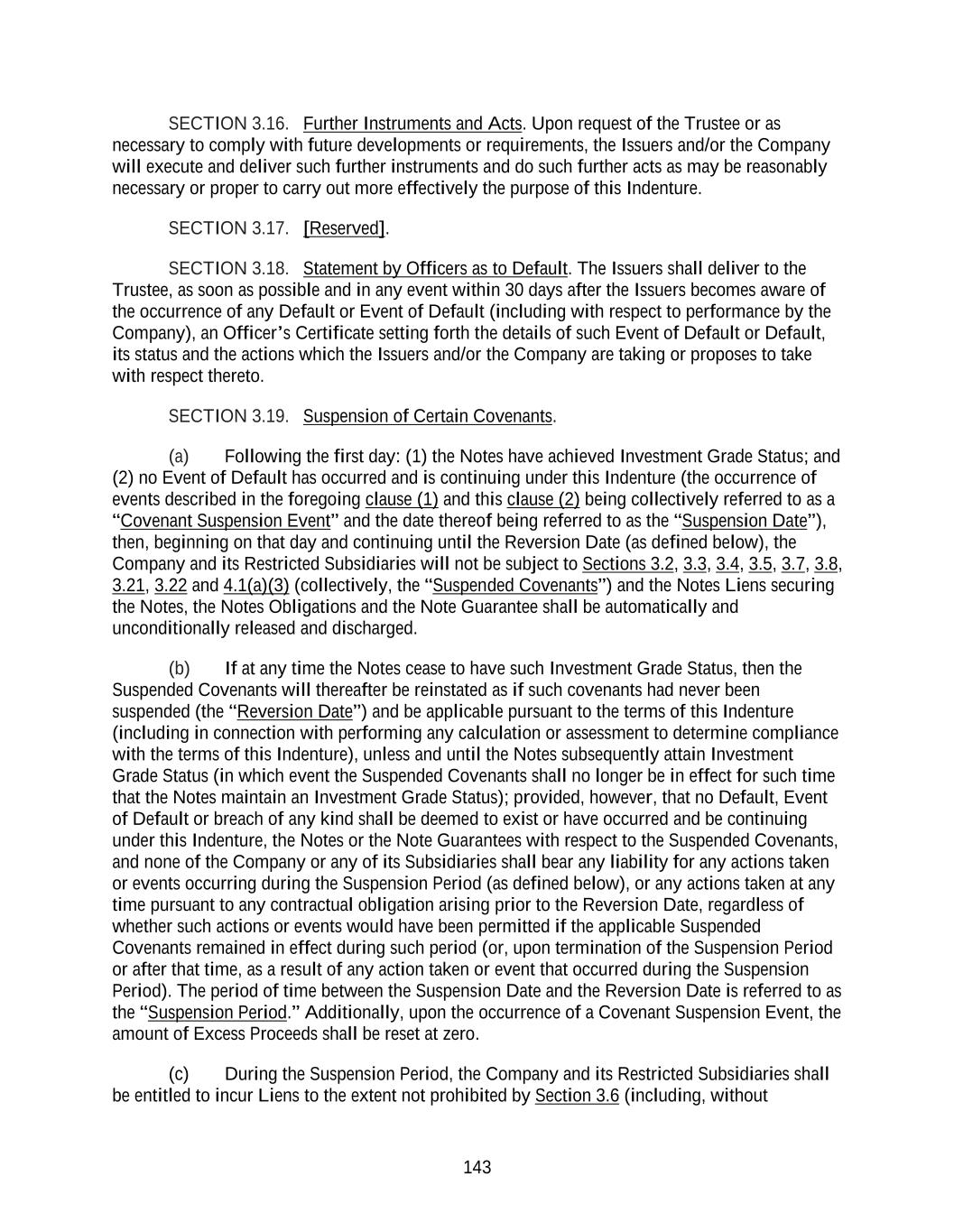 143 SECTION 3.16. Further Instruments and Acts. Upon request of the Trustee or as necessary to comply with future developments or requirements, the Issuers and/or the Company will execute and deliver such further instruments and do such further acts as may be reasonably necessary or proper to carry out more effectively the purpose of this Indenture. SECTION 3.17. [Reserved]. SECTION 3.18. Statement by Officers as to Default. The Issuers shall deliver to the Trustee, as soon as possible and in any event within 30 days after the Issuers becomes aware of the occurrence of any Default or Event of Default (including with respect to performance by the Company), an Officer’s Certificate setting forth the details of such Event of Default or Default, its status and the actions which the Issuers and/or the Company are taking or proposes to take with respect thereto. SECTION 3.19. Suspension of Certain Covenants. (a) Following the first day: (1) the Notes have achieved Investment Grade Status; and (2) no Event of Default has occurred and is continuing under this Indenture (the occurrence of events described in the foregoing clause (1) and this clause (2) being collectively referred to as a “Covenant Suspension Event” and the date thereof being referred to as the “Suspension Date”), then, beginning on that day and continuing until the Reversion Date (as defined below), the Company and its Restricted Subsidiaries will not be subject to Sections 3.2, 3.3, 3.4, 3.5, 3.7, 3.8, 3.21, 3.22 and 4.1(a)(3) (collectively, the “Suspended Covenants”) and the Notes Liens securing the Notes, the Notes Obligations and the Note Guarantee shall be automatically and unconditionally released and discharged. (b) If at any time the Notes cease to have such Investment Grade Status, then the Suspended Covenants will thereafter be reinstated as if such covenants had never been suspended (the “Reversion Date”) and be applicable pursuant to the terms of this Indenture (including in connection with performing any calculation or assessment to determine compliance with the terms of this Indenture), unless and until the Notes subsequently attain Investment Grade Status (in which event the Suspended Covenants shall no longer be in effect for such time that the Notes maintain an Investment Grade Status); provided, however, that no Default, Event of Default or breach of any kind shall be deemed to exist or have occurred and be continuing under this Indenture, the Notes or the Note Guarantees with respect to the Suspended Covenants, and none of the Company or any of its Subsidiaries shall bear any liability for any actions taken or events occurring during the Suspension Period (as defined below), or any actions taken at any time pursuant to any contractual obligation arising prior to the Reversion Date, regardless of whether such actions or events would have been permitted if the applicable Suspended Covenants remained in effect during such period (or, upon termination of the Suspension Period or after that time, as a result of any action taken or event that occurred during the Suspension Period). The period of time between the Suspension Date and the Reversion Date is referred to as the “Suspension Period.” Additionally, upon the occurrence of a Covenant Suspension Event, the amount of Excess Proceeds shall be reset at zero. (c) During the Suspension Period, the Company and its Restricted Subsidiaries shall be entitled to incur Liens to the extent not prohibited by Section 3.6 (including, without