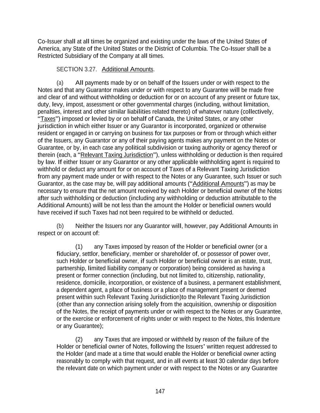 147 Co-Issuer shall at all times be organized and existing under the laws of the United States of America, any State of the United States or the District of Columbia. The Co-Issuer shall be a Restricted Subsidiary of the Company at all times. SECTION 3.27. Additional Amounts. (a) All payments made by or on behalf of the Issuers under or with respect to the Notes and that any Guarantor makes under or with respect to any Guarantee will be made free and clear of and without withholding or deduction for or on account of any present or future tax, duty, levy, impost, assessment or other governmental charges (including, without limitation, penalties, interest and other similar liabilities related thereto) of whatever nature (collectively, “Taxes”) imposed or levied by or on behalf of Canada, the United States, or any other jurisdiction in which either Issuer or any Guarantor is incorporated, organized or otherwise resident or engaged in or carrying on business for tax purposes or from or through which either of the Issuers, any Guarantor or any of their paying agents makes any payment on the Notes or Guarantee, or by, in each case any political subdivision or taxing authority or agency thereof or therein (each, a “Relevant Taxing Jurisdiction”), unless withholding or deduction is then required by law. If either Issuer or any Guarantor or any other applicable withholding agent is required to withhold or deduct any amount for or on account of Taxes of a Relevant Taxing Jurisdiction from any payment made under or with respect to the Notes or any Guarantee, such Issuer or such Guarantor, as the case may be, will pay additional amounts (“Additional Amounts”) as may be necessary to ensure that the net amount received by each Holder or beneficial owner of the Notes after such withholding or deduction (including any withholding or deduction attributable to the Additional Amounts) will be not less than the amount the Holder or beneficial owners would have received if such Taxes had not been required to be withheld or deducted. (b) Neither the Issuers nor any Guarantor will, however, pay Additional Amounts in respect or on account of: (1) any Taxes imposed by reason of the Holder or beneficial owner (or a fiduciary, settlor, beneficiary, member or shareholder of, or possessor of power over, such Holder or beneficial owner, if such Holder or beneficial owner is an estate, trust, partnership, limited liability company or corporation) being considered as having a present or former connection (including, but not limited to, citizenship, nationality, residence, domicile, incorporation, or existence of a business, a permanent establishment, a dependent agent, a place of business or a place of management present or deemed present within such Relevant Taxing Jurisdiction)to the Relevant Taxing Jurisdiction (other than any connection arising solely from the acquisition, ownership or disposition of the Notes, the receipt of payments under or with respect to the Notes or any Guarantee, or the exercise or enforcement of rights under or with respect to the Notes, this Indenture or any Guarantee); (2) any Taxes that are imposed or withheld by reason of the failure of the Holder or beneficial owner of Notes, following the Issuers’ written request addressed to the Holder (and made at a time that would enable the Holder or beneficial owner acting reasonably to comply with that request, and in all events at least 30 calendar days before the relevant date on which payment under or with respect to the Notes or any Guarantee