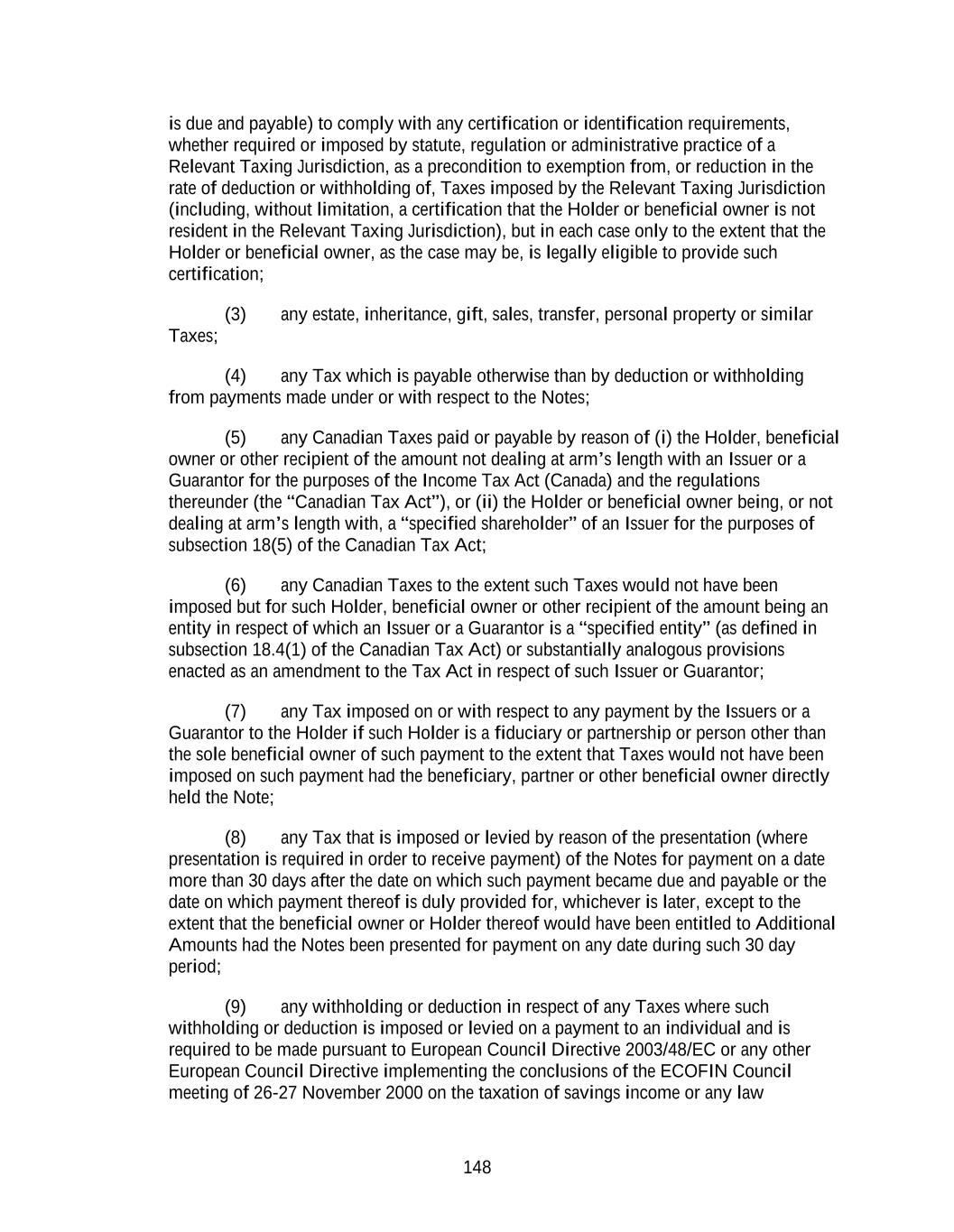 148 is due and payable) to comply with any certification or identification requirements, whether required or imposed by statute, regulation or administrative practice of a Relevant Taxing Jurisdiction, as a precondition to exemption from, or reduction in the rate of deduction or withholding of, Taxes imposed by the Relevant Taxing Jurisdiction (including, without limitation, a certification that the Holder or beneficial owner is not resident in the Relevant Taxing Jurisdiction), but in each case only to the extent that the Holder or beneficial owner, as the case may be, is legally eligible to provide such certification; (3) any estate, inheritance, gift, sales, transfer, personal property or similar Taxes; (4) any Tax which is payable otherwise than by deduction or withholding from payments made under or with respect to the Notes; (5) any Canadian Taxes paid or payable by reason of (i) the Holder, beneficial owner or other recipient of the amount not dealing at arm’s length with an Issuer or a Guarantor for the purposes of the Income Tax Act (Canada) and the regulations thereunder (the “Canadian Tax Act”), or (ii) the Holder or beneficial owner being, or not dealing at arm’s length with, a “specified shareholder” of an Issuer for the purposes of subsection 18(5) of the Canadian Tax Act; (6) any Canadian Taxes to the extent such Taxes would not have been imposed but for such Holder, beneficial owner or other recipient of the amount being an entity in respect of which an Issuer or a Guarantor is a “specified entity” (as defined in subsection 18.4(1) of the Canadian Tax Act) or substantially analogous provisions enacted as an amendment to the Tax Act in respect of such Issuer or Guarantor; (7) any Tax imposed on or with respect to any payment by the Issuers or a Guarantor to the Holder if such Holder is a fiduciary or partnership or person other than the sole beneficial owner of such payment to the extent that Taxes would not have been imposed on such payment had the beneficiary, partner or other beneficial owner directly held the Note; (8) any Tax that is imposed or levied by reason of the presentation (where presentation is required in order to receive payment) of the Notes for payment on a date more than 30 days after the date on which such payment became due and payable or the date on which payment thereof is duly provided for, whichever is later, except to the extent that the beneficial owner or Holder thereof would have been entitled to Additional Amounts had the Notes been presented for payment on any date during such 30 day period; (9) any withholding or deduction in respect of any Taxes where such withholding or deduction is imposed or levied on a payment to an individual and is required to be made pursuant to European Council Directive 2003/48/EC or any other European Council Directive implementing the conclusions of the ECOFIN Council meeting of 26-27 November 2000 on the taxation of savings income or any law