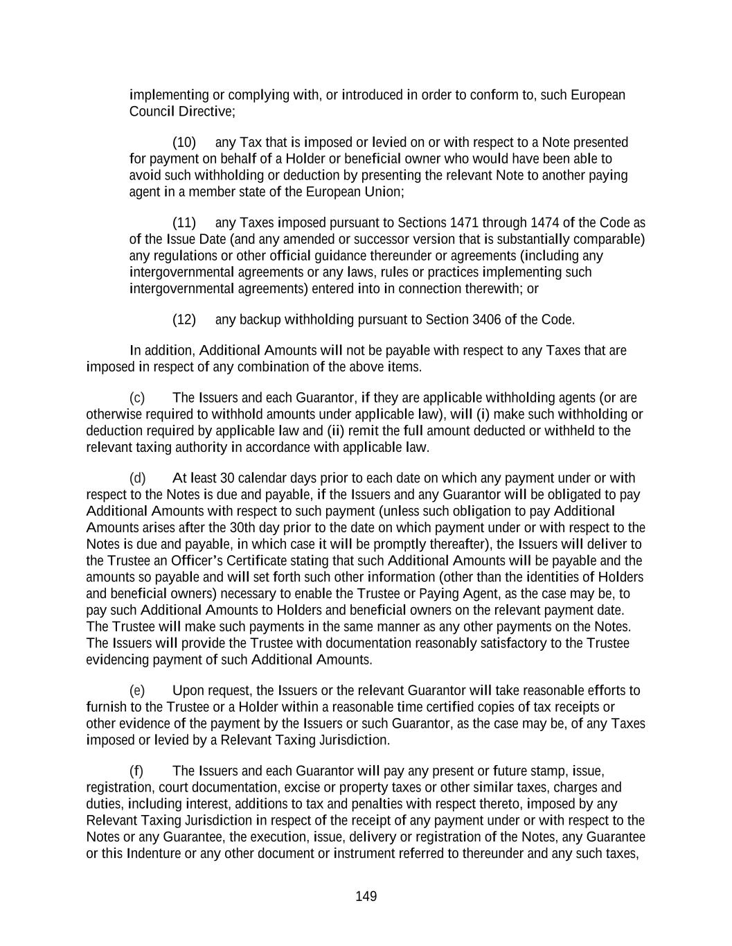 149 implementing or complying with, or introduced in order to conform to, such European Council Directive; (10) any Tax that is imposed or levied on or with respect to a Note presented for payment on behalf of a Holder or beneficial owner who would have been able to avoid such withholding or deduction by presenting the relevant Note to another paying agent in a member state of the European Union; (11) any Taxes imposed pursuant to Sections 1471 through 1474 of the Code as of the Issue Date (and any amended or successor version that is substantially comparable) any regulations or other official guidance thereunder or agreements (including any intergovernmental agreements or any laws, rules or practices implementing such intergovernmental agreements) entered into in connection therewith; or (12) any backup withholding pursuant to Section 3406 of the Code. In addition, Additional Amounts will not be payable with respect to any Taxes that are imposed in respect of any combination of the above items. (c) The Issuers and each Guarantor, if they are applicable withholding agents (or are otherwise required to withhold amounts under applicable law), will (i) make such withholding or deduction required by applicable law and (ii) remit the full amount deducted or withheld to the relevant taxing authority in accordance with applicable law. (d) At least 30 calendar days prior to each date on which any payment under or with respect to the Notes is due and payable, if the Issuers and any Guarantor will be obligated to pay Additional Amounts with respect to such payment (unless such obligation to pay Additional Amounts arises after the 30th day prior to the date on which payment under or with respect to the Notes is due and payable, in which case it will be promptly thereafter), the Issuers will deliver to the Trustee an Officer’s Certificate stating that such Additional Amounts will be payable and the amounts so payable and will set forth such other information (other than the identities of Holders and beneficial owners) necessary to enable the Trustee or Paying Agent, as the case may be, to pay such Additional Amounts to Holders and beneficial owners on the relevant payment date. The Trustee will make such payments in the same manner as any other payments on the Notes. The Issuers will provide the Trustee with documentation reasonably satisfactory to the Trustee evidencing payment of such Additional Amounts. (e) Upon request, the Issuers or the relevant Guarantor will take reasonable efforts to furnish to the Trustee or a Holder within a reasonable time certified copies of tax receipts or other evidence of the payment by the Issuers or such Guarantor, as the case may be, of any Taxes imposed or levied by a Relevant Taxing Jurisdiction. (f) The Issuers and each Guarantor will pay any present or future stamp, issue, registration, court documentation, excise or property taxes or other similar taxes, charges and duties, including interest, additions to tax and penalties with respect thereto, imposed by any Relevant Taxing Jurisdiction in respect of the receipt of any payment under or with respect to the Notes or any Guarantee, the execution, issue, delivery or registration of the Notes, any Guarantee or this Indenture or any other document or instrument referred to thereunder and any such taxes,