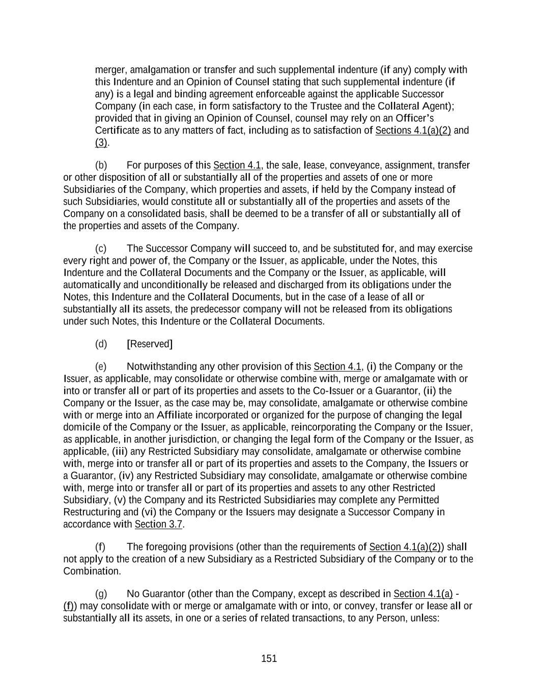 151 merger, amalgamation or transfer and such supplemental indenture (if any) comply with this Indenture and an Opinion of Counsel stating that such supplemental indenture (if any) is a legal and binding agreement enforceable against the applicable Successor Company (in each case, in form satisfactory to the Trustee and the Collateral Agent); provided that in giving an Opinion of Counsel, counsel may rely on an Officer’s Certificate as to any matters of fact, including as to satisfaction of Sections 4.1(a)(2) and (3). (b) For purposes of this Section 4.1, the sale, lease, conveyance, assignment, transfer or other disposition of all or substantially all of the properties and assets of one or more Subsidiaries of the Company, which properties and assets, if held by the Company instead of such Subsidiaries, would constitute all or substantially all of the properties and assets of the Company on a consolidated basis, shall be deemed to be a transfer of all or substantially all of the properties and assets of the Company. (c) The Successor Company will succeed to, and be substituted for, and may exercise every right and power of, the Company or the Issuer, as applicable, under the Notes, this Indenture and the Collateral Documents and the Company or the Issuer, as applicable, will automatically and unconditionally be released and discharged from its obligations under the Notes, this Indenture and the Collateral Documents, but in the case of a lease of all or substantially all its assets, the predecessor company will not be released from its obligations under such Notes, this Indenture or the Collateral Documents. (d) [Reserved] (e) Notwithstanding any other provision of this Section 4.1, (i) the Company or the Issuer, as applicable, may consolidate or otherwise combine with, merge or amalgamate with or into or transfer all or part of its properties and assets to the Co-Issuer or a Guarantor, (ii) the Company or the Issuer, as the case may be, may consolidate, amalgamate or otherwise combine with or merge into an Affiliate incorporated or organized for the purpose of changing the legal domicile of the Company or the Issuer, as applicable, reincorporating the Company or the Issuer, as applicable, in another jurisdiction, or changing the legal form of the Company or the Issuer, as applicable, (iii) any Restricted Subsidiary may consolidate, amalgamate or otherwise combine with, merge into or transfer all or part of its properties and assets to the Company, the Issuers or a Guarantor, (iv) any Restricted Subsidiary may consolidate, amalgamate or otherwise combine with, merge into or transfer all or part of its properties and assets to any other Restricted Subsidiary, (v) the Company and its Restricted Subsidiaries may complete any Permitted Restructuring and (vi) the Company or the Issuers may designate a Successor Company in accordance with Section 3.7. (f) The foregoing provisions (other than the requirements of Section 4.1(a)(2)) shall not apply to the creation of a new Subsidiary as a Restricted Subsidiary of the Company or to the Combination. (g) No Guarantor (other than the Company, except as described in Section 4.1(a) - (f)) may consolidate with or merge or amalgamate with or into, or convey, transfer or lease all or substantially all its assets, in one or a series of related transactions, to any Person, unless: