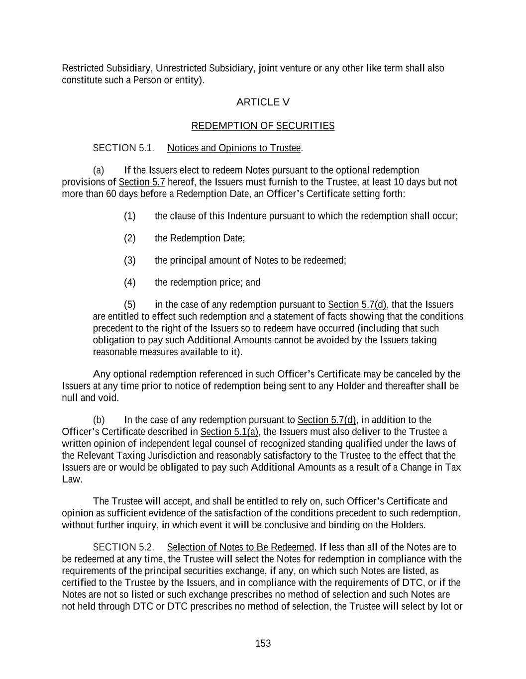 153 Restricted Subsidiary, Unrestricted Subsidiary, joint venture or any other like term shall also constitute such a Person or entity). ARTICLE V REDEMPTION OF SECURITIES SECTION 5.1. Notices and Opinions to Trustee. (a) If the Issuers elect to redeem Notes pursuant to the optional redemption provisions of Section 5.7 hereof, the Issuers must furnish to the Trustee, at least 10 days but not more than 60 days before a Redemption Date, an Officer’s Certificate setting forth: (1) the clause of this Indenture pursuant to which the redemption shall occur; (2) the Redemption Date; (3) the principal amount of Notes to be redeemed; (4) the redemption price; and (5) in the case of any redemption pursuant to Section 5.7(d), that the Issuers are entitled to effect such redemption and a statement of facts showing that the conditions precedent to the right of the Issuers so to redeem have occurred (including that such obligation to pay such Additional Amounts cannot be avoided by the Issuers taking reasonable measures available to it). Any optional redemption referenced in such Officer’s Certificate may be canceled by the Issuers at any time prior to notice of redemption being sent to any Holder and thereafter shall be null and void. (b) In the case of any redemption pursuant to Section 5.7(d), in addition to the Officer’s Certificate described in Section 5.1(a), the Issuers must also deliver to the Trustee a written opinion of independent legal counsel of recognized standing qualified under the laws of the Relevant Taxing Jurisdiction and reasonably satisfactory to the Trustee to the effect that the Issuers are or would be obligated to pay such Additional Amounts as a result of a Change in Tax Law. The Trustee will accept, and shall be entitled to rely on, such Officer’s Certificate and opinion as sufficient evidence of the satisfaction of the conditions precedent to such redemption, without further inquiry, in which event it will be conclusive and binding on the Holders. SECTION 5.2. Selection of Notes to Be Redeemed. If less than all of the Notes are to be redeemed at any time, the Trustee will select the Notes for redemption in compliance with the requirements of the principal securities exchange, if any, on which such Notes are listed, as certified to the Trustee by the Issuers, and in compliance with the requirements of DTC, or if the Notes are not so listed or such exchange prescribes no method of selection and such Notes are not held through DTC or DTC prescribes no method of selection, the Trustee will select by lot or