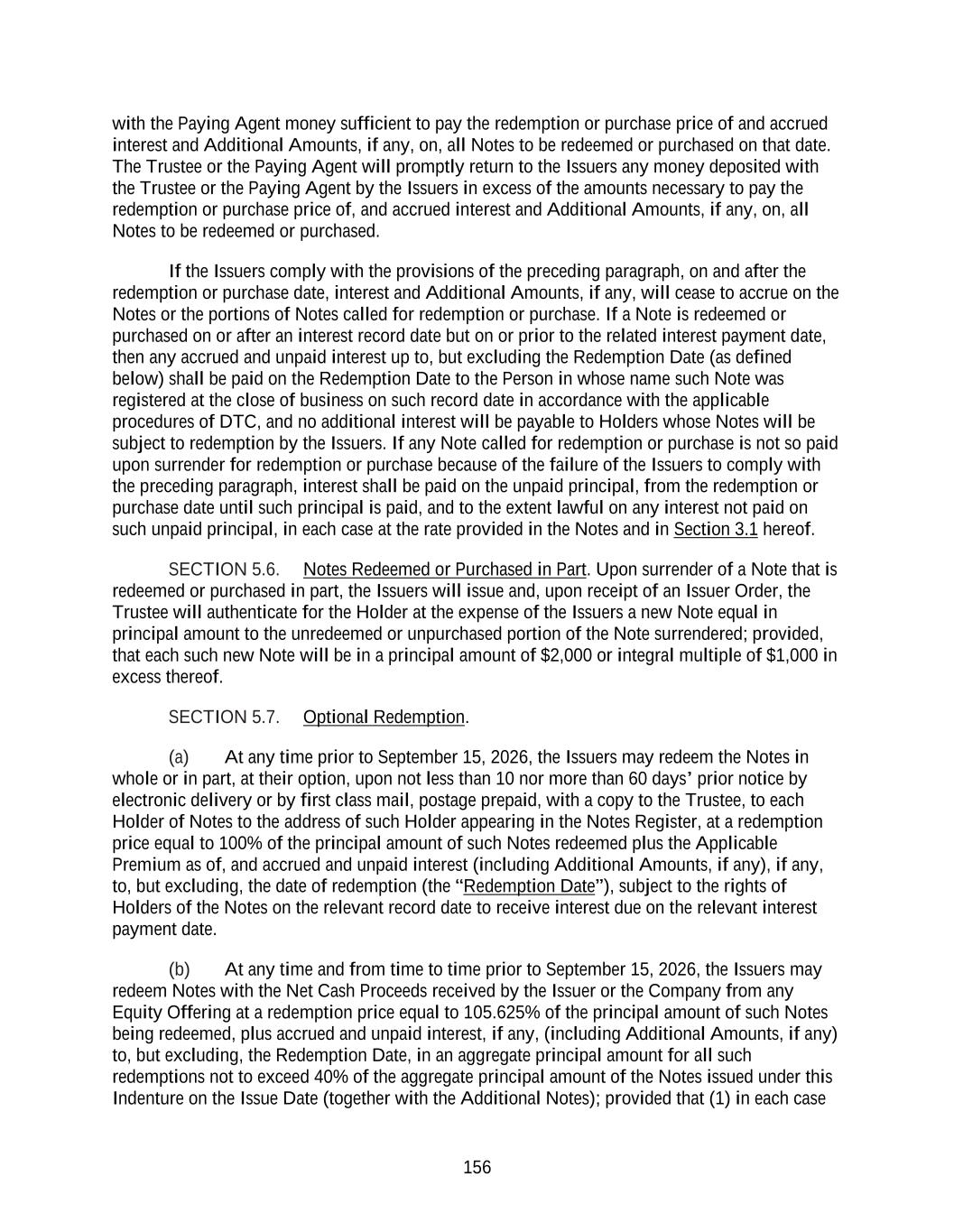 156 with the Paying Agent money sufficient to pay the redemption or purchase price of and accrued interest and Additional Amounts, if any, on, all Notes to be redeemed or purchased on that date. The Trustee or the Paying Agent will promptly return to the Issuers any money deposited with the Trustee or the Paying Agent by the Issuers in excess of the amounts necessary to pay the redemption or purchase price of, and accrued interest and Additional Amounts, if any, on, all Notes to be redeemed or purchased. If the Issuers comply with the provisions of the preceding paragraph, on and after the redemption or purchase date, interest and Additional Amounts, if any, will cease to accrue on the Notes or the portions of Notes called for redemption or purchase. If a Note is redeemed or purchased on or after an interest record date but on or prior to the related interest payment date, then any accrued and unpaid interest up to, but excluding the Redemption Date (as defined below) shall be paid on the Redemption Date to the Person in whose name such Note was registered at the close of business on such record date in accordance with the applicable procedures of DTC, and no additional interest will be payable to Holders whose Notes will be subject to redemption by the Issuers. If any Note called for redemption or purchase is not so paid upon surrender for redemption or purchase because of the failure of the Issuers to comply with the preceding paragraph, interest shall be paid on the unpaid principal, from the redemption or purchase date until such principal is paid, and to the extent lawful on any interest not paid on such unpaid principal, in each case at the rate provided in the Notes and in Section 3.1 hereof. SECTION 5.6. Notes Redeemed or Purchased in Part. Upon surrender of a Note that is redeemed or purchased in part, the Issuers will issue and, upon receipt of an Issuer Order, the Trustee will authenticate for the Holder at the expense of the Issuers a new Note equal in principal amount to the unredeemed or unpurchased portion of the Note surrendered; provided, that each such new Note will be in a principal amount of $2,000 or integral multiple of $1,000 in excess thereof. SECTION 5.7. Optional Redemption. (a) At any time prior to September 15, 2026, the Issuers may redeem the Notes in whole or in part, at their option, upon not less than 10 nor more than 60 days’ prior notice by electronic delivery or by first class mail, postage prepaid, with a copy to the Trustee, to each Holder of Notes to the address of such Holder appearing in the Notes Register, at a redemption price equal to 100% of the principal amount of such Notes redeemed plus the Applicable Premium as of, and accrued and unpaid interest (including Additional Amounts, if any), if any, to, but excluding, the date of redemption (the “Redemption Date”), subject to the rights of Holders of the Notes on the relevant record date to receive interest due on the relevant interest payment date. (b) At any time and from time to time prior to September 15, 2026, the Issuers may redeem Notes with the Net Cash Proceeds received by the Issuer or the Company from any Equity Offering at a redemption price equal to 105.625% of the principal amount of such Notes being redeemed, plus accrued and unpaid interest, if any, (including Additional Amounts, if any) to, but excluding, the Redemption Date, in an aggregate principal amount for all such redemptions not to exceed 40% of the aggregate principal amount of the Notes issued under this Indenture on the Issue Date (together with the Additional Notes); provided that (1) in each case