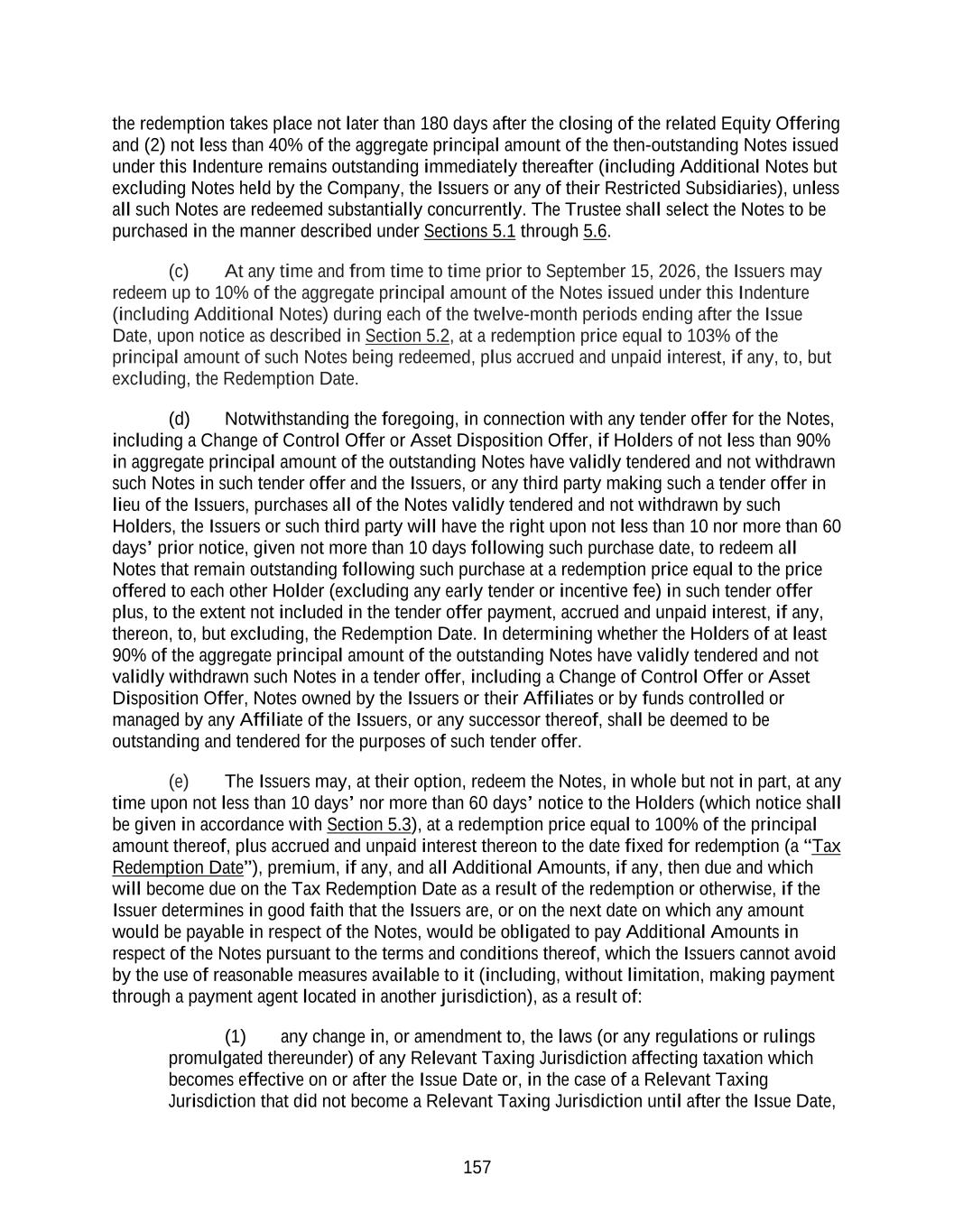 157 the redemption takes place not later than 180 days after the closing of the related Equity Offering and (2) not less than 40% of the aggregate principal amount of the then-outstanding Notes issued under this Indenture remains outstanding immediately thereafter (including Additional Notes but excluding Notes held by the Company, the Issuers or any of their Restricted Subsidiaries), unless all such Notes are redeemed substantially concurrently. The Trustee shall select the Notes to be purchased in the manner described under Sections 5.1 through 5.6. (c) At any time and from time to time prior to September 15, 2026, the Issuers may redeem up to 10% of the aggregate principal amount of the Notes issued under this Indenture (including Additional Notes) during each of the twelve-month periods ending after the Issue Date, upon notice as described in Section 5.2, at a redemption price equal to 103% of the principal amount of such Notes being redeemed, plus accrued and unpaid interest, if any, to, but excluding, the Redemption Date. (d) Notwithstanding the foregoing, in connection with any tender offer for the Notes, including a Change of Control Offer or Asset Disposition Offer, if Holders of not less than 90% in aggregate principal amount of the outstanding Notes have validly tendered and not withdrawn such Notes in such tender offer and the Issuers, or any third party making such a tender offer in lieu of the Issuers, purchases all of the Notes validly tendered and not withdrawn by such Holders, the Issuers or such third party will have the right upon not less than 10 nor more than 60 days’ prior notice, given not more than 10 days following such purchase date, to redeem all Notes that remain outstanding following such purchase at a redemption price equal to the price offered to each other Holder (excluding any early tender or incentive fee) in such tender offer plus, to the extent not included in the tender offer payment, accrued and unpaid interest, if any, thereon, to, but excluding, the Redemption Date. In determining whether the Holders of at least 90% of the aggregate principal amount of the outstanding Notes have validly tendered and not validly withdrawn such Notes in a tender offer, including a Change of Control Offer or Asset Disposition Offer, Notes owned by the Issuers or their Affiliates or by funds controlled or managed by any Affiliate of the Issuers, or any successor thereof, shall be deemed to be outstanding and tendered for the purposes of such tender offer. (e) The Issuers may, at their option, redeem the Notes, in whole but not in part, at any time upon not less than 10 days’ nor more than 60 days’ notice to the Holders (which notice shall be given in accordance with Section 5.3), at a redemption price equal to 100% of the principal amount thereof, plus accrued and unpaid interest thereon to the date fixed for redemption (a “Tax Redemption Date”), premium, if any, and all Additional Amounts, if any, then due and which will become due on the Tax Redemption Date as a result of the redemption or otherwise, if the Issuer determines in good faith that the Issuers are, or on the next date on which any amount would be payable in respect of the Notes, would be obligated to pay Additional Amounts in respect of the Notes pursuant to the terms and conditions thereof, which the Issuers cannot avoid by the use of reasonable measures available to it (including, without limitation, making payment through a payment agent located in another jurisdiction), as a result of: (1) any change in, or amendment to, the laws (or any regulations or rulings promulgated thereunder) of any Relevant Taxing Jurisdiction affecting taxation which becomes effective on or after the Issue Date or, in the case of a Relevant Taxing Jurisdiction that did not become a Relevant Taxing Jurisdiction until after the Issue Date,