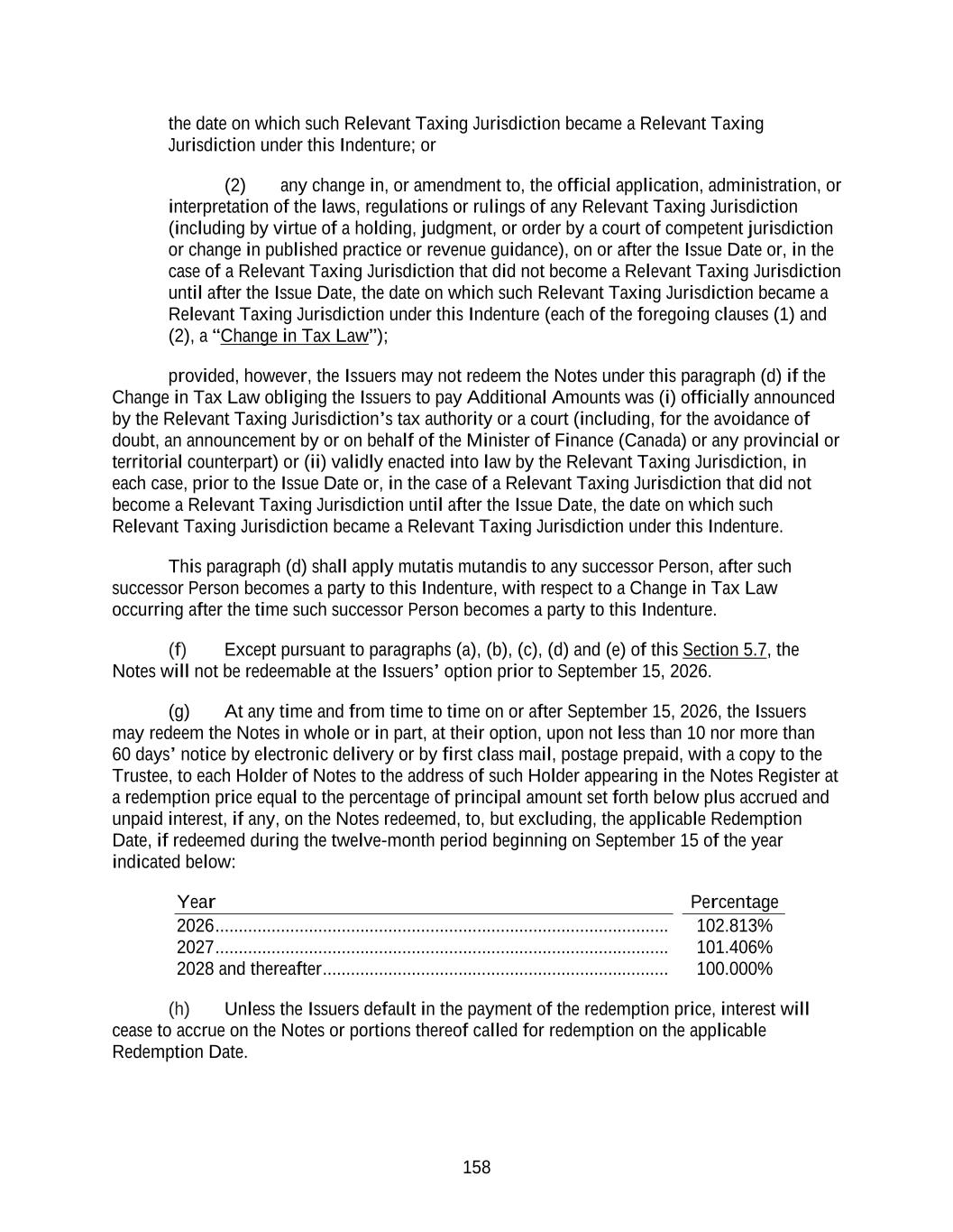 158 the date on which such Relevant Taxing Jurisdiction became a Relevant Taxing Jurisdiction under this Indenture; or (2) any change in, or amendment to, the official application, administration, or interpretation of the laws, regulations or rulings of any Relevant Taxing Jurisdiction (including by virtue of a holding, judgment, or order by a court of competent jurisdiction or change in published practice or revenue guidance), on or after the Issue Date or, in the case of a Relevant Taxing Jurisdiction that did not become a Relevant Taxing Jurisdiction until after the Issue Date, the date on which such Relevant Taxing Jurisdiction became a Relevant Taxing Jurisdiction under this Indenture (each of the foregoing clauses (1) and (2), a “Change in Tax Law”); provided, however, the Issuers may not redeem the Notes under this paragraph (d) if the Change in Tax Law obliging the Issuers to pay Additional Amounts was (i) officially announced by the Relevant Taxing Jurisdiction’s tax authority or a court (including, for the avoidance of doubt, an announcement by or on behalf of the Minister of Finance (Canada) or any provincial or territorial counterpart) or (ii) validly enacted into law by the Relevant Taxing Jurisdiction, in each case, prior to the Issue Date or, in the case of a Relevant Taxing Jurisdiction that did not become a Relevant Taxing Jurisdiction until after the Issue Date, the date on which such Relevant Taxing Jurisdiction became a Relevant Taxing Jurisdiction under this Indenture. This paragraph (d) shall apply mutatis mutandis to any successor Person, after such successor Person becomes a party to this Indenture, with respect to a Change in Tax Law occurring after the time such successor Person becomes a party to this Indenture. (f) Except pursuant to paragraphs (a), (b), (c), (d) and (e) of this Section 5.7, the Notes will not be redeemable at the Issuers’ option prior to September 15, 2026. (g) At any time and from time to time on or after September 15, 2026, the Issuers may redeem the Notes in whole or in part, at their option, upon not less than 10 nor more than 60 days’ notice by electronic delivery or by first class mail, postage prepaid, with a copy to the Trustee, to each Holder of Notes to the address of such Holder appearing in the Notes Register at a redemption price equal to the percentage of principal amount set forth below plus accrued and unpaid interest, if any, on the Notes redeemed, to, but excluding, the applicable Redemption Date, if redeemed during the twelve-month period beginning on September 15 of the year indicated below: Year Percentage 2026 ................................................................................................. 102.813% 2027 ................................................................................................. 101.406% 2028 and thereafter .......................................................................... 100.000% (h) Unless the Issuers default in the payment of the redemption price, interest will cease to accrue on the Notes or portions thereof called for redemption on the applicable Redemption Date.