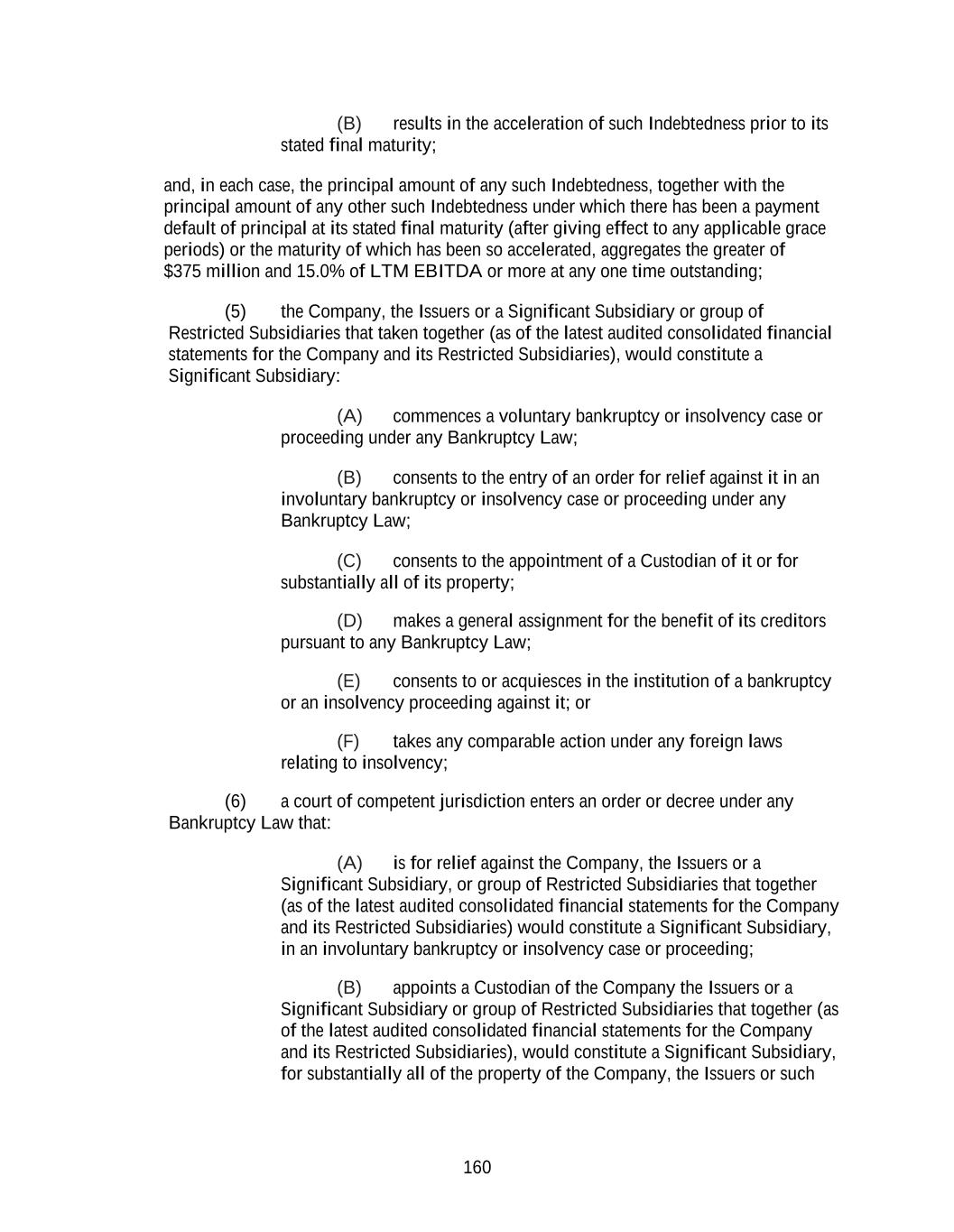 160 (B) results in the acceleration of such Indebtedness prior to its stated final maturity; and, in each case, the principal amount of any such Indebtedness, together with the principal amount of any other such Indebtedness under which there has been a payment default of principal at its stated final maturity (after giving effect to any applicable grace periods) or the maturity of which has been so accelerated, aggregates the greater of $375 million and 15.0% of LTM EBITDA or more at any one time outstanding; (5) the Company, the Issuers or a Significant Subsidiary or group of Restricted Subsidiaries that taken together (as of the latest audited consolidated financial statements for the Company and its Restricted Subsidiaries), would constitute a Significant Subsidiary: (A) commences a voluntary bankruptcy or insolvency case or proceeding under any Bankruptcy Law; (B) consents to the entry of an order for relief against it in an involuntary bankruptcy or insolvency case or proceeding under any Bankruptcy Law; (C) consents to the appointment of a Custodian of it or for substantially all of its property; (D) makes a general assignment for the benefit of its creditors pursuant to any Bankruptcy Law; (E) consents to or acquiesces in the institution of a bankruptcy or an insolvency proceeding against it; or (F) takes any comparable action under any foreign laws relating to insolvency; (6) a court of competent jurisdiction enters an order or decree under any Bankruptcy Law that: (A) is for relief against the Company, the Issuers or a Significant Subsidiary, or group of Restricted Subsidiaries that together (as of the latest audited consolidated financial statements for the Company and its Restricted Subsidiaries) would constitute a Significant Subsidiary, in an involuntary bankruptcy or insolvency case or proceeding; (B) appoints a Custodian of the Company the Issuers or a Significant Subsidiary or group of Restricted Subsidiaries that together (as of the latest audited consolidated financial statements for the Company and its Restricted Subsidiaries), would constitute a Significant Subsidiary, for substantially all of the property of the Company, the Issuers or such