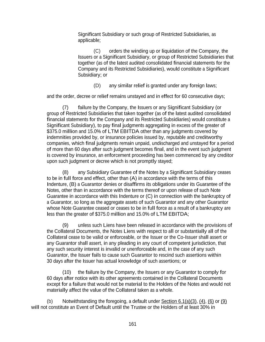161 Significant Subsidiary or such group of Restricted Subsidiaries, as applicable; (C) orders the winding up or liquidation of the Company, the Issuers or a Significant Subsidiary, or group of Restricted Subsidiaries that together (as of the latest audited consolidated financial statements for the Company and its Restricted Subsidiaries), would constitute a Significant Subsidiary; or (D) any similar relief is granted under any foreign laws; and the order, decree or relief remains unstayed and in effect for 60 consecutive days; (7) failure by the Company, the Issuers or any Significant Subsidiary (or group of Restricted Subsidiaries that taken together (as of the latest audited consolidated financial statements for the Company and its Restricted Subsidiaries) would constitute a Significant Subsidiary), to pay final judgments aggregating in excess of the greater of $375.0 million and 15.0% of LTM EBITDA other than any judgments covered by indemnities provided by, or insurance policies issued by, reputable and creditworthy companies, which final judgments remain unpaid, undischarged and unstayed for a period of more than 60 days after such judgment becomes final, and in the event such judgment is covered by insurance, an enforcement proceeding has been commenced by any creditor upon such judgment or decree which is not promptly stayed; (8) any Subsidiary Guarantee of the Notes by a Significant Subsidiary ceases to be in full force and effect, other than (A) in accordance with the terms of this Indenture, (B) a Guarantor denies or disaffirms its obligations under its Guarantee of the Notes, other than in accordance with the terms thereof or upon release of such Note Guarantee in accordance with this Indenture or (C) in connection with the bankruptcy of a Guarantor, so long as the aggregate assets of such Guarantor and any other Guarantor whose Note Guarantee ceased or ceases to be in full force as a result of a bankruptcy are less than the greater of $375.0 million and 15.0% of LTM EBITDA; (9) unless such Liens have been released in accordance with the provisions of the Collateral Documents, the Notes Liens with respect to all or substantially all of the Collateral cease to be valid or enforceable, or the Issuer or the Co-Issuer shall assert or any Guarantor shall assert, in any pleading in any court of competent jurisdiction, that any such security interest is invalid or unenforceable and, in the case of any such Guarantor, the Issuer fails to cause such Guarantor to rescind such assertions within 30 days after the Issuer has actual knowledge of such assertions; or (10) the failure by the Company, the Issuers or any Guarantor to comply for 60 days after notice with its other agreements contained in the Collateral Documents except for a failure that would not be material to the Holders of the Notes and would not materially affect the value of the Collateral taken as a whole. (b) Notwithstanding the foregoing, a default under Section 6.1(a)(3), (4), (6) or (9) will not constitute an Event of Default until the Trustee or the Holders of at least 30% in