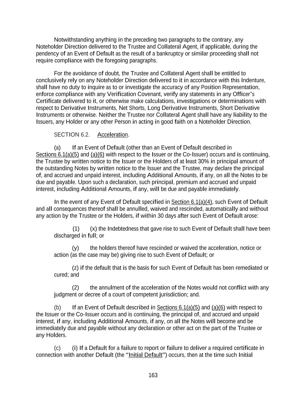163 Notwithstanding anything in the preceding two paragraphs to the contrary, any Noteholder Direction delivered to the Trustee and Collateral Agent, if applicable, during the pendency of an Event of Default as the result of a bankruptcy or similar proceeding shall not require compliance with the foregoing paragraphs. For the avoidance of doubt, the Trustee and Collateral Agent shall be entitled to conclusively rely on any Noteholder Direction delivered to it in accordance with this Indenture, shall have no duty to inquire as to or investigate the accuracy of any Position Representation, enforce compliance with any Verification Covenant, verify any statements in any Officer’s Certificate delivered to it, or otherwise make calculations, investigations or determinations with respect to Derivative Instruments, Net Shorts, Long Derivative Instruments, Short Derivative Instruments or otherwise. Neither the Trustee nor Collateral Agent shall have any liability to the Issuers, any Holder or any other Person in acting in good faith on a Noteholder Direction. SECTION 6.2. Acceleration. (a) If an Event of Default (other than an Event of Default described in Sections 6.1(a)(5) and (a)(6) with respect to the Issuer or the Co-Issuer) occurs and is continuing, the Trustee by written notice to the Issuer or the Holders of at least 30% in principal amount of the outstanding Notes by written notice to the Issuer and the Trustee, may declare the principal of, and accrued and unpaid interest, including Additional Amounts, if any, on all the Notes to be due and payable. Upon such a declaration, such principal, premium and accrued and unpaid interest, including Additional Amounts, if any, will be due and payable immediately. In the event of any Event of Default specified in Section 6.1(a)(4), such Event of Default and all consequences thereof shall be annulled, waived and rescinded, automatically and without any action by the Trustee or the Holders, if within 30 days after such Event of Default arose: (1) (x) the Indebtedness that gave rise to such Event of Default shall have been discharged in full; or (y) the holders thereof have rescinded or waived the acceleration, notice or action (as the case may be) giving rise to such Event of Default; or (z) if the default that is the basis for such Event of Default has been remediated or cured; and (2) the annulment of the acceleration of the Notes would not conflict with any judgment or decree of a court of competent jurisdiction; and. (b) If an Event of Default described in Sections 6.1(a)(5) and (a)(6) with respect to the Issuer or the Co-Issuer occurs and is continuing, the principal of, and accrued and unpaid interest, if any, including Additional Amounts, if any, on all the Notes will become and be immediately due and payable without any declaration or other act on the part of the Trustee or any Holders. (c) (i) If a Default for a failure to report or failure to deliver a required certificate in connection with another Default (the “Initial Default”) occurs, then at the time such Initial