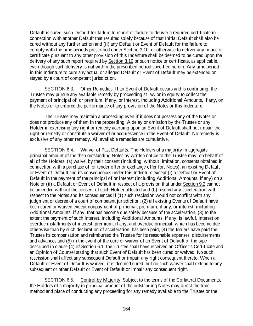 164 Default is cured, such Default for failure to report or failure to deliver a required certificate in connection with another Default that resulted solely because of that Initial Default shall also be cured without any further action and (ii) any Default or Event of Default for the failure to comply with the time periods prescribed under Section 3.10, or otherwise to deliver any notice or certificate pursuant to any other provision of this Indenture shall be deemed to be cured upon the delivery of any such report required by Section 3.10 or such notice or certificate, as applicable, even though such delivery is not within the prescribed period specified herein. Any time period in this Indenture to cure any actual or alleged Default or Event of Default may be extended or stayed by a court of competent jurisdiction. SECTION 6.3. Other Remedies. If an Event of Default occurs and is continuing, the Trustee may pursue any available remedy by proceeding at law or in equity to collect the payment of principal of, or premium, if any, or interest, including Additional Amounts, if any, on the Notes or to enforce the performance of any provision of the Notes or this Indenture. The Trustee may maintain a proceeding even if it does not possess any of the Notes or does not produce any of them in the proceeding. A delay or omission by the Trustee or any Holder in exercising any right or remedy accruing upon an Event of Default shall not impair the right or remedy or constitute a waiver of or acquiescence in the Event of Default. No remedy is exclusive of any other remedy. All available remedies are cumulative. SECTION 6.4. Waiver of Past Defaults. The Holders of a majority in aggregate principal amount of the then outstanding Notes by written notice to the Trustee may, on behalf of all of the Holders, (a) waive, by their consent (including, without limitation, consents obtained in connection with a purchase of, or tender offer or exchange offer for, Notes), an existing Default or Event of Default and its consequences under this Indenture except (i) a Default or Event of Default in the payment of the principal of or interest (including Additional Amounts, if any) on a Note or (ii) a Default or Event of Default in respect of a provision that under Section 9.2 cannot be amended without the consent of each Holder affected and (b) rescind any acceleration with respect to the Notes and its consequences if (1) such rescission would not conflict with any judgment or decree of a court of competent jurisdiction, (2) all existing Events of Default have been cured or waived except nonpayment of principal, premium, if any, or interest, including Additional Amounts, if any, that has become due solely because of the acceleration, (3) to the extent the payment of such interest, including Additional Amounts, if any, is lawful, interest on overdue installments of interest, premium, if any, and overdue principal, which has become due otherwise than by such declaration of acceleration, has been paid, (4) the Issuers have paid the Trustee its compensation and reimbursed the Trustee for its reasonable expenses, disbursements and advances and (5) in the event of the cure or waiver of an Event of Default of the type described in clause (4) of Section 6.1, the Trustee shall have received an Officer’s Certificate and an Opinion of Counsel stating that such Event of Default has been cured or waived. No such rescission shall affect any subsequent Default or impair any right consequent thereto. When a Default or Event of Default is waived, it is deemed cured, but no such waiver shall extend to any subsequent or other Default or Event of Default or impair any consequent right. SECTION 6.5. Control by Majority. Subject to the terms of the Collateral Documents, the Holders of a majority in principal amount of the outstanding Notes may direct the time, method and place of conducting any proceeding for any remedy available to the Trustee or the