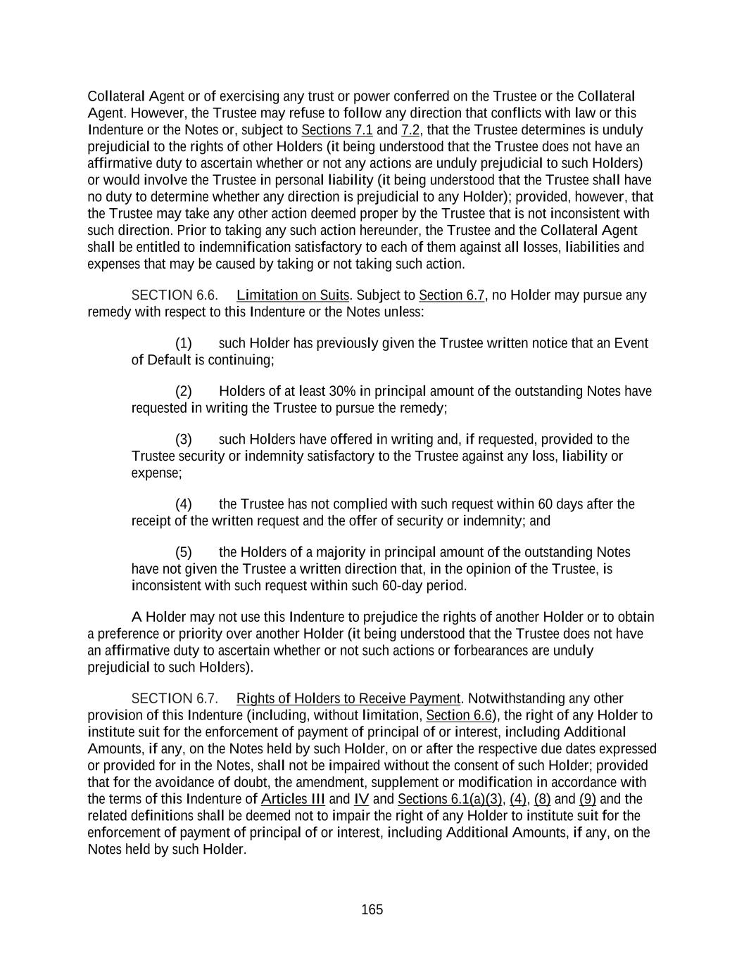 165 Collateral Agent or of exercising any trust or power conferred on the Trustee or the Collateral Agent. However, the Trustee may refuse to follow any direction that conflicts with law or this Indenture or the Notes or, subject to Sections 7.1 and 7.2, that the Trustee determines is unduly prejudicial to the rights of other Holders (it being understood that the Trustee does not have an affirmative duty to ascertain whether or not any actions are unduly prejudicial to such Holders) or would involve the Trustee in personal liability (it being understood that the Trustee shall have no duty to determine whether any direction is prejudicial to any Holder); provided, however, that the Trustee may take any other action deemed proper by the Trustee that is not inconsistent with such direction. Prior to taking any such action hereunder, the Trustee and the Collateral Agent shall be entitled to indemnification satisfactory to each of them against all losses, liabilities and expenses that may be caused by taking or not taking such action. SECTION 6.6. Limitation on Suits. Subject to Section 6.7, no Holder may pursue any remedy with respect to this Indenture or the Notes unless: (1) such Holder has previously given the Trustee written notice that an Event of Default is continuing; (2) Holders of at least 30% in principal amount of the outstanding Notes have requested in writing the Trustee to pursue the remedy; (3) such Holders have offered in writing and, if requested, provided to the Trustee security or indemnity satisfactory to the Trustee against any loss, liability or expense; (4) the Trustee has not complied with such request within 60 days after the receipt of the written request and the offer of security or indemnity; and (5) the Holders of a majority in principal amount of the outstanding Notes have not given the Trustee a written direction that, in the opinion of the Trustee, is inconsistent with such request within such 60-day period. A Holder may not use this Indenture to prejudice the rights of another Holder or to obtain a preference or priority over another Holder (it being understood that the Trustee does not have an affirmative duty to ascertain whether or not such actions or forbearances are unduly prejudicial to such Holders). SECTION 6.7. Rights of Holders to Receive Payment. Notwithstanding any other provision of this Indenture (including, without limitation, Section 6.6), the right of any Holder to institute suit for the enforcement of payment of principal of or interest, including Additional Amounts, if any, on the Notes held by such Holder, on or after the respective due dates expressed or provided for in the Notes, shall not be impaired without the consent of such Holder; provided that for the avoidance of doubt, the amendment, supplement or modification in accordance with the terms of this Indenture of Articles III and IV and Sections 6.1(a)(3), (4), (8) and (9) and the related definitions shall be deemed not to impair the right of any Holder to institute suit for the enforcement of payment of principal of or interest, including Additional Amounts, if any, on the Notes held by such Holder.