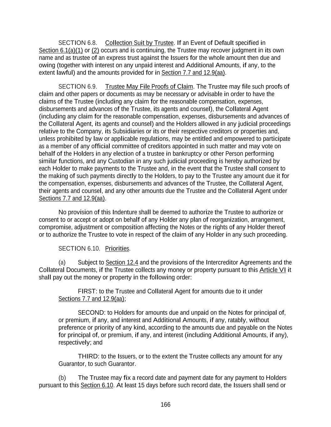 166 SECTION 6.8. Collection Suit by Trustee. If an Event of Default specified in Section 6.1(a)(1) or (2) occurs and is continuing, the Trustee may recover judgment in its own name and as trustee of an express trust against the Issuers for the whole amount then due and owing (together with interest on any unpaid interest and Additional Amounts, if any, to the extent lawful) and the amounts provided for in Section 7.7 and 12.9(aa). SECTION 6.9. Trustee May File Proofs of Claim. The Trustee may file such proofs of claim and other papers or documents as may be necessary or advisable in order to have the claims of the Trustee (including any claim for the reasonable compensation, expenses, disbursements and advances of the Trustee, its agents and counsel), the Collateral Agent (including any claim for the reasonable compensation, expenses, disbursements and advances of the Collateral Agent, its agents and counsel) and the Holders allowed in any judicial proceedings relative to the Company, its Subsidiaries or its or their respective creditors or properties and, unless prohibited by law or applicable regulations, may be entitled and empowered to participate as a member of any official committee of creditors appointed in such matter and may vote on behalf of the Holders in any election of a trustee in bankruptcy or other Person performing similar functions, and any Custodian in any such judicial proceeding is hereby authorized by each Holder to make payments to the Trustee and, in the event that the Trustee shall consent to the making of such payments directly to the Holders, to pay to the Trustee any amount due it for the compensation, expenses, disbursements and advances of the Trustee, the Collateral Agent, their agents and counsel, and any other amounts due the Trustee and the Collateral Agent under Sections 7.7 and 12.9(aa). No provision of this Indenture shall be deemed to authorize the Trustee to authorize or consent to or accept or adopt on behalf of any Holder any plan of reorganization, arrangement, compromise, adjustment or composition affecting the Notes or the rights of any Holder thereof or to authorize the Trustee to vote in respect of the claim of any Holder in any such proceeding. SECTION 6.10. Priorities. (a) Subject to Section 12.4 and the provisions of the Intercreditor Agreements and the Collateral Documents, if the Trustee collects any money or property pursuant to this Article VI it shall pay out the money or property in the following order: FIRST: to the Trustee and Collateral Agent for amounts due to it under Sections 7.7 and 12.9(aa); SECOND: to Holders for amounts due and unpaid on the Notes for principal of, or premium, if any, and interest and Additional Amounts, if any, ratably, without preference or priority of any kind, according to the amounts due and payable on the Notes for principal of, or premium, if any, and interest (including Additional Amounts, if any), respectively; and THIRD: to the Issuers, or to the extent the Trustee collects any amount for any Guarantor, to such Guarantor. (b) The Trustee may fix a record date and payment date for any payment to Holders pursuant to this Section 6.10. At least 15 days before such record date, the Issuers shall send or