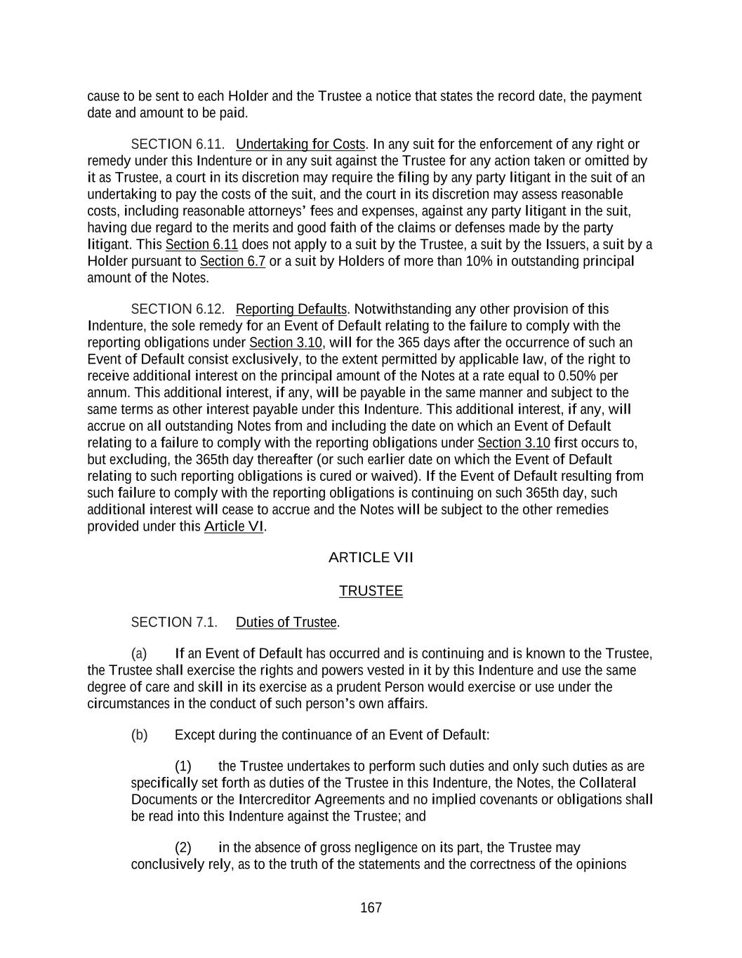 167 cause to be sent to each Holder and the Trustee a notice that states the record date, the payment date and amount to be paid. SECTION 6.11. Undertaking for Costs. In any suit for the enforcement of any right or remedy under this Indenture or in any suit against the Trustee for any action taken or omitted by it as Trustee, a court in its discretion may require the filing by any party litigant in the suit of an undertaking to pay the costs of the suit, and the court in its discretion may assess reasonable costs, including reasonable attorneys’ fees and expenses, against any party litigant in the suit, having due regard to the merits and good faith of the claims or defenses made by the party litigant. This Section 6.11 does not apply to a suit by the Trustee, a suit by the Issuers, a suit by a Holder pursuant to Section 6.7 or a suit by Holders of more than 10% in outstanding principal amount of the Notes. SECTION 6.12. Reporting Defaults. Notwithstanding any other provision of this Indenture, the sole remedy for an Event of Default relating to the failure to comply with the reporting obligations under Section 3.10, will for the 365 days after the occurrence of such an Event of Default consist exclusively, to the extent permitted by applicable law, of the right to receive additional interest on the principal amount of the Notes at a rate equal to 0.50% per annum. This additional interest, if any, will be payable in the same manner and subject to the same terms as other interest payable under this Indenture. This additional interest, if any, will accrue on all outstanding Notes from and including the date on which an Event of Default relating to a failure to comply with the reporting obligations under Section 3.10 first occurs to, but excluding, the 365th day thereafter (or such earlier date on which the Event of Default relating to such reporting obligations is cured or waived). If the Event of Default resulting from such failure to comply with the reporting obligations is continuing on such 365th day, such additional interest will cease to accrue and the Notes will be subject to the other remedies provided under this Article VI. ARTICLE VII TRUSTEE SECTION 7.1. Duties of Trustee. (a) If an Event of Default has occurred and is continuing and is known to the Trustee, the Trustee shall exercise the rights and powers vested in it by this Indenture and use the same degree of care and skill in its exercise as a prudent Person would exercise or use under the circumstances in the conduct of such person’s own affairs. (b) Except during the continuance of an Event of Default: (1) the Trustee undertakes to perform such duties and only such duties as are specifically set forth as duties of the Trustee in this Indenture, the Notes, the Collateral Documents or the Intercreditor Agreements and no implied covenants or obligations shall be read into this Indenture against the Trustee; and (2) in the absence of gross negligence on its part, the Trustee may conclusively rely, as to the truth of the statements and the correctness of the opinions