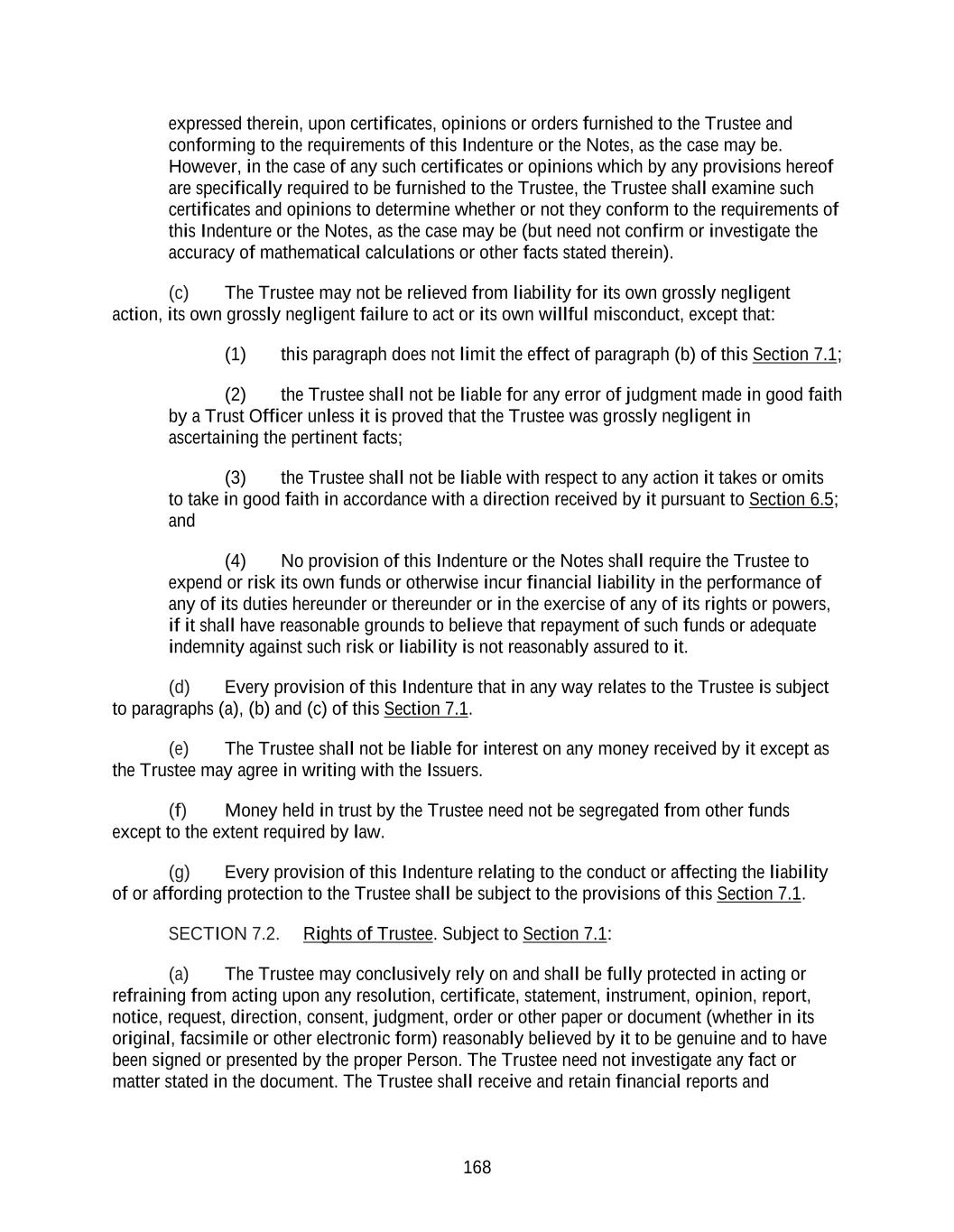 168 expressed therein, upon certificates, opinions or orders furnished to the Trustee and conforming to the requirements of this Indenture or the Notes, as the case may be. However, in the case of any such certificates or opinions which by any provisions hereof are specifically required to be furnished to the Trustee, the Trustee shall examine such certificates and opinions to determine whether or not they conform to the requirements of this Indenture or the Notes, as the case may be (but need not confirm or investigate the accuracy of mathematical calculations or other facts stated therein). (c) The Trustee may not be relieved from liability for its own grossly negligent action, its own grossly negligent failure to act or its own willful misconduct, except that: (1) this paragraph does not limit the effect of paragraph (b) of this Section 7.1; (2) the Trustee shall not be liable for any error of judgment made in good faith by a Trust Officer unless it is proved that the Trustee was grossly negligent in ascertaining the pertinent facts; (3) the Trustee shall not be liable with respect to any action it takes or omits to take in good faith in accordance with a direction received by it pursuant to Section 6.5; and (4) No provision of this Indenture or the Notes shall require the Trustee to expend or risk its own funds or otherwise incur financial liability in the performance of any of its duties hereunder or thereunder or in the exercise of any of its rights or powers, if it shall have reasonable grounds to believe that repayment of such funds or adequate indemnity against such risk or liability is not reasonably assured to it. (d) Every provision of this Indenture that in any way relates to the Trustee is subject to paragraphs (a), (b) and (c) of this Section 7.1. (e) The Trustee shall not be liable for interest on any money received by it except as the Trustee may agree in writing with the Issuers. (f) Money held in trust by the Trustee need not be segregated from other funds except to the extent required by law. (g) Every provision of this Indenture relating to the conduct or affecting the liability of or affording protection to the Trustee shall be subject to the provisions of this Section 7.1. SECTION 7.2. Rights of Trustee. Subject to Section 7.1: (a) The Trustee may conclusively rely on and shall be fully protected in acting or refraining from acting upon any resolution, certificate, statement, instrument, opinion, report, notice, request, direction, consent, judgment, order or other paper or document (whether in its original, facsimile or other electronic form) reasonably believed by it to be genuine and to have been signed or presented by the proper Person. The Trustee need not investigate any fact or matter stated in the document. The Trustee shall receive and retain financial reports and