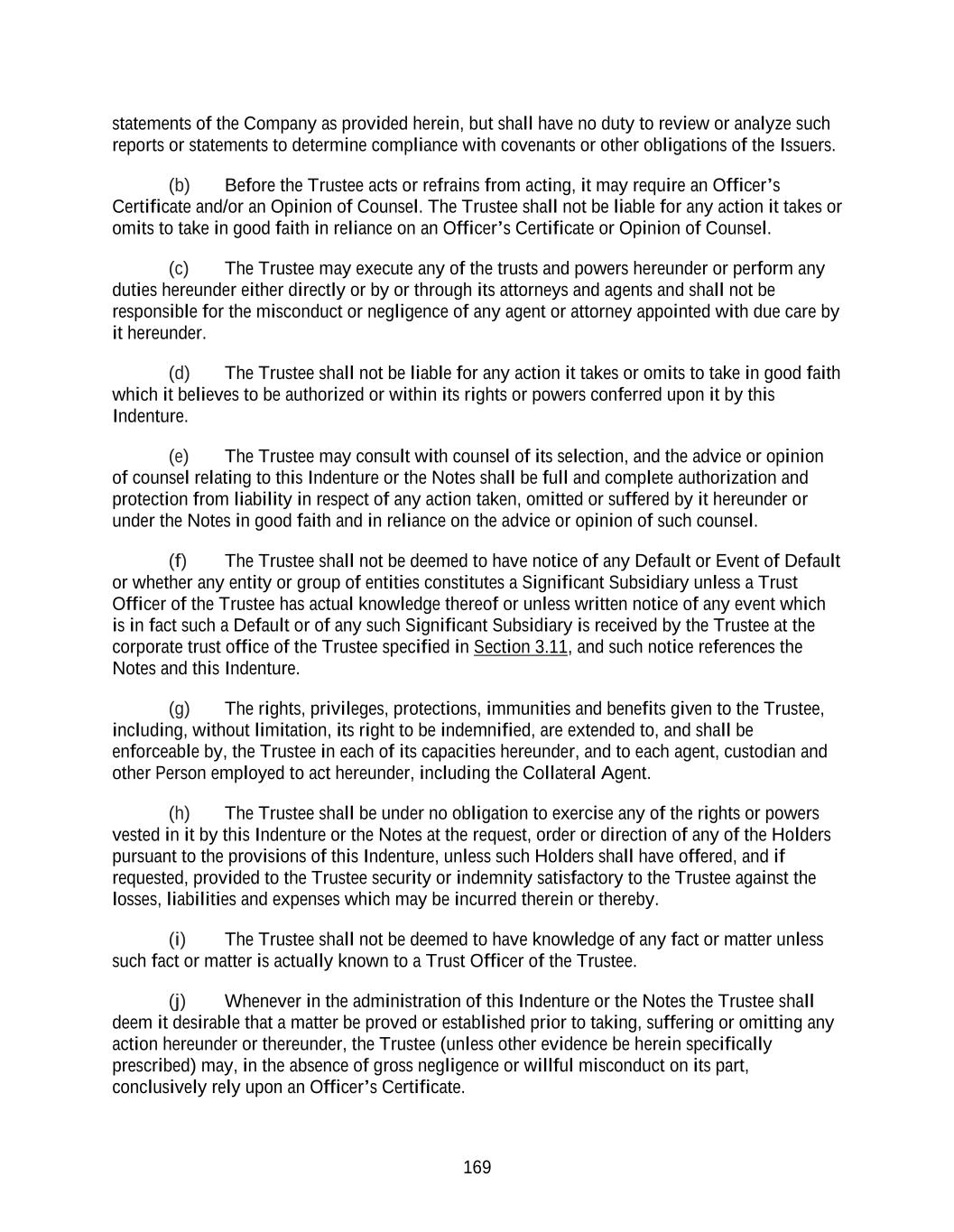 169 statements of the Company as provided herein, but shall have no duty to review or analyze such reports or statements to determine compliance with covenants or other obligations of the Issuers. (b) Before the Trustee acts or refrains from acting, it may require an Officer’s Certificate and/or an Opinion of Counsel. The Trustee shall not be liable for any action it takes or omits to take in good faith in reliance on an Officer’s Certificate or Opinion of Counsel. (c) The Trustee may execute any of the trusts and powers hereunder or perform any duties hereunder either directly or by or through its attorneys and agents and shall not be responsible for the misconduct or negligence of any agent or attorney appointed with due care by it hereunder. (d) The Trustee shall not be liable for any action it takes or omits to take in good faith which it believes to be authorized or within its rights or powers conferred upon it by this Indenture. (e) The Trustee may consult with counsel of its selection, and the advice or opinion of counsel relating to this Indenture or the Notes shall be full and complete authorization and protection from liability in respect of any action taken, omitted or suffered by it hereunder or under the Notes in good faith and in reliance on the advice or opinion of such counsel. (f) The Trustee shall not be deemed to have notice of any Default or Event of Default or whether any entity or group of entities constitutes a Significant Subsidiary unless a Trust Officer of the Trustee has actual knowledge thereof or unless written notice of any event which is in fact such a Default or of any such Significant Subsidiary is received by the Trustee at the corporate trust office of the Trustee specified in Section 3.11, and such notice references the Notes and this Indenture. (g) The rights, privileges, protections, immunities and benefits given to the Trustee, including, without limitation, its right to be indemnified, are extended to, and shall be enforceable by, the Trustee in each of its capacities hereunder, and to each agent, custodian and other Person employed to act hereunder, including the Collateral Agent. (h) The Trustee shall be under no obligation to exercise any of the rights or powers vested in it by this Indenture or the Notes at the request, order or direction of any of the Holders pursuant to the provisions of this Indenture, unless such Holders shall have offered, and if requested, provided to the Trustee security or indemnity satisfactory to the Trustee against the losses, liabilities and expenses which may be incurred therein or thereby. (i) The Trustee shall not be deemed to have knowledge of any fact or matter unless such fact or matter is actually known to a Trust Officer of the Trustee. (j) Whenever in the administration of this Indenture or the Notes the Trustee shall deem it desirable that a matter be proved or established prior to taking, suffering or omitting any action hereunder or thereunder, the Trustee (unless other evidence be herein specifically prescribed) may, in the absence of gross negligence or willful misconduct on its part, conclusively rely upon an Officer’s Certificate.