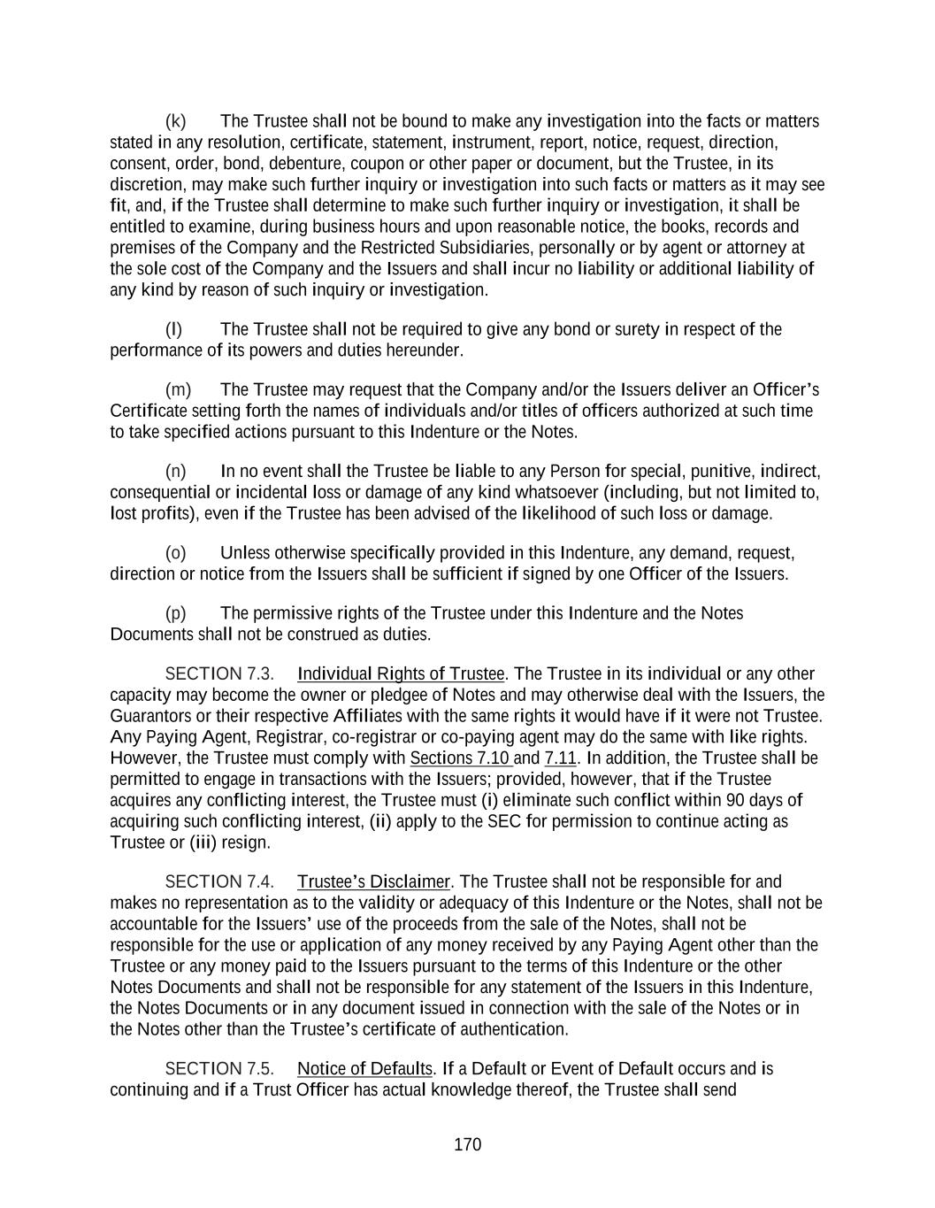 170 (k) The Trustee shall not be bound to make any investigation into the facts or matters stated in any resolution, certificate, statement, instrument, report, notice, request, direction, consent, order, bond, debenture, coupon or other paper or document, but the Trustee, in its discretion, may make such further inquiry or investigation into such facts or matters as it may see fit, and, if the Trustee shall determine to make such further inquiry or investigation, it shall be entitled to examine, during business hours and upon reasonable notice, the books, records and premises of the Company and the Restricted Subsidiaries, personally or by agent or attorney at the sole cost of the Company and the Issuers and shall incur no liability or additional liability of any kind by reason of such inquiry or investigation. (l) The Trustee shall not be required to give any bond or surety in respect of the performance of its powers and duties hereunder. (m) The Trustee may request that the Company and/or the Issuers deliver an Officer’s Certificate setting forth the names of individuals and/or titles of officers authorized at such time to take specified actions pursuant to this Indenture or the Notes. (n) In no event shall the Trustee be liable to any Person for special, punitive, indirect, consequential or incidental loss or damage of any kind whatsoever (including, but not limited to, lost profits), even if the Trustee has been advised of the likelihood of such loss or damage. (o) Unless otherwise specifically provided in this Indenture, any demand, request, direction or notice from the Issuers shall be sufficient if signed by one Officer of the Issuers. (p) The permissive rights of the Trustee under this Indenture and the Notes Documents shall not be construed as duties. SECTION 7.3. Individual Rights of Trustee. The Trustee in its individual or any other capacity may become the owner or pledgee of Notes and may otherwise deal with the Issuers, the Guarantors or their respective Affiliates with the same rights it would have if it were not Trustee. Any Paying Agent, Registrar, co-registrar or co-paying agent may do the same with like rights. However, the Trustee must comply with Sections 7.10 and 7.11. In addition, the Trustee shall be permitted to engage in transactions with the Issuers; provided, however, that if the Trustee acquires any conflicting interest, the Trustee must (i) eliminate such conflict within 90 days of acquiring such conflicting interest, (ii) apply to the SEC for permission to continue acting as Trustee or (iii) resign. SECTION 7.4. Trustee’s Disclaimer. The Trustee shall not be responsible for and makes no representation as to the validity or adequacy of this Indenture or the Notes, shall not be accountable for the Issuers’ use of the proceeds from the sale of the Notes, shall not be responsible for the use or application of any money received by any Paying Agent other than the Trustee or any money paid to the Issuers pursuant to the terms of this Indenture or the other Notes Documents and shall not be responsible for any statement of the Issuers in this Indenture, the Notes Documents or in any document issued in connection with the sale of the Notes or in the Notes other than the Trustee’s certificate of authentication. SECTION 7.5. Notice of Defaults. If a Default or Event of Default occurs and is continuing and if a Trust Officer has actual knowledge thereof, the Trustee shall send