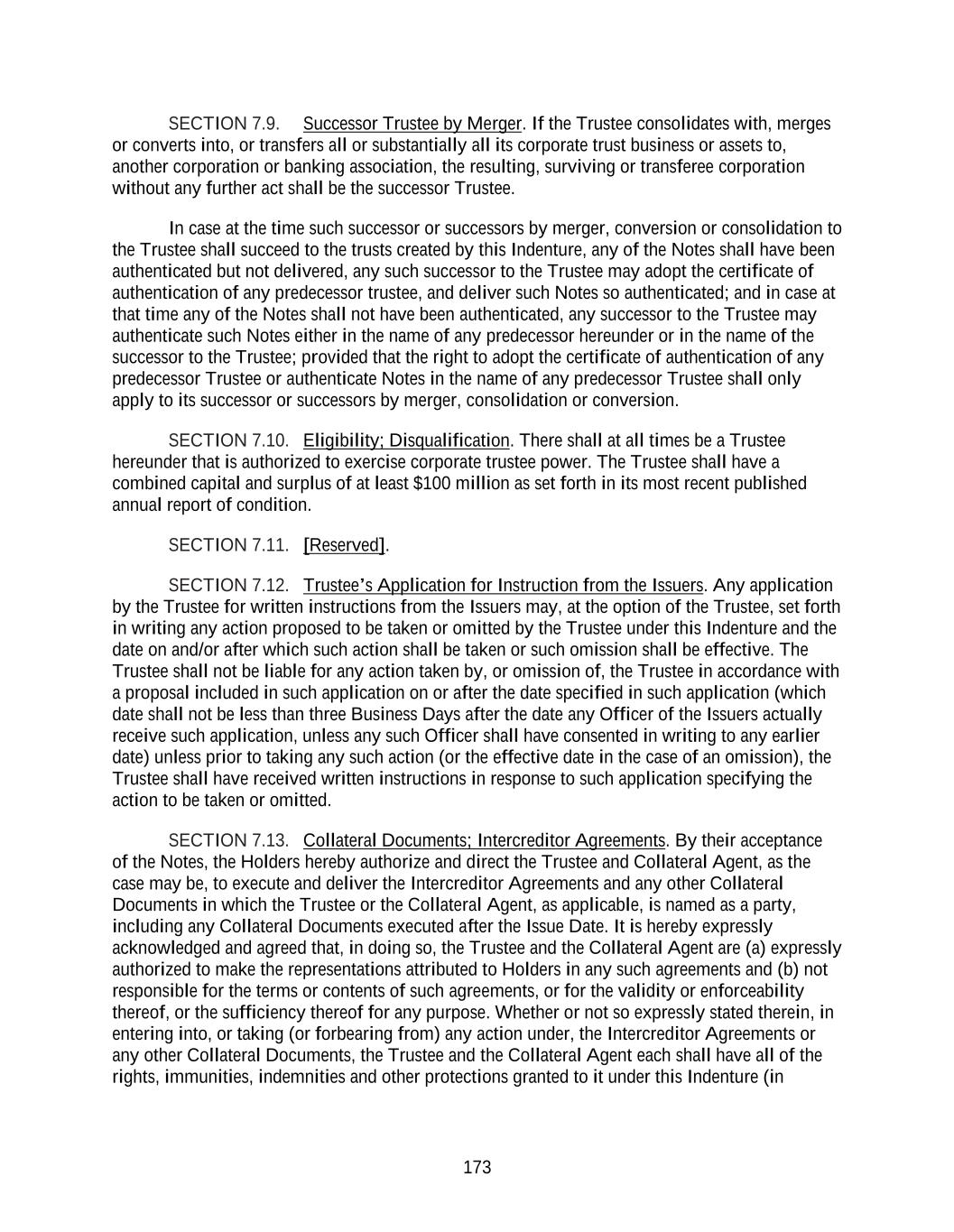 173 SECTION 7.9. Successor Trustee by Merger. If the Trustee consolidates with, merges or converts into, or transfers all or substantially all its corporate trust business or assets to, another corporation or banking association, the resulting, surviving or transferee corporation without any further act shall be the successor Trustee. In case at the time such successor or successors by merger, conversion or consolidation to the Trustee shall succeed to the trusts created by this Indenture, any of the Notes shall have been authenticated but not delivered, any such successor to the Trustee may adopt the certificate of authentication of any predecessor trustee, and deliver such Notes so authenticated; and in case at that time any of the Notes shall not have been authenticated, any successor to the Trustee may authenticate such Notes either in the name of any predecessor hereunder or in the name of the successor to the Trustee; provided that the right to adopt the certificate of authentication of any predecessor Trustee or authenticate Notes in the name of any predecessor Trustee shall only apply to its successor or successors by merger, consolidation or conversion. SECTION 7.10. Eligibility; Disqualification. There shall at all times be a Trustee hereunder that is authorized to exercise corporate trustee power. The Trustee shall have a combined capital and surplus of at least $100 million as set forth in its most recent published annual report of condition. SECTION 7.11. [Reserved]. SECTION 7.12. Trustee’s Application for Instruction from the Issuers. Any application by the Trustee for written instructions from the Issuers may, at the option of the Trustee, set forth in writing any action proposed to be taken or omitted by the Trustee under this Indenture and the date on and/or after which such action shall be taken or such omission shall be effective. The Trustee shall not be liable for any action taken by, or omission of, the Trustee in accordance with a proposal included in such application on or after the date specified in such application (which date shall not be less than three Business Days after the date any Officer of the Issuers actually receive such application, unless any such Officer shall have consented in writing to any earlier date) unless prior to taking any such action (or the effective date in the case of an omission), the Trustee shall have received written instructions in response to such application specifying the action to be taken or omitted. SECTION 7.13. Collateral Documents; Intercreditor Agreements. By their acceptance of the Notes, the Holders hereby authorize and direct the Trustee and Collateral Agent, as the case may be, to execute and deliver the Intercreditor Agreements and any other Collateral Documents in which the Trustee or the Collateral Agent, as applicable, is named as a party, including any Collateral Documents executed after the Issue Date. It is hereby expressly acknowledged and agreed that, in doing so, the Trustee and the Collateral Agent are (a) expressly authorized to make the representations attributed to Holders in any such agreements and (b) not responsible for the terms or contents of such agreements, or for the validity or enforceability thereof, or the sufficiency thereof for any purpose. Whether or not so expressly stated therein, in entering into, or taking (or forbearing from) any action under, the Intercreditor Agreements or any other Collateral Documents, the Trustee and the Collateral Agent each shall have all of the rights, immunities, indemnities and other protections granted to it under this Indenture (in