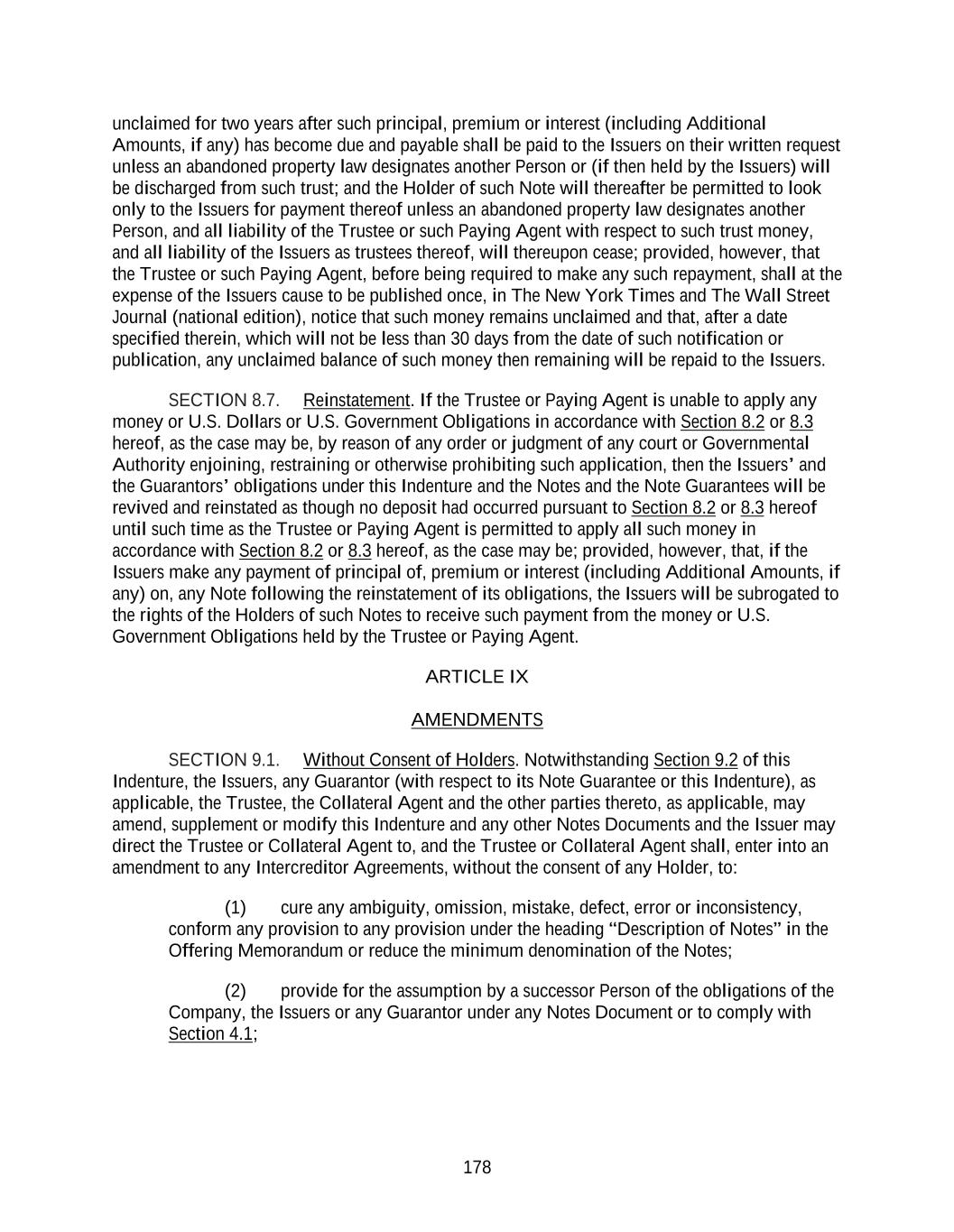 178 unclaimed for two years after such principal, premium or interest (including Additional Amounts, if any) has become due and payable shall be paid to the Issuers on their written request unless an abandoned property law designates another Person or (if then held by the Issuers) will be discharged from such trust; and the Holder of such Note will thereafter be permitted to look only to the Issuers for payment thereof unless an abandoned property law designates another Person, and all liability of the Trustee or such Paying Agent with respect to such trust money, and all liability of the Issuers as trustees thereof, will thereupon cease; provided, however, that the Trustee or such Paying Agent, before being required to make any such repayment, shall at the expense of the Issuers cause to be published once, in The New York Times and The Wall Street Journal (national edition), notice that such money remains unclaimed and that, after a date specified therein, which will not be less than 30 days from the date of such notification or publication, any unclaimed balance of such money then remaining will be repaid to the Issuers. SECTION 8.7. Reinstatement. If the Trustee or Paying Agent is unable to apply any money or U.S. Dollars or U.S. Government Obligations in accordance with Section 8.2 or 8.3 hereof, as the case may be, by reason of any order or judgment of any court or Governmental Authority enjoining, restraining or otherwise prohibiting such application, then the Issuers’ and the Guarantors’ obligations under this Indenture and the Notes and the Note Guarantees will be revived and reinstated as though no deposit had occurred pursuant to Section 8.2 or 8.3 hereof until such time as the Trustee or Paying Agent is permitted to apply all such money in accordance with Section 8.2 or 8.3 hereof, as the case may be; provided, however, that, if the Issuers make any payment of principal of, premium or interest (including Additional Amounts, if any) on, any Note following the reinstatement of its obligations, the Issuers will be subrogated to the rights of the Holders of such Notes to receive such payment from the money or U.S. Government Obligations held by the Trustee or Paying Agent. ARTICLE IX AMENDMENTS SECTION 9.1. Without Consent of Holders. Notwithstanding Section 9.2 of this Indenture, the Issuers, any Guarantor (with respect to its Note Guarantee or this Indenture), as applicable, the Trustee, the Collateral Agent and the other parties thereto, as applicable, may amend, supplement or modify this Indenture and any other Notes Documents and the Issuer may direct the Trustee or Collateral Agent to, and the Trustee or Collateral Agent shall, enter into an amendment to any Intercreditor Agreements, without the consent of any Holder, to: (1) cure any ambiguity, omission, mistake, defect, error or inconsistency, conform any provision to any provision under the heading “Description of Notes” in the Offering Memorandum or reduce the minimum denomination of the Notes; (2) provide for the assumption by a successor Person of the obligations of the Company, the Issuers or any Guarantor under any Notes Document or to comply with Section 4.1;