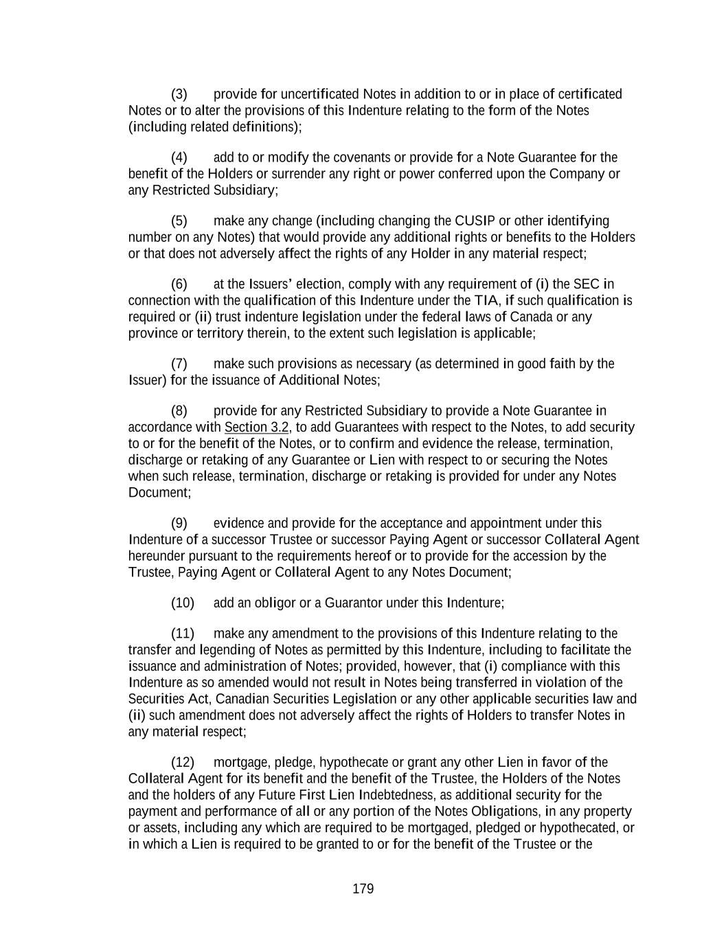 179 (3) provide for uncertificated Notes in addition to or in place of certificated Notes or to alter the provisions of this Indenture relating to the form of the Notes (including related definitions); (4) add to or modify the covenants or provide for a Note Guarantee for the benefit of the Holders or surrender any right or power conferred upon the Company or any Restricted Subsidiary; (5) make any change (including changing the CUSIP or other identifying number on any Notes) that would provide any additional rights or benefits to the Holders or that does not adversely affect the rights of any Holder in any material respect; (6) at the Issuers’ election, comply with any requirement of (i) the SEC in connection with the qualification of this Indenture under the TIA, if such qualification is required or (ii) trust indenture legislation under the federal laws of Canada or any province or territory therein, to the extent such legislation is applicable; (7) make such provisions as necessary (as determined in good faith by the Issuer) for the issuance of Additional Notes; (8) provide for any Restricted Subsidiary to provide a Note Guarantee in accordance with Section 3.2, to add Guarantees with respect to the Notes, to add security to or for the benefit of the Notes, or to confirm and evidence the release, termination, discharge or retaking of any Guarantee or Lien with respect to or securing the Notes when such release, termination, discharge or retaking is provided for under any Notes Document; (9) evidence and provide for the acceptance and appointment under this Indenture of a successor Trustee or successor Paying Agent or successor Collateral Agent hereunder pursuant to the requirements hereof or to provide for the accession by the Trustee, Paying Agent or Collateral Agent to any Notes Document; (10) add an obligor or a Guarantor under this Indenture; (11) make any amendment to the provisions of this Indenture relating to the transfer and legending of Notes as permitted by this Indenture, including to facilitate the issuance and administration of Notes; provided, however, that (i) compliance with this Indenture as so amended would not result in Notes being transferred in violation of the Securities Act, Canadian Securities Legislation or any other applicable securities law and (ii) such amendment does not adversely affect the rights of Holders to transfer Notes in any material respect; (12) mortgage, pledge, hypothecate or grant any other Lien in favor of the Collateral Agent for its benefit and the benefit of the Trustee, the Holders of the Notes and the holders of any Future First Lien Indebtedness, as additional security for the payment and performance of all or any portion of the Notes Obligations, in any property or assets, including any which are required to be mortgaged, pledged or hypothecated, or in which a Lien is required to be granted to or for the benefit of the Trustee or the
