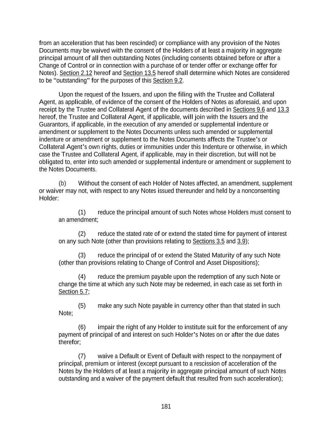 181 from an acceleration that has been rescinded) or compliance with any provision of the Notes Documents may be waived with the consent of the Holders of at least a majority in aggregate principal amount of all then outstanding Notes (including consents obtained before or after a Change of Control or in connection with a purchase of or tender offer or exchange offer for Notes). Section 2.12 hereof and Section 13.5 hereof shall determine which Notes are considered to be “outstanding” for the purposes of this Section 9.2. Upon the request of the Issuers, and upon the filing with the Trustee and Collateral Agent, as applicable, of evidence of the consent of the Holders of Notes as aforesaid, and upon receipt by the Trustee and Collateral Agent of the documents described in Sections 9.6 and 13.3 hereof, the Trustee and Collateral Agent, if applicable, will join with the Issuers and the Guarantors, if applicable, in the execution of any amended or supplemental indenture or amendment or supplement to the Notes Documents unless such amended or supplemental indenture or amendment or supplement to the Notes Documents affects the Trustee’s or Collateral Agent’s own rights, duties or immunities under this Indenture or otherwise, in which case the Trustee and Collateral Agent, if applicable, may in their discretion, but will not be obligated to, enter into such amended or supplemental indenture or amendment or supplement to the Notes Documents. (b) Without the consent of each Holder of Notes affected, an amendment, supplement or waiver may not, with respect to any Notes issued thereunder and held by a nonconsenting Holder: (1) reduce the principal amount of such Notes whose Holders must consent to an amendment; (2) reduce the stated rate of or extend the stated time for payment of interest on any such Note (other than provisions relating to Sections 3.5 and 3.9); (3) reduce the principal of or extend the Stated Maturity of any such Note (other than provisions relating to Change of Control and Asset Dispositions); (4) reduce the premium payable upon the redemption of any such Note or change the time at which any such Note may be redeemed, in each case as set forth in Section 5.7; (5) make any such Note payable in currency other than that stated in such Note; (6) impair the right of any Holder to institute suit for the enforcement of any payment of principal of and interest on such Holder’s Notes on or after the due dates therefor; (7) waive a Default or Event of Default with respect to the nonpayment of principal, premium or interest (except pursuant to a rescission of acceleration of the Notes by the Holders of at least a majority in aggregate principal amount of such Notes outstanding and a waiver of the payment default that resulted from such acceleration);