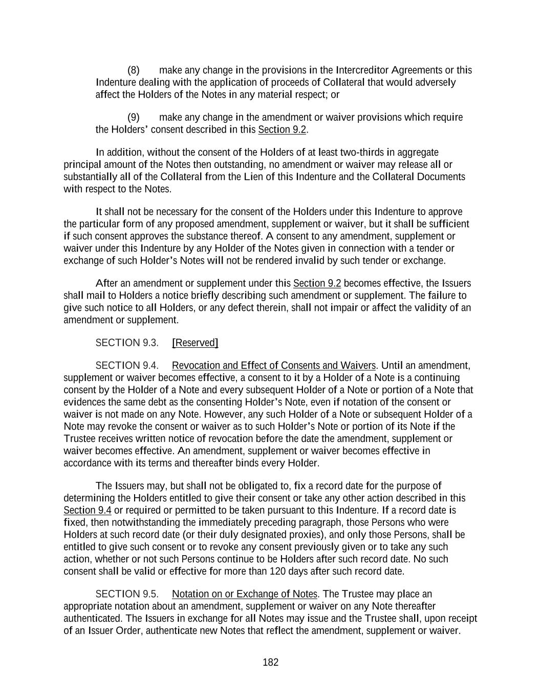 182 (8) make any change in the provisions in the Intercreditor Agreements or this Indenture dealing with the application of proceeds of Collateral that would adversely affect the Holders of the Notes in any material respect; or (9) make any change in the amendment or waiver provisions which require the Holders’ consent described in this Section 9.2. In addition, without the consent of the Holders of at least two-thirds in aggregate principal amount of the Notes then outstanding, no amendment or waiver may release all or substantially all of the Collateral from the Lien of this Indenture and the Collateral Documents with respect to the Notes. It shall not be necessary for the consent of the Holders under this Indenture to approve the particular form of any proposed amendment, supplement or waiver, but it shall be sufficient if such consent approves the substance thereof. A consent to any amendment, supplement or waiver under this Indenture by any Holder of the Notes given in connection with a tender or exchange of such Holder’s Notes will not be rendered invalid by such tender or exchange. After an amendment or supplement under this Section 9.2 becomes effective, the Issuers shall mail to Holders a notice briefly describing such amendment or supplement. The failure to give such notice to all Holders, or any defect therein, shall not impair or affect the validity of an amendment or supplement. SECTION 9.3. [Reserved] SECTION 9.4. Revocation and Effect of Consents and Waivers. Until an amendment, supplement or waiver becomes effective, a consent to it by a Holder of a Note is a continuing consent by the Holder of a Note and every subsequent Holder of a Note or portion of a Note that evidences the same debt as the consenting Holder’s Note, even if notation of the consent or waiver is not made on any Note. However, any such Holder of a Note or subsequent Holder of a Note may revoke the consent or waiver as to such Holder’s Note or portion of its Note if the Trustee receives written notice of revocation before the date the amendment, supplement or waiver becomes effective. An amendment, supplement or waiver becomes effective in accordance with its terms and thereafter binds every Holder. The Issuers may, but shall not be obligated to, fix a record date for the purpose of determining the Holders entitled to give their consent or take any other action described in this Section 9.4 or required or permitted to be taken pursuant to this Indenture. If a record date is fixed, then notwithstanding the immediately preceding paragraph, those Persons who were Holders at such record date (or their duly designated proxies), and only those Persons, shall be entitled to give such consent or to revoke any consent previously given or to take any such action, whether or not such Persons continue to be Holders after such record date. No such consent shall be valid or effective for more than 120 days after such record date. SECTION 9.5. Notation on or Exchange of Notes. The Trustee may place an appropriate notation about an amendment, supplement or waiver on any Note thereafter authenticated. The Issuers in exchange for all Notes may issue and the Trustee shall, upon receipt of an Issuer Order, authenticate new Notes that reflect the amendment, supplement or waiver.