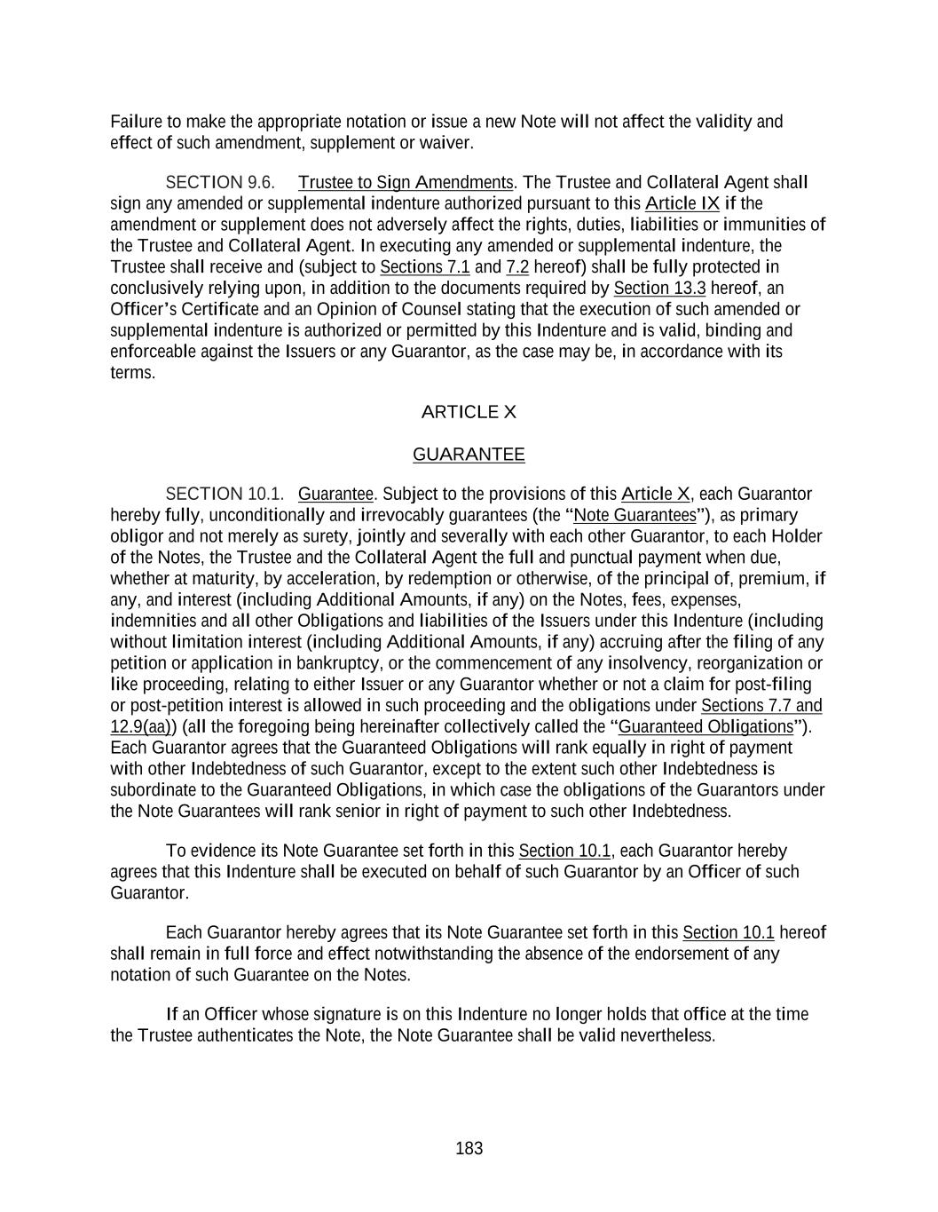 183 Failure to make the appropriate notation or issue a new Note will not affect the validity and effect of such amendment, supplement or waiver. SECTION 9.6. Trustee to Sign Amendments. The Trustee and Collateral Agent shall sign any amended or supplemental indenture authorized pursuant to this Article IX if the amendment or supplement does not adversely affect the rights, duties, liabilities or immunities of the Trustee and Collateral Agent. In executing any amended or supplemental indenture, the Trustee shall receive and (subject to Sections 7.1 and 7.2 hereof) shall be fully protected in conclusively relying upon, in addition to the documents required by Section 13.3 hereof, an Officer’s Certificate and an Opinion of Counsel stating that the execution of such amended or supplemental indenture is authorized or permitted by this Indenture and is valid, binding and enforceable against the Issuers or any Guarantor, as the case may be, in accordance with its terms. ARTICLE X GUARANTEE SECTION 10.1. Guarantee. Subject to the provisions of this Article X, each Guarantor hereby fully, unconditionally and irrevocably guarantees (the “Note Guarantees”), as primary obligor and not merely as surety, jointly and severally with each other Guarantor, to each Holder of the Notes, the Trustee and the Collateral Agent the full and punctual payment when due, whether at maturity, by acceleration, by redemption or otherwise, of the principal of, premium, if any, and interest (including Additional Amounts, if any) on the Notes, fees, expenses, indemnities and all other Obligations and liabilities of the Issuers under this Indenture (including without limitation interest (including Additional Amounts, if any) accruing after the filing of any petition or application in bankruptcy, or the commencement of any insolvency, reorganization or like proceeding, relating to either Issuer or any Guarantor whether or not a claim for post-filing or post-petition interest is allowed in such proceeding and the obligations under Sections 7.7 and 12.9(aa)) (all the foregoing being hereinafter collectively called the “Guaranteed Obligations”). Each Guarantor agrees that the Guaranteed Obligations will rank equally in right of payment with other Indebtedness of such Guarantor, except to the extent such other Indebtedness is subordinate to the Guaranteed Obligations, in which case the obligations of the Guarantors under the Note Guarantees will rank senior in right of payment to such other Indebtedness. To evidence its Note Guarantee set forth in this Section 10.1, each Guarantor hereby agrees that this Indenture shall be executed on behalf of such Guarantor by an Officer of such Guarantor. Each Guarantor hereby agrees that its Note Guarantee set forth in this Section 10.1 hereof shall remain in full force and effect notwithstanding the absence of the endorsement of any notation of such Guarantee on the Notes. If an Officer whose signature is on this Indenture no longer holds that office at the time the Trustee authenticates the Note, the Note Guarantee shall be valid nevertheless.