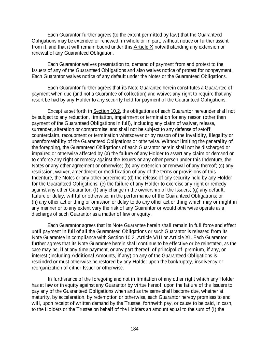 184 Each Guarantor further agrees (to the extent permitted by law) that the Guaranteed Obligations may be extended or renewed, in whole or in part, without notice or further assent from it, and that it will remain bound under this Article X notwithstanding any extension or renewal of any Guaranteed Obligation. Each Guarantor waives presentation to, demand of payment from and protest to the Issuers of any of the Guaranteed Obligations and also waives notice of protest for nonpayment. Each Guarantor waives notice of any default under the Notes or the Guaranteed Obligations. Each Guarantor further agrees that its Note Guarantee herein constitutes a Guarantee of payment when due (and not a Guarantee of collection) and waives any right to require that any resort be had by any Holder to any security held for payment of the Guaranteed Obligations. Except as set forth in Section 10.2, the obligations of each Guarantor hereunder shall not be subject to any reduction, limitation, impairment or termination for any reason (other than payment of the Guaranteed Obligations in full), including any claim of waiver, release, surrender, alteration or compromise, and shall not be subject to any defense of setoff, counterclaim, recoupment or termination whatsoever or by reason of the invalidity, illegality or unenforceability of the Guaranteed Obligations or otherwise. Without limiting the generality of the foregoing, the Guaranteed Obligations of each Guarantor herein shall not be discharged or impaired or otherwise affected by (a) the failure of any Holder to assert any claim or demand or to enforce any right or remedy against the Issuers or any other person under this Indenture, the Notes or any other agreement or otherwise; (b) any extension or renewal of any thereof; (c) any rescission, waiver, amendment or modification of any of the terms or provisions of this Indenture, the Notes or any other agreement; (d) the release of any security held by any Holder for the Guaranteed Obligations; (e) the failure of any Holder to exercise any right or remedy against any other Guarantor; (f) any change in the ownership of the Issuers; (g) any default, failure or delay, willful or otherwise, in the performance of the Guaranteed Obligations; or (h) any other act or thing or omission or delay to do any other act or thing which may or might in any manner or to any extent vary the risk of any Guarantor or would otherwise operate as a discharge of such Guarantor as a matter of law or equity. Each Guarantor agrees that its Note Guarantee herein shall remain in full force and effect until payment in full of all the Guaranteed Obligations or such Guarantor is released from its Note Guarantee in compliance with Section 10.2, Article VIII or Article XI. Each Guarantor further agrees that its Note Guarantee herein shall continue to be effective or be reinstated, as the case may be, if at any time payment, or any part thereof, of principal of, premium, if any, or interest (including Additional Amounts, if any) on any of the Guaranteed Obligations is rescinded or must otherwise be restored by any Holder upon the bankruptcy, insolvency or reorganization of either Issuer or otherwise. In furtherance of the foregoing and not in limitation of any other right which any Holder has at law or in equity against any Guarantor by virtue hereof, upon the failure of the Issuers to pay any of the Guaranteed Obligations when and as the same shall become due, whether at maturity, by acceleration, by redemption or otherwise, each Guarantor hereby promises to and will, upon receipt of written demand by the Trustee, forthwith pay, or cause to be paid, in cash, to the Holders or the Trustee on behalf of the Holders an amount equal to the sum of (i) the