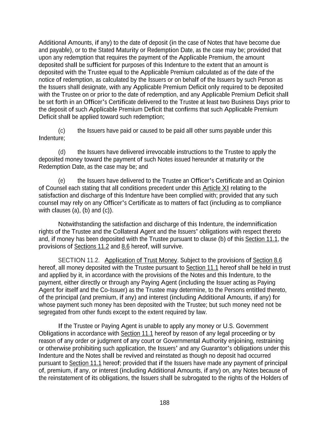 188 Additional Amounts, if any) to the date of deposit (in the case of Notes that have become due and payable), or to the Stated Maturity or Redemption Date, as the case may be; provided that upon any redemption that requires the payment of the Applicable Premium, the amount deposited shall be sufficient for purposes of this Indenture to the extent that an amount is deposited with the Trustee equal to the Applicable Premium calculated as of the date of the notice of redemption, as calculated by the Issuers or on behalf of the Issuers by such Person as the Issuers shall designate, with any Applicable Premium Deficit only required to be deposited with the Trustee on or prior to the date of redemption, and any Applicable Premium Deficit shall be set forth in an Officer’s Certificate delivered to the Trustee at least two Business Days prior to the deposit of such Applicable Premium Deficit that confirms that such Applicable Premium Deficit shall be applied toward such redemption; (c) the Issuers have paid or caused to be paid all other sums payable under this Indenture; (d) the Issuers have delivered irrevocable instructions to the Trustee to apply the deposited money toward the payment of such Notes issued hereunder at maturity or the Redemption Date, as the case may be; and (e) the Issuers have delivered to the Trustee an Officer’s Certificate and an Opinion of Counsel each stating that all conditions precedent under this Article XI relating to the satisfaction and discharge of this Indenture have been complied with; provided that any such counsel may rely on any Officer’s Certificate as to matters of fact (including as to compliance with clauses (a), (b) and (c)). Notwithstanding the satisfaction and discharge of this Indenture, the indemnification rights of the Trustee and the Collateral Agent and the Issuers’ obligations with respect thereto and, if money has been deposited with the Trustee pursuant to clause (b) of this Section 11.1, the provisions of Sections 11.2 and 8.6 hereof, will survive. SECTION 11.2. Application of Trust Money. Subject to the provisions of Section 8.6 hereof, all money deposited with the Trustee pursuant to Section 11.1 hereof shall be held in trust and applied by it, in accordance with the provisions of the Notes and this Indenture, to the payment, either directly or through any Paying Agent (including the Issuer acting as Paying Agent for itself and the Co-Issuer) as the Trustee may determine, to the Persons entitled thereto, of the principal (and premium, if any) and interest (including Additional Amounts, if any) for whose payment such money has been deposited with the Trustee; but such money need not be segregated from other funds except to the extent required by law. If the Trustee or Paying Agent is unable to apply any money or U.S. Government Obligations in accordance with Section 11.1 hereof by reason of any legal proceeding or by reason of any order or judgment of any court or Governmental Authority enjoining, restraining or otherwise prohibiting such application, the Issuers’ and any Guarantor’s obligations under this Indenture and the Notes shall be revived and reinstated as though no deposit had occurred pursuant to Section 11.1 hereof; provided that if the Issuers have made any payment of principal of, premium, if any, or interest (including Additional Amounts, if any) on, any Notes because of the reinstatement of its obligations, the Issuers shall be subrogated to the rights of the Holders of