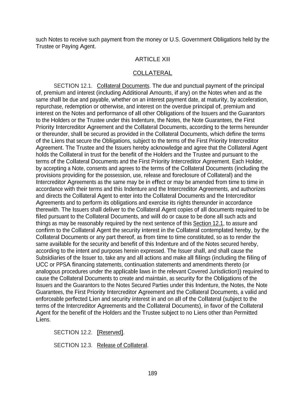 189 such Notes to receive such payment from the money or U.S. Government Obligations held by the Trustee or Paying Agent. ARTICLE XII COLLATERAL SECTION 12.1. Collateral Documents. The due and punctual payment of the principal of, premium and interest (including Additional Amounts, if any) on the Notes when and as the same shall be due and payable, whether on an interest payment date, at maturity, by acceleration, repurchase, redemption or otherwise, and interest on the overdue principal of, premium and interest on the Notes and performance of all other Obligations of the Issuers and the Guarantors to the Holders or the Trustee under this Indenture, the Notes, the Note Guarantees, the First Priority Intercreditor Agreement and the Collateral Documents, according to the terms hereunder or thereunder, shall be secured as provided in the Collateral Documents, which define the terms of the Liens that secure the Obligations, subject to the terms of the First Priority Intercreditor Agreement. The Trustee and the Issuers hereby acknowledge and agree that the Collateral Agent holds the Collateral in trust for the benefit of the Holders and the Trustee and pursuant to the terms of the Collateral Documents and the First Priority Intercreditor Agreement. Each Holder, by accepting a Note, consents and agrees to the terms of the Collateral Documents (including the provisions providing for the possession, use, release and foreclosure of Collateral) and the Intercreditor Agreements as the same may be in effect or may be amended from time to time in accordance with their terms and this Indenture and the Intercreditor Agreements, and authorizes and directs the Collateral Agent to enter into the Collateral Documents and the Intercreditor Agreements and to perform its obligations and exercise its rights thereunder in accordance therewith. The Issuers shall deliver to the Collateral Agent copies of all documents required to be filed pursuant to the Collateral Documents, and will do or cause to be done all such acts and things as may be reasonably required by the next sentence of this Section 12.1, to assure and confirm to the Collateral Agent the security interest in the Collateral contemplated hereby, by the Collateral Documents or any part thereof, as from time to time constituted, so as to render the same available for the security and benefit of this Indenture and of the Notes secured hereby, according to the intent and purposes herein expressed. The Issuer shall, and shall cause the Subsidiaries of the Issuer to, take any and all actions and make all filings (including the filing of UCC or PPSA financing statements, continuation statements and amendments thereto (or analogous procedures under the applicable laws in the relevant Covered Jurisdiction)) required to cause the Collateral Documents to create and maintain, as security for the Obligations of the Issuers and the Guarantors to the Notes Secured Parties under this Indenture, the Notes, the Note Guarantees, the First Priority Intercreditor Agreement and the Collateral Documents, a valid and enforceable perfected Lien and security interest in and on all of the Collateral (subject to the terms of the Intercreditor Agreements and the Collateral Documents), in favor of the Collateral Agent for the benefit of the Holders and the Trustee subject to no Liens other than Permitted Liens. SECTION 12.2. [Reserved]. SECTION 12.3. Release of Collateral.