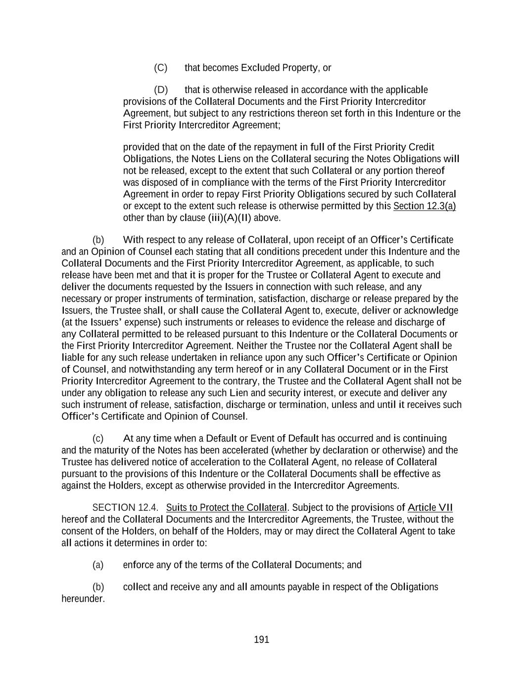 191 (C) that becomes Excluded Property, or (D) that is otherwise released in accordance with the applicable provisions of the Collateral Documents and the First Priority Intercreditor Agreement, but subject to any restrictions thereon set forth in this Indenture or the First Priority Intercreditor Agreement; provided that on the date of the repayment in full of the First Priority Credit Obligations, the Notes Liens on the Collateral securing the Notes Obligations will not be released, except to the extent that such Collateral or any portion thereof was disposed of in compliance with the terms of the First Priority Intercreditor Agreement in order to repay First Priority Obligations secured by such Collateral or except to the extent such release is otherwise permitted by this Section 12.3(a) other than by clause (iii)(A)(II) above. (b) With respect to any release of Collateral, upon receipt of an Officer’s Certificate and an Opinion of Counsel each stating that all conditions precedent under this Indenture and the Collateral Documents and the First Priority Intercreditor Agreement, as applicable, to such release have been met and that it is proper for the Trustee or Collateral Agent to execute and deliver the documents requested by the Issuers in connection with such release, and any necessary or proper instruments of termination, satisfaction, discharge or release prepared by the Issuers, the Trustee shall, or shall cause the Collateral Agent to, execute, deliver or acknowledge (at the Issuers’ expense) such instruments or releases to evidence the release and discharge of any Collateral permitted to be released pursuant to this Indenture or the Collateral Documents or the First Priority Intercreditor Agreement. Neither the Trustee nor the Collateral Agent shall be liable for any such release undertaken in reliance upon any such Officer’s Certificate or Opinion of Counsel, and notwithstanding any term hereof or in any Collateral Document or in the First Priority Intercreditor Agreement to the contrary, the Trustee and the Collateral Agent shall not be under any obligation to release any such Lien and security interest, or execute and deliver any such instrument of release, satisfaction, discharge or termination, unless and until it receives such Officer’s Certificate and Opinion of Counsel. (c) At any time when a Default or Event of Default has occurred and is continuing and the maturity of the Notes has been accelerated (whether by declaration or otherwise) and the Trustee has delivered notice of acceleration to the Collateral Agent, no release of Collateral pursuant to the provisions of this Indenture or the Collateral Documents shall be effective as against the Holders, except as otherwise provided in the Intercreditor Agreements. SECTION 12.4. Suits to Protect the Collateral. Subject to the provisions of Article VII hereof and the Collateral Documents and the Intercreditor Agreements, the Trustee, without the consent of the Holders, on behalf of the Holders, may or may direct the Collateral Agent to take all actions it determines in order to: (a) enforce any of the terms of the Collateral Documents; and (b) collect and receive any and all amounts payable in respect of the Obligations hereunder.