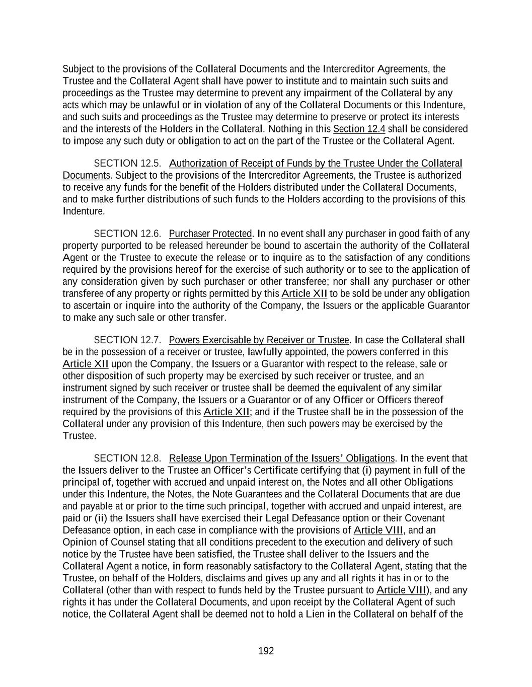 192 Subject to the provisions of the Collateral Documents and the Intercreditor Agreements, the Trustee and the Collateral Agent shall have power to institute and to maintain such suits and proceedings as the Trustee may determine to prevent any impairment of the Collateral by any acts which may be unlawful or in violation of any of the Collateral Documents or this Indenture, and such suits and proceedings as the Trustee may determine to preserve or protect its interests and the interests of the Holders in the Collateral. Nothing in this Section 12.4 shall be considered to impose any such duty or obligation to act on the part of the Trustee or the Collateral Agent. SECTION 12.5. Authorization of Receipt of Funds by the Trustee Under the Collateral Documents. Subject to the provisions of the Intercreditor Agreements, the Trustee is authorized to receive any funds for the benefit of the Holders distributed under the Collateral Documents, and to make further distributions of such funds to the Holders according to the provisions of this Indenture. SECTION 12.6. Purchaser Protected. In no event shall any purchaser in good faith of any property purported to be released hereunder be bound to ascertain the authority of the Collateral Agent or the Trustee to execute the release or to inquire as to the satisfaction of any conditions required by the provisions hereof for the exercise of such authority or to see to the application of any consideration given by such purchaser or other transferee; nor shall any purchaser or other transferee of any property or rights permitted by this Article XII to be sold be under any obligation to ascertain or inquire into the authority of the Company, the Issuers or the applicable Guarantor to make any such sale or other transfer. SECTION 12.7. Powers Exercisable by Receiver or Trustee. In case the Collateral shall be in the possession of a receiver or trustee, lawfully appointed, the powers conferred in this Article XII upon the Company, the Issuers or a Guarantor with respect to the release, sale or other disposition of such property may be exercised by such receiver or trustee, and an instrument signed by such receiver or trustee shall be deemed the equivalent of any similar instrument of the Company, the Issuers or a Guarantor or of any Officer or Officers thereof required by the provisions of this Article XII; and if the Trustee shall be in the possession of the Collateral under any provision of this Indenture, then such powers may be exercised by the Trustee. SECTION 12.8. Release Upon Termination of the Issuers’ Obligations. In the event that the Issuers deliver to the Trustee an Officer’s Certificate certifying that (i) payment in full of the principal of, together with accrued and unpaid interest on, the Notes and all other Obligations under this Indenture, the Notes, the Note Guarantees and the Collateral Documents that are due and payable at or prior to the time such principal, together with accrued and unpaid interest, are paid or (ii) the Issuers shall have exercised their Legal Defeasance option or their Covenant Defeasance option, in each case in compliance with the provisions of Article VIII, and an Opinion of Counsel stating that all conditions precedent to the execution and delivery of such notice by the Trustee have been satisfied, the Trustee shall deliver to the Issuers and the Collateral Agent a notice, in form reasonably satisfactory to the Collateral Agent, stating that the Trustee, on behalf of the Holders, disclaims and gives up any and all rights it has in or to the Collateral (other than with respect to funds held by the Trustee pursuant to Article VIII), and any rights it has under the Collateral Documents, and upon receipt by the Collateral Agent of such notice, the Collateral Agent shall be deemed not to hold a Lien in the Collateral on behalf of the