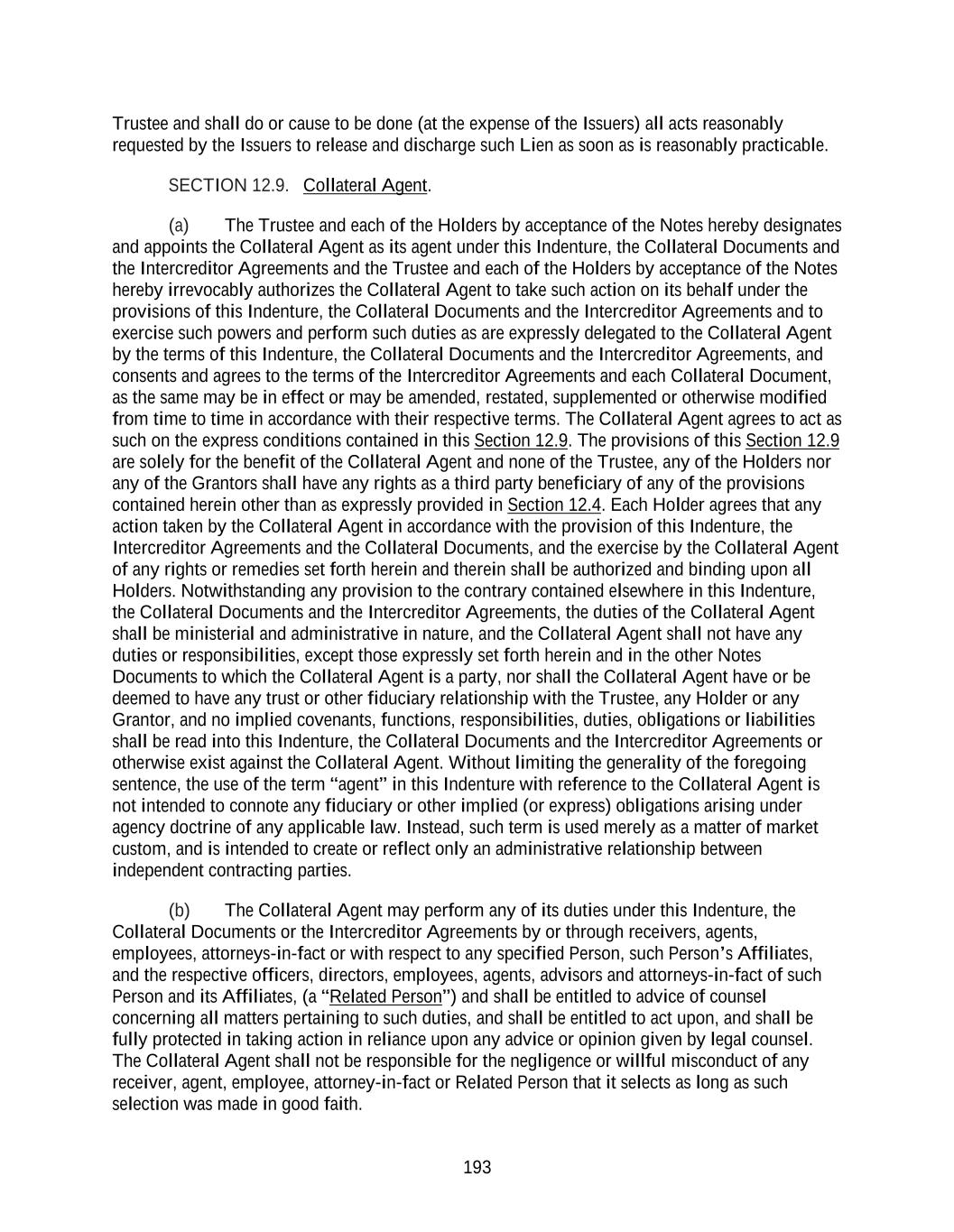 193 Trustee and shall do or cause to be done (at the expense of the Issuers) all acts reasonably requested by the Issuers to release and discharge such Lien as soon as is reasonably practicable. SECTION 12.9. Collateral Agent. (a) The Trustee and each of the Holders by acceptance of the Notes hereby designates and appoints the Collateral Agent as its agent under this Indenture, the Collateral Documents and the Intercreditor Agreements and the Trustee and each of the Holders by acceptance of the Notes hereby irrevocably authorizes the Collateral Agent to take such action on its behalf under the provisions of this Indenture, the Collateral Documents and the Intercreditor Agreements and to exercise such powers and perform such duties as are expressly delegated to the Collateral Agent by the terms of this Indenture, the Collateral Documents and the Intercreditor Agreements, and consents and agrees to the terms of the Intercreditor Agreements and each Collateral Document, as the same may be in effect or may be amended, restated, supplemented or otherwise modified from time to time in accordance with their respective terms. The Collateral Agent agrees to act as such on the express conditions contained in this Section 12.9. The provisions of this Section 12.9 are solely for the benefit of the Collateral Agent and none of the Trustee, any of the Holders nor any of the Grantors shall have any rights as a third party beneficiary of any of the provisions contained herein other than as expressly provided in Section 12.4. Each Holder agrees that any action taken by the Collateral Agent in accordance with the provision of this Indenture, the Intercreditor Agreements and the Collateral Documents, and the exercise by the Collateral Agent of any rights or remedies set forth herein and therein shall be authorized and binding upon all Holders. Notwithstanding any provision to the contrary contained elsewhere in this Indenture, the Collateral Documents and the Intercreditor Agreements, the duties of the Collateral Agent shall be ministerial and administrative in nature, and the Collateral Agent shall not have any duties or responsibilities, except those expressly set forth herein and in the other Notes Documents to which the Collateral Agent is a party, nor shall the Collateral Agent have or be deemed to have any trust or other fiduciary relationship with the Trustee, any Holder or any Grantor, and no implied covenants, functions, responsibilities, duties, obligations or liabilities shall be read into this Indenture, the Collateral Documents and the Intercreditor Agreements or otherwise exist against the Collateral Agent. Without limiting the generality of the foregoing sentence, the use of the term “agent” in this Indenture with reference to the Collateral Agent is not intended to connote any fiduciary or other implied (or express) obligations arising under agency doctrine of any applicable law. Instead, such term is used merely as a matter of market custom, and is intended to create or reflect only an administrative relationship between independent contracting parties. (b) The Collateral Agent may perform any of its duties under this Indenture, the Collateral Documents or the Intercreditor Agreements by or through receivers, agents, employees, attorneys-in-fact or with respect to any specified Person, such Person’s Affiliates, and the respective officers, directors, employees, agents, advisors and attorneys-in-fact of such Person and its Affiliates, (a “Related Person”) and shall be entitled to advice of counsel concerning all matters pertaining to such duties, and shall be entitled to act upon, and shall be fully protected in taking action in reliance upon any advice or opinion given by legal counsel. The Collateral Agent shall not be responsible for the negligence or willful misconduct of any receiver, agent, employee, attorney-in-fact or Related Person that it selects as long as such selection was made in good faith.