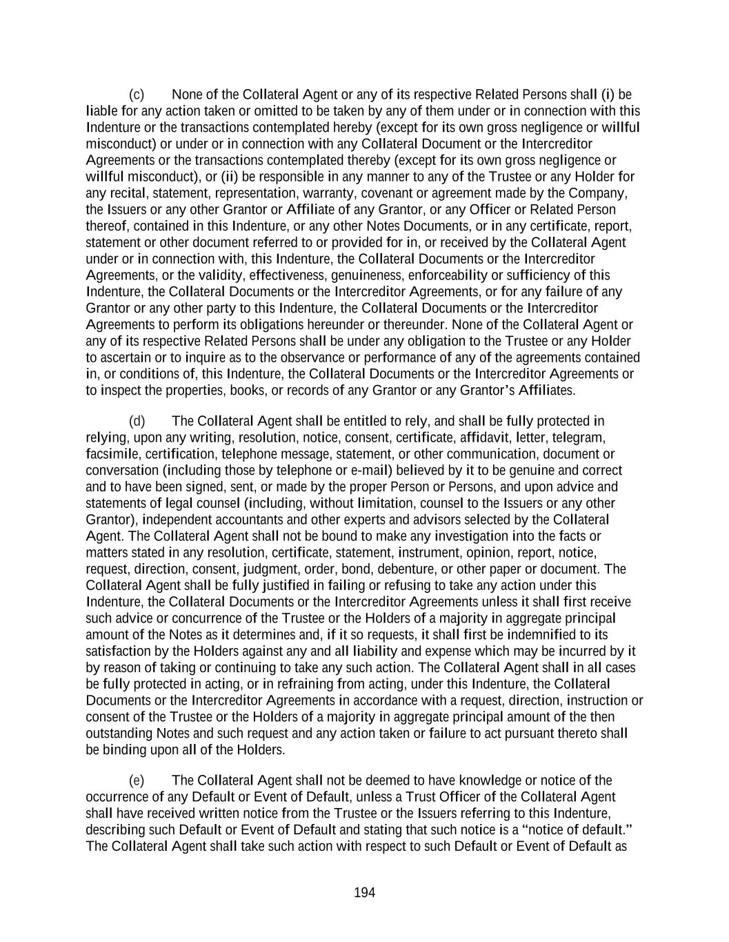 194 (c) None of the Collateral Agent or any of its respective Related Persons shall (i) be liable for any action taken or omitted to be taken by any of them under or in connection with this Indenture or the transactions contemplated hereby (except for its own gross negligence or willful misconduct) or under or in connection with any Collateral Document or the Intercreditor Agreements or the transactions contemplated thereby (except for its own gross negligence or willful misconduct), or (ii) be responsible in any manner to any of the Trustee or any Holder for any recital, statement, representation, warranty, covenant or agreement made by the Company, the Issuers or any other Grantor or Affiliate of any Grantor, or any Officer or Related Person thereof, contained in this Indenture, or any other Notes Documents, or in any certificate, report, statement or other document referred to or provided for in, or received by the Collateral Agent under or in connection with, this Indenture, the Collateral Documents or the Intercreditor Agreements, or the validity, effectiveness, genuineness, enforceability or sufficiency of this Indenture, the Collateral Documents or the Intercreditor Agreements, or for any failure of any Grantor or any other party to this Indenture, the Collateral Documents or the Intercreditor Agreements to perform its obligations hereunder or thereunder. None of the Collateral Agent or any of its respective Related Persons shall be under any obligation to the Trustee or any Holder to ascertain or to inquire as to the observance or performance of any of the agreements contained in, or conditions of, this Indenture, the Collateral Documents or the Intercreditor Agreements or to inspect the properties, books, or records of any Grantor or any Grantor’s Affiliates. (d) The Collateral Agent shall be entitled to rely, and shall be fully protected in relying, upon any writing, resolution, notice, consent, certificate, affidavit, letter, telegram, facsimile, certification, telephone message, statement, or other communication, document or conversation (including those by telephone or e-mail) believed by it to be genuine and correct and to have been signed, sent, or made by the proper Person or Persons, and upon advice and statements of legal counsel (including, without limitation, counsel to the Issuers or any other Grantor), independent accountants and other experts and advisors selected by the Collateral Agent. The Collateral Agent shall not be bound to make any investigation into the facts or matters stated in any resolution, certificate, statement, instrument, opinion, report, notice, request, direction, consent, judgment, order, bond, debenture, or other paper or document. The Collateral Agent shall be fully justified in failing or refusing to take any action under this Indenture, the Collateral Documents or the Intercreditor Agreements unless it shall first receive such advice or concurrence of the Trustee or the Holders of a majority in aggregate principal amount of the Notes as it determines and, if it so requests, it shall first be indemnified to its satisfaction by the Holders against any and all liability and expense which may be incurred by it by reason of taking or continuing to take any such action. The Collateral Agent shall in all cases be fully protected in acting, or in refraining from acting, under this Indenture, the Collateral Documents or the Intercreditor Agreements in accordance with a request, direction, instruction or consent of the Trustee or the Holders of a majority in aggregate principal amount of the then outstanding Notes and such request and any action taken or failure to act pursuant thereto shall be binding upon all of the Holders. (e) The Collateral Agent shall not be deemed to have knowledge or notice of the occurrence of any Default or Event of Default, unless a Trust Officer of the Collateral Agent shall have received written notice from the Trustee or the Issuers referring to this Indenture, describing such Default or Event of Default and stating that such notice is a “notice of default.” The Collateral Agent shall take such action with respect to such Default or Event of Default as